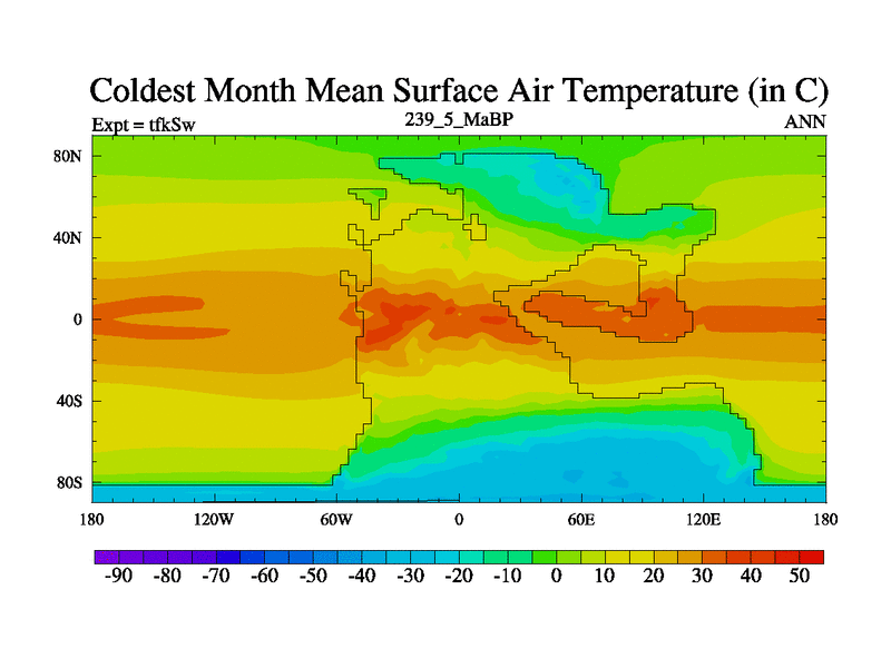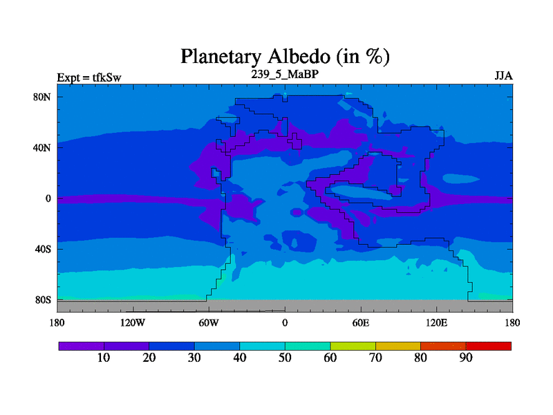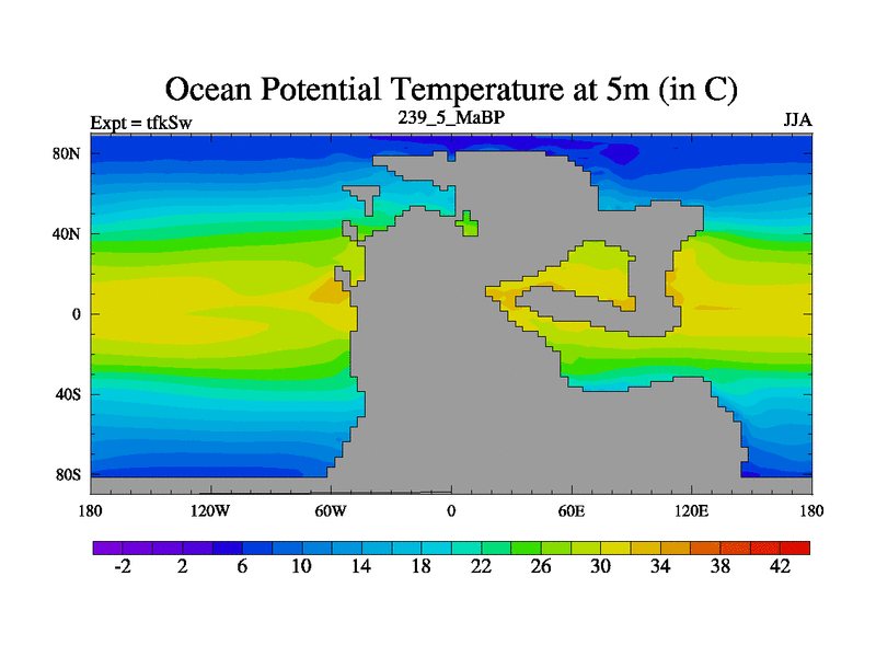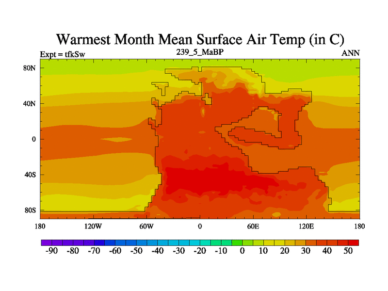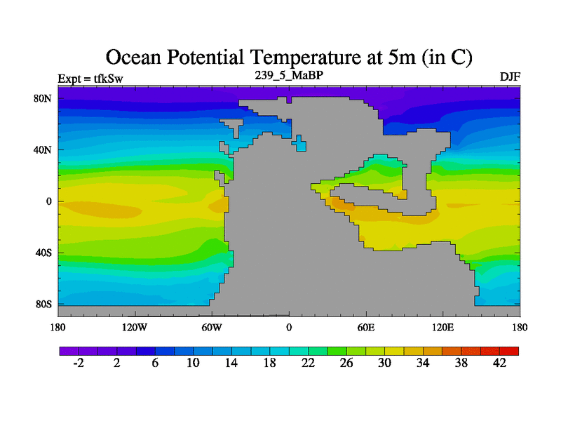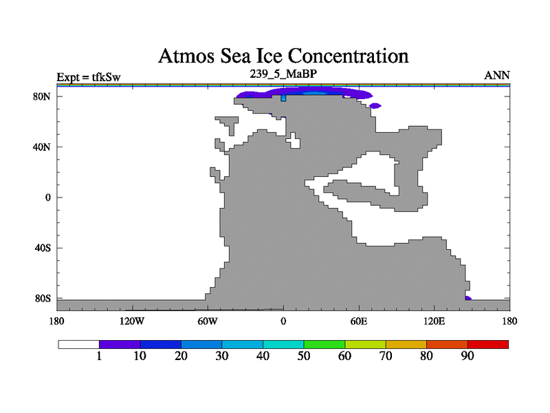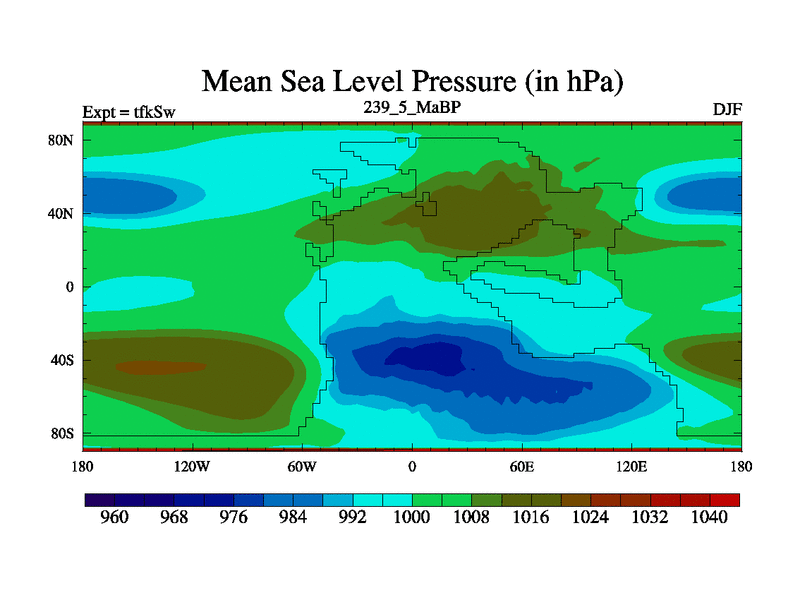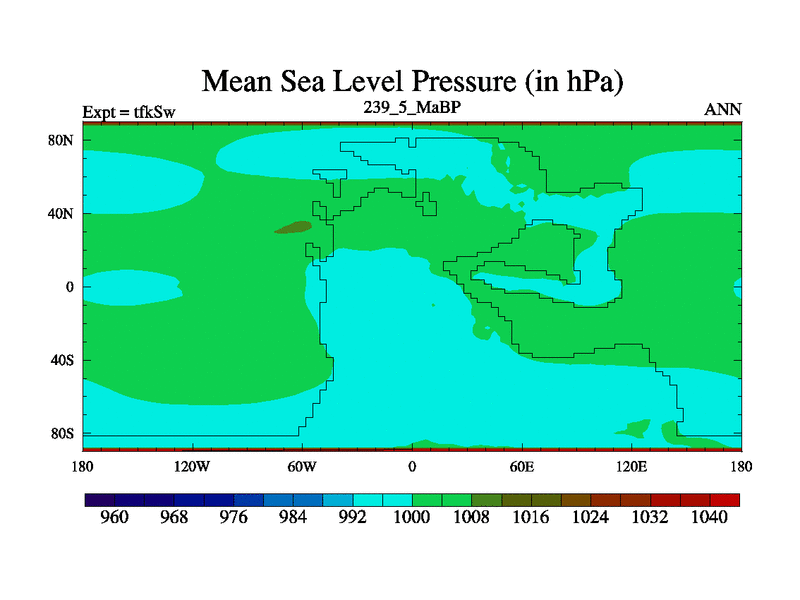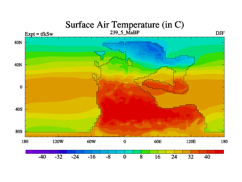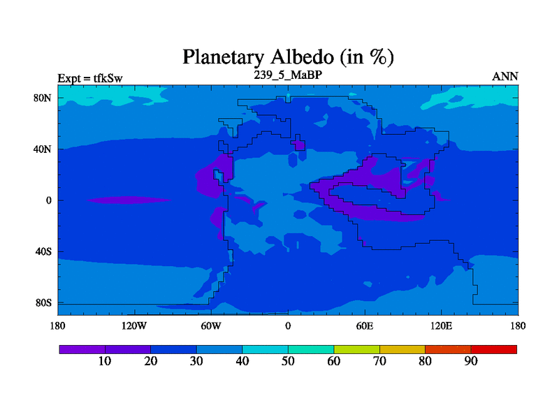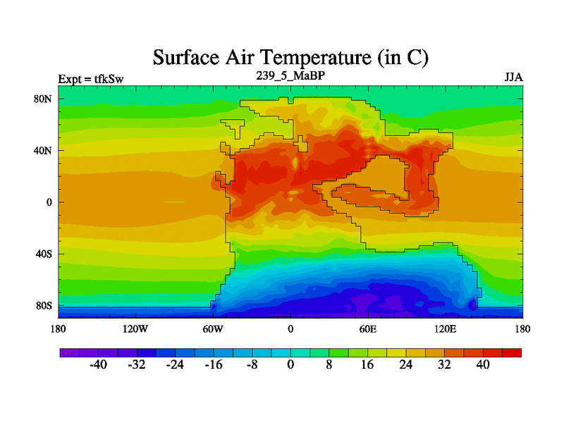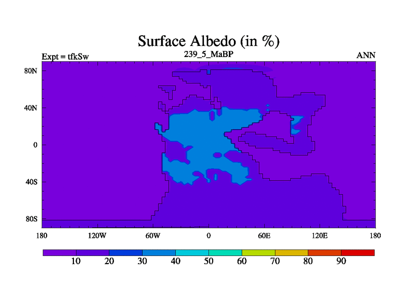 This is the 239.5 Ma simulation using the Scotese palaeogeographies and revised CCN etc. This version has islands and smoothing and desert albedo included. Tuned CO2 to give Scotese temperatures. Started from end of tfkEw.