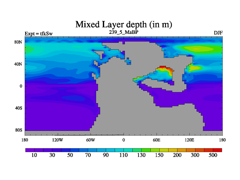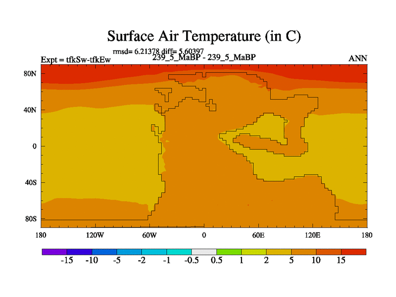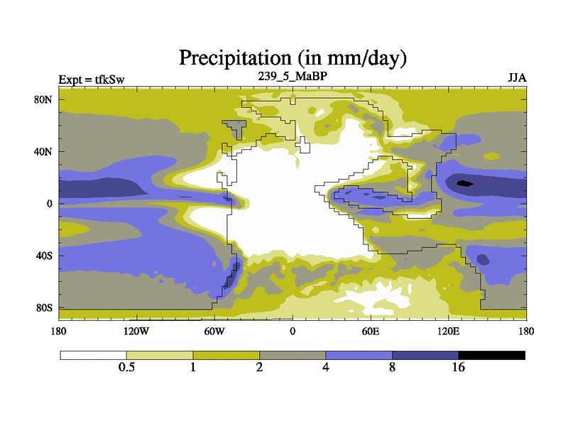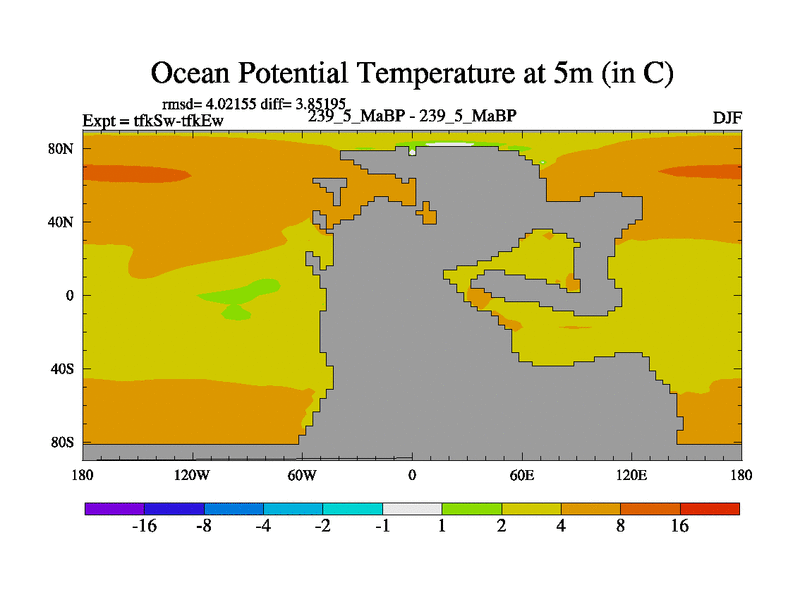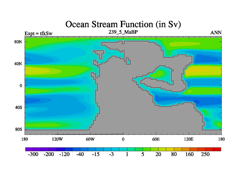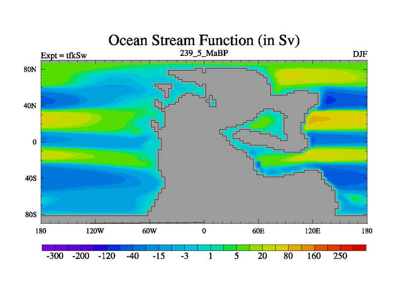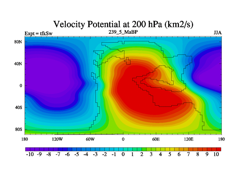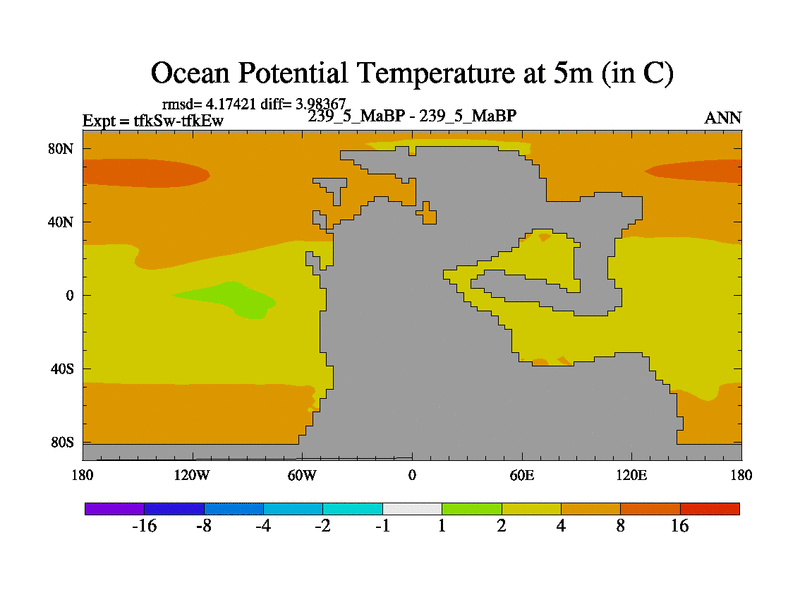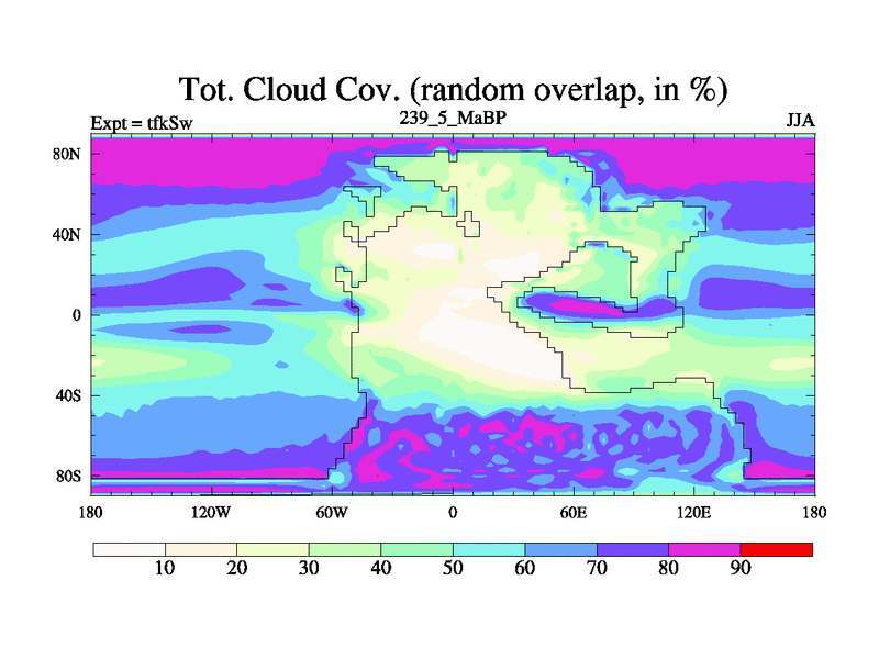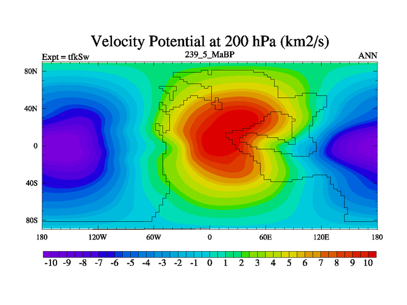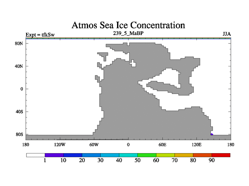 This is the 239.5 Ma simulation using the Scotese palaeogeographies and revised CCN etc. This version has islands and smoothing and desert albedo included. Tuned CO2 to give Scotese temperatures. Started from end of tfkEw.