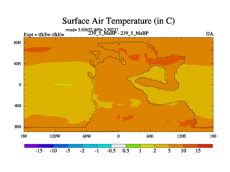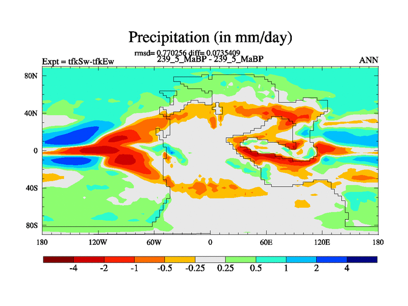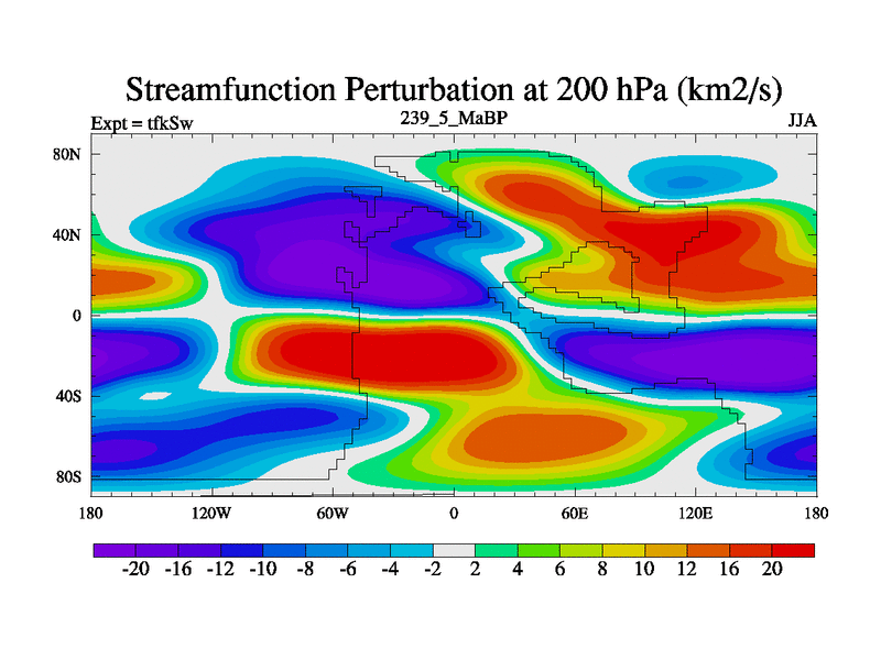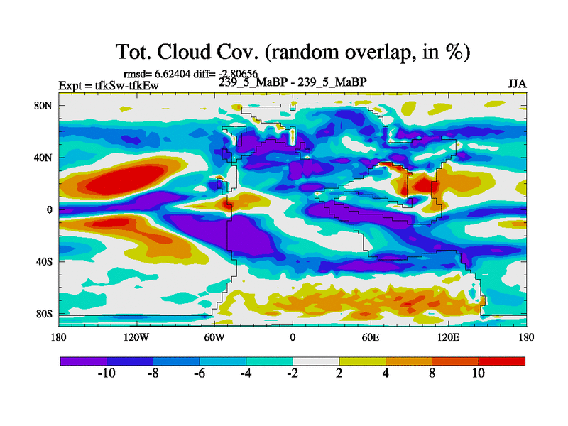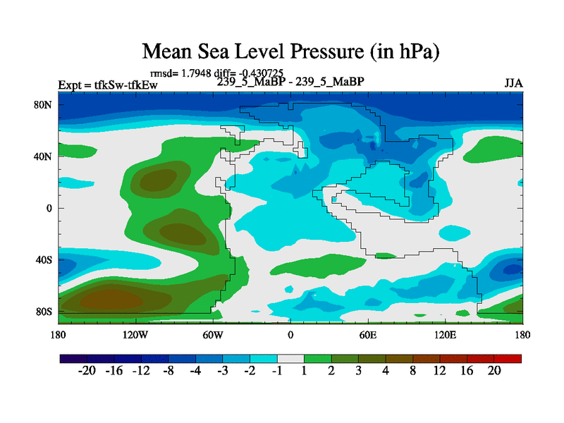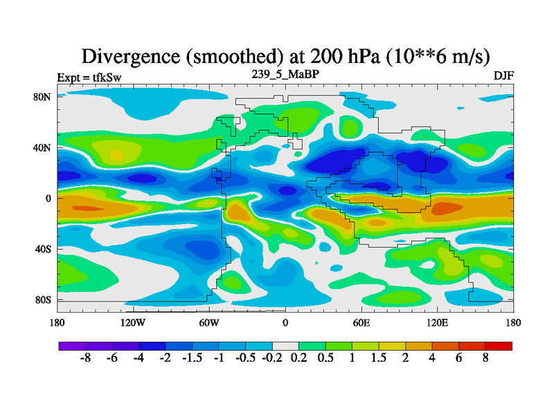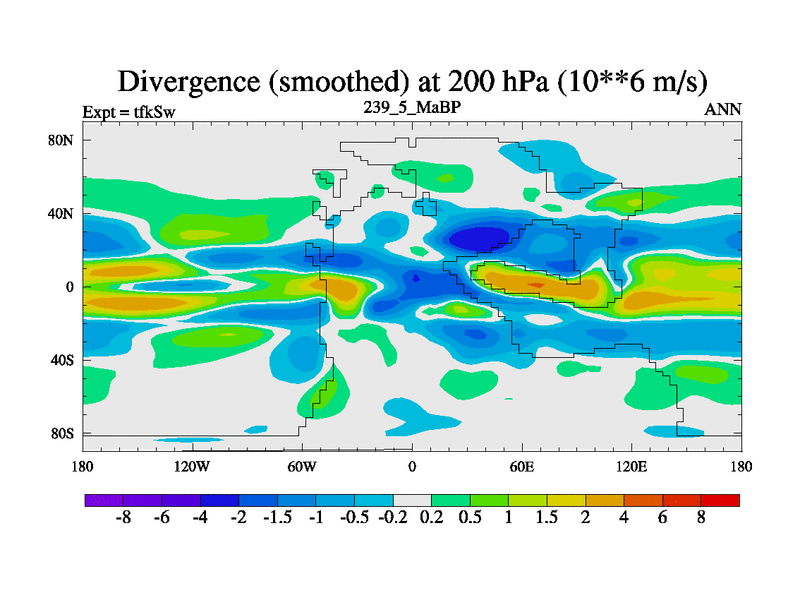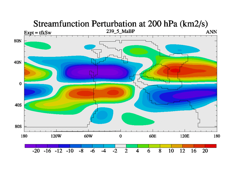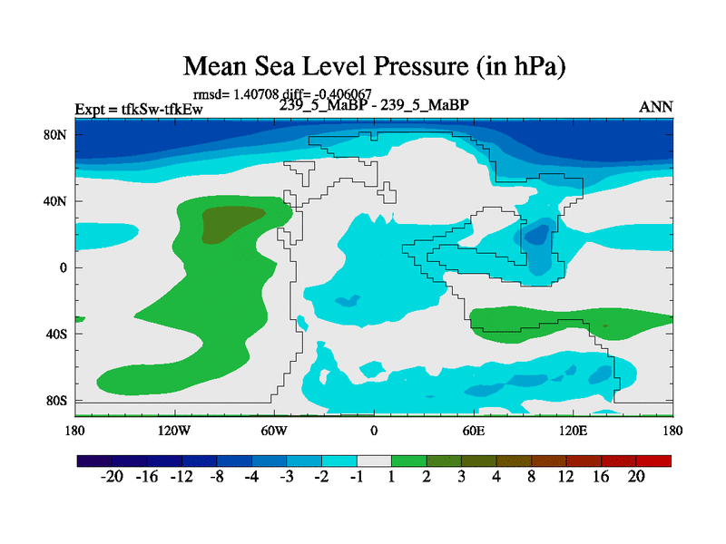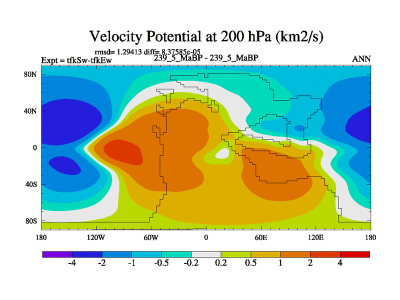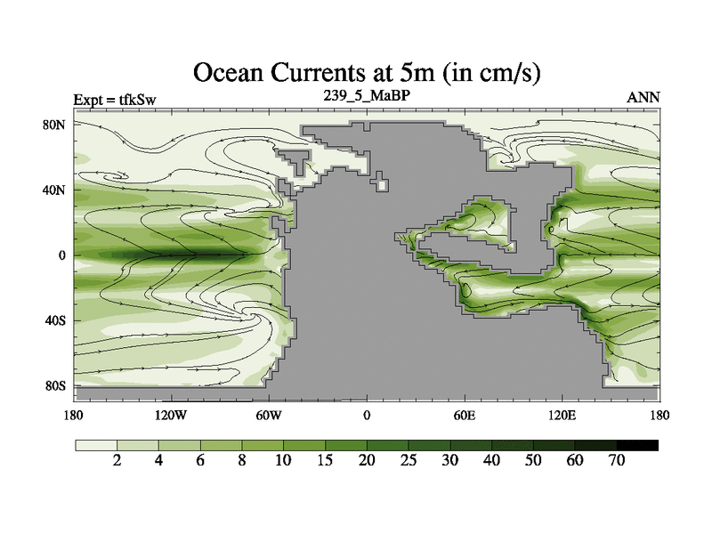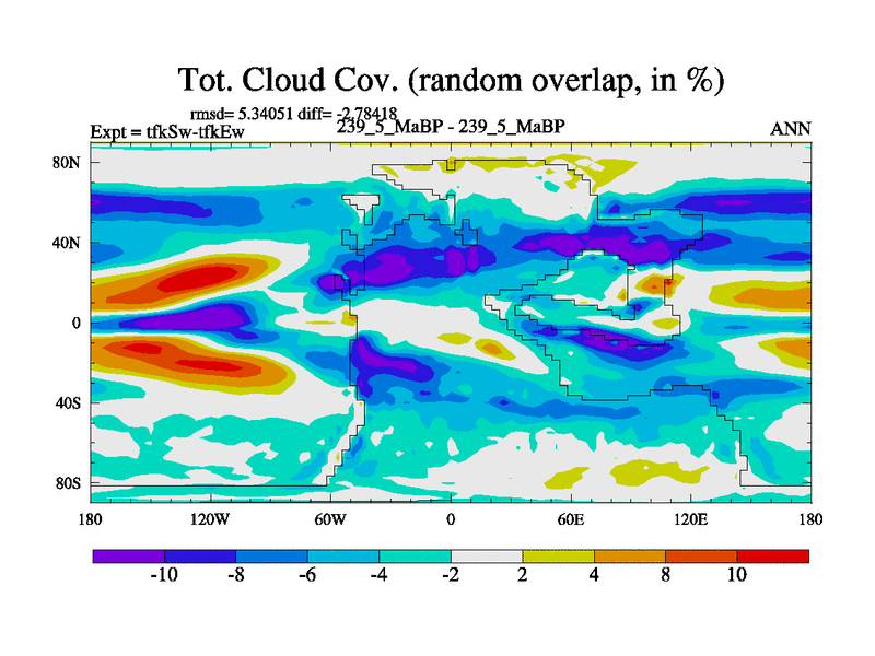 This is the 239.5 Ma simulation using the Scotese palaeogeographies and revised CCN etc. This version has islands and smoothing and desert albedo included. Tuned CO2 to give Scotese temperatures. Started from end of tfkEw.