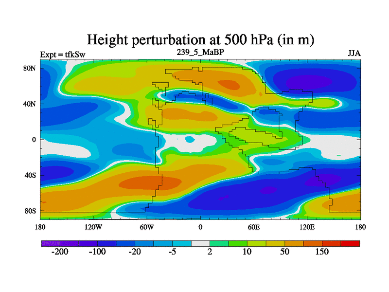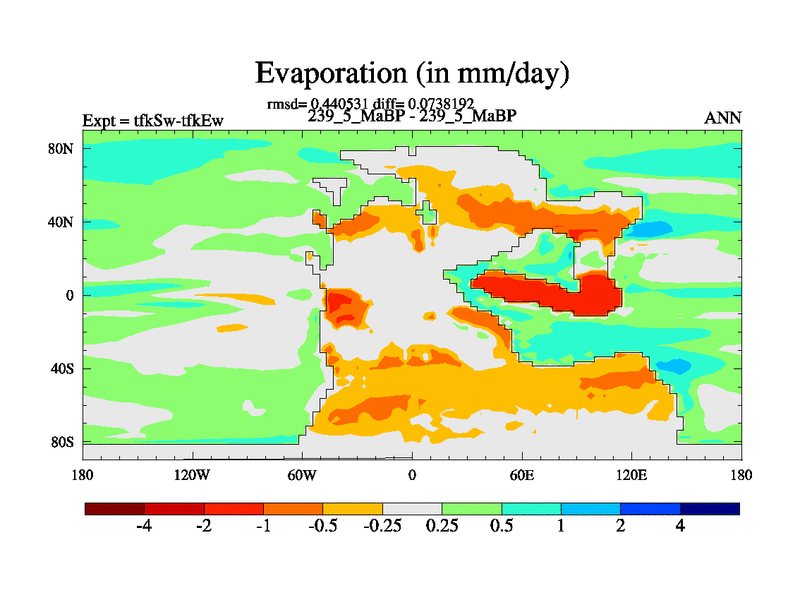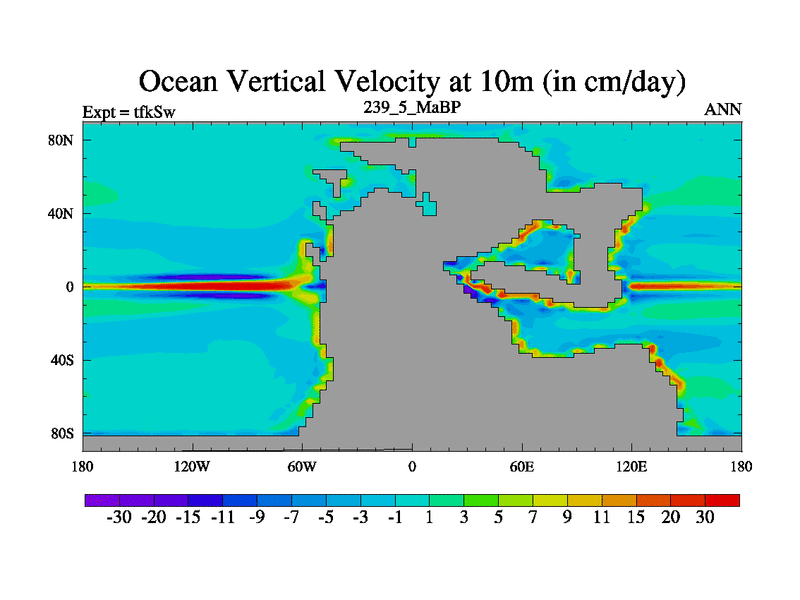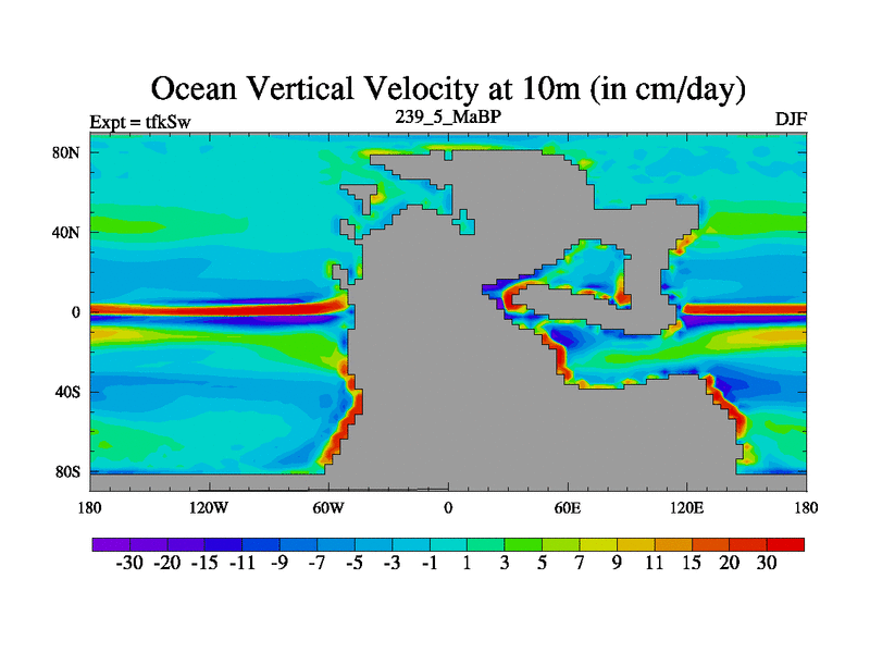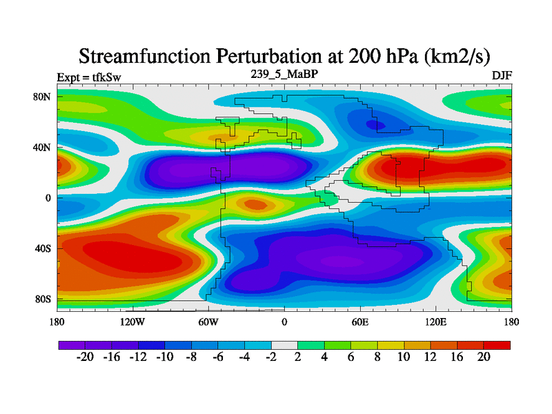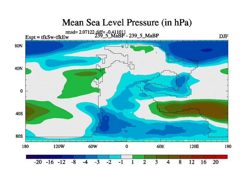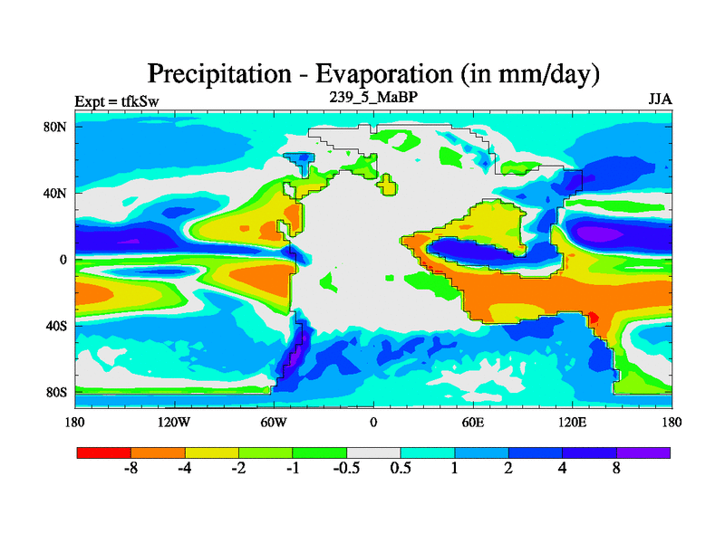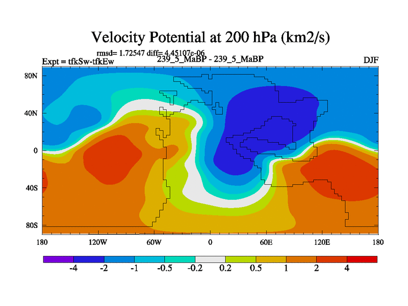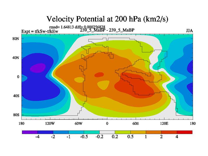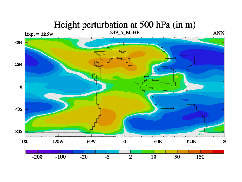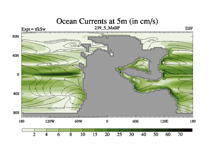 This is the 239.5 Ma simulation using the Scotese palaeogeographies and revised CCN etc. This version has islands and smoothing and desert albedo included. Tuned CO2 to give Scotese temperatures. Started from end of tfkEw.