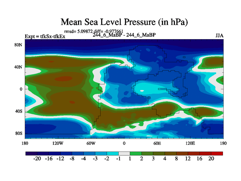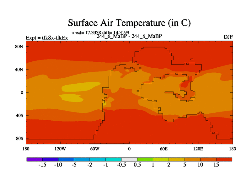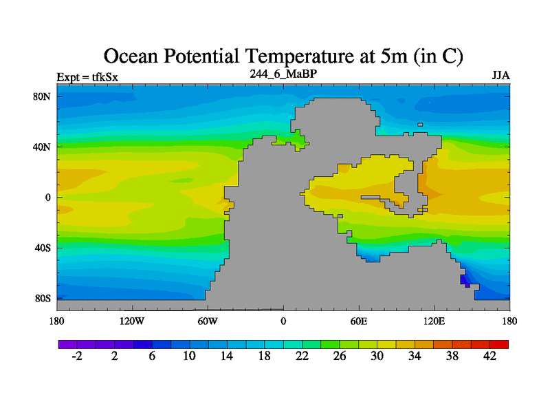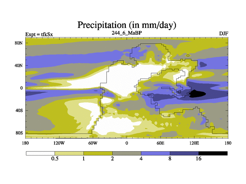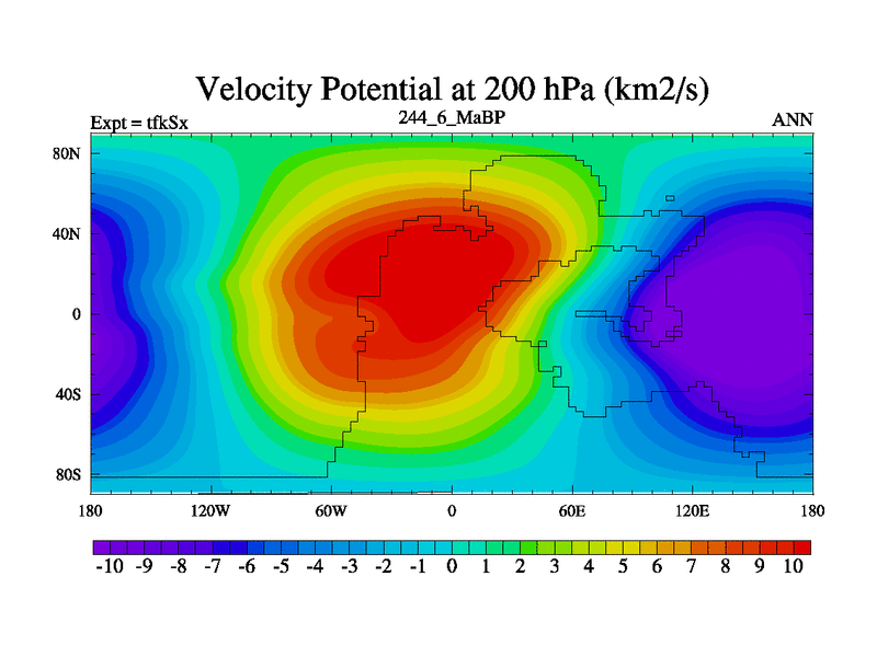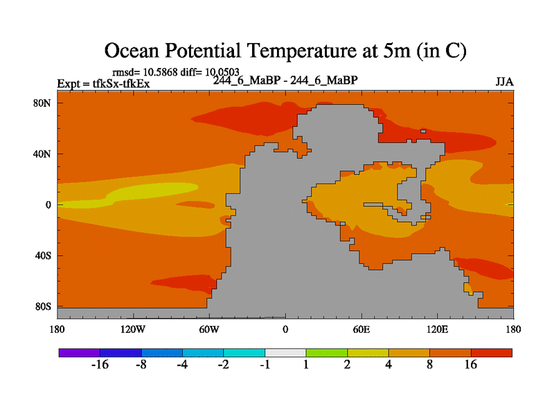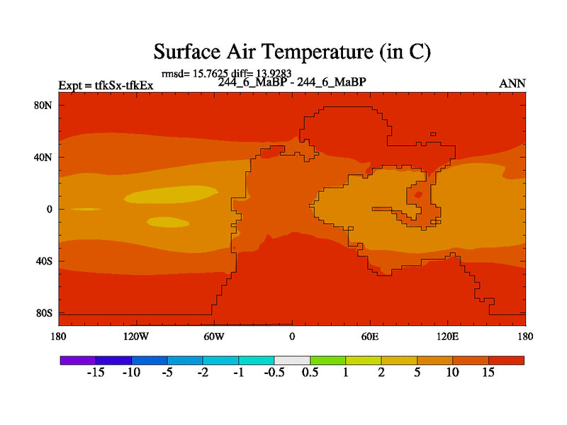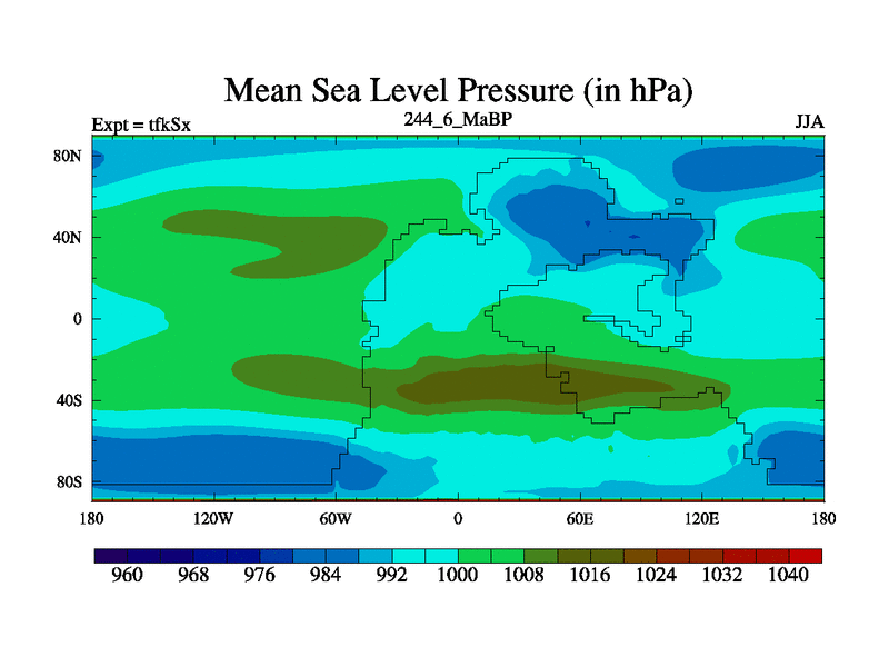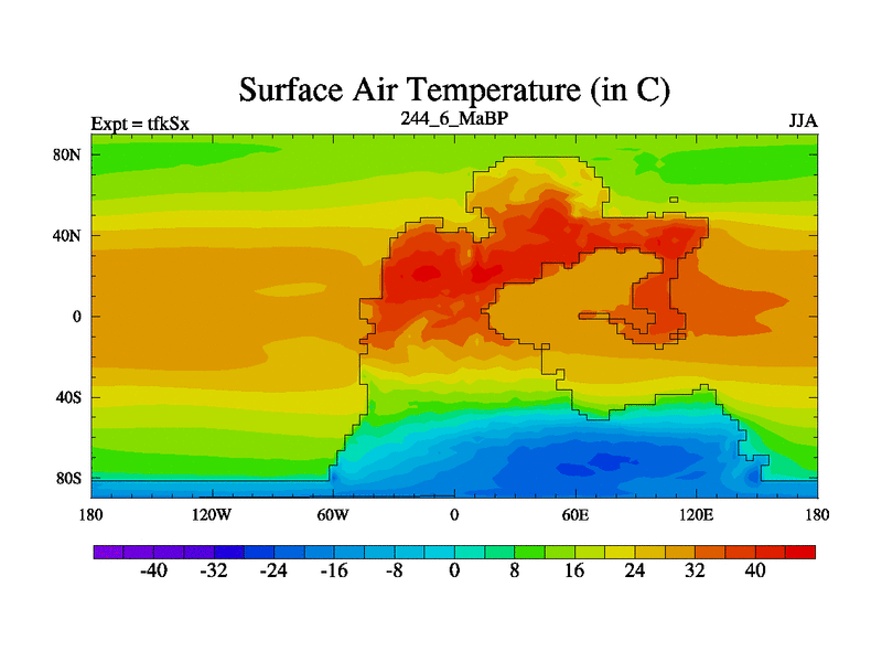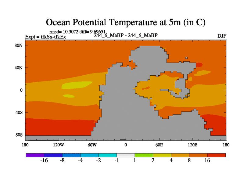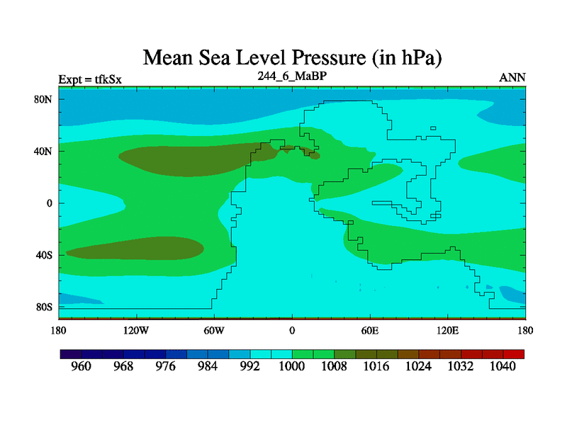 This is the 244.6 Ma simulation using the Scotese palaeogeographies and revised CCN etc. This version has islands and smoothing and desert albedo included. Tuned CO2 to give Scotese temperatures. Started from end of tfkEx.
