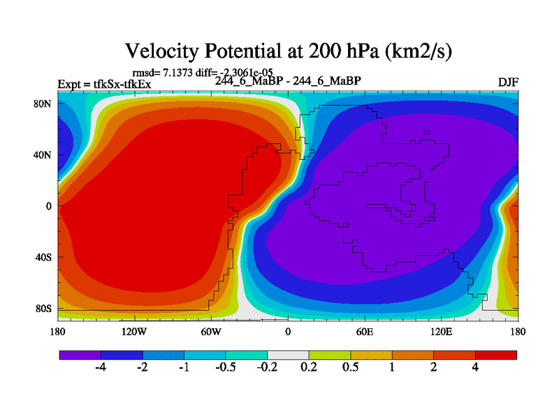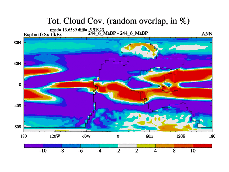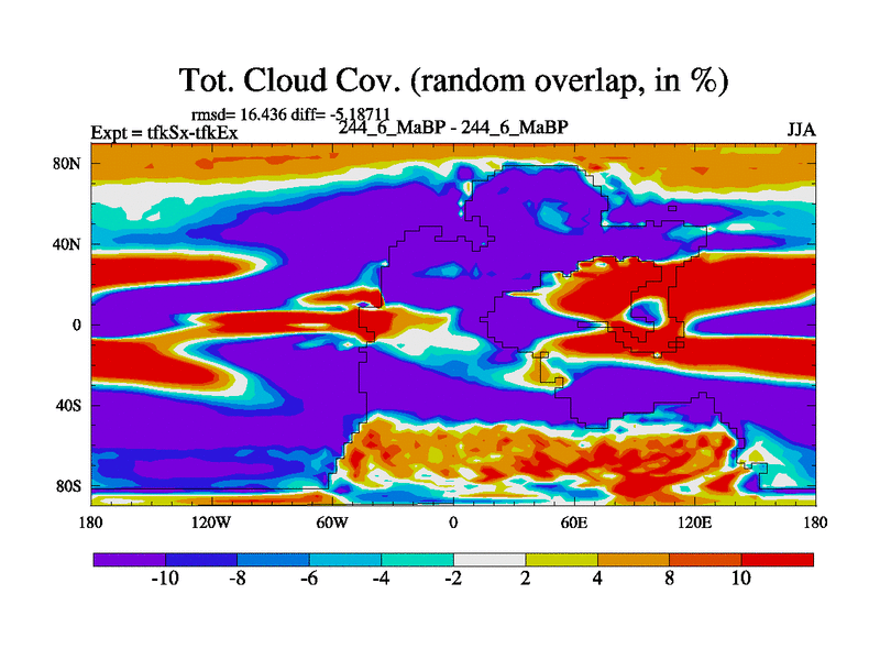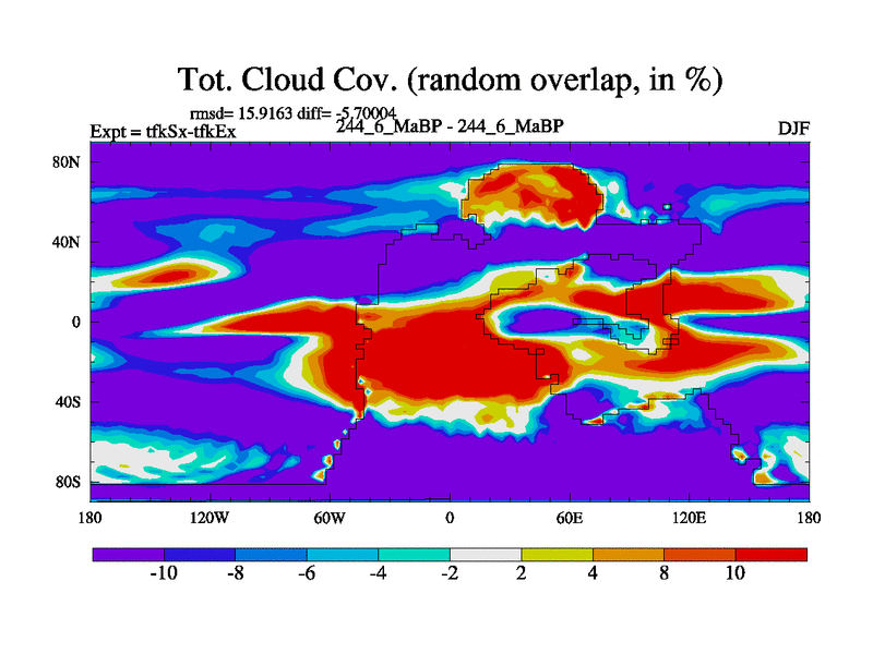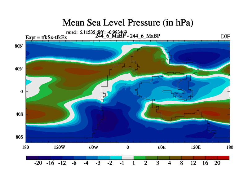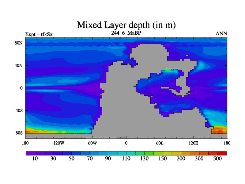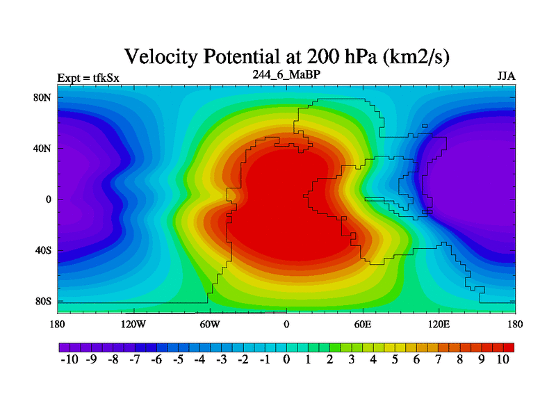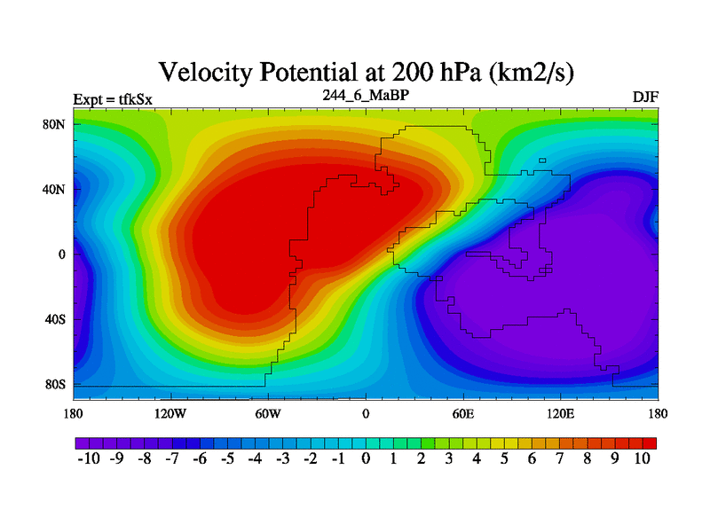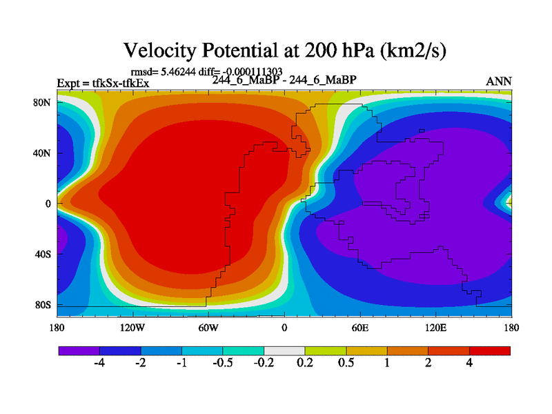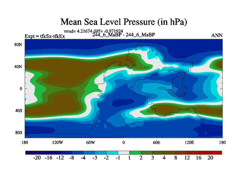 This is the 244.6 Ma simulation using the Scotese palaeogeographies and revised CCN etc. This version has islands and smoothing and desert albedo included. Tuned CO2 to give Scotese temperatures. Started from end of tfkEx.