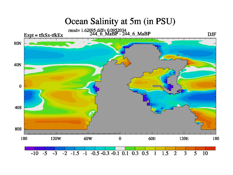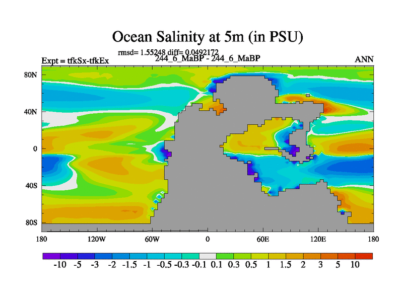 Scientifically as benchmark except using water age update, dark respiration, salinity conservation and revised ozone. Also using new orbital and solar update, and outputting leaf CO2. This version has islands included and atmospheric smoothing and desert albedo. Tuned CO2 to give Scotese temperatures. Started from end of tfkEx.