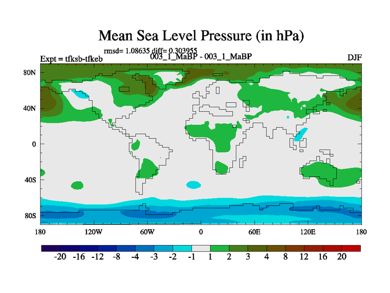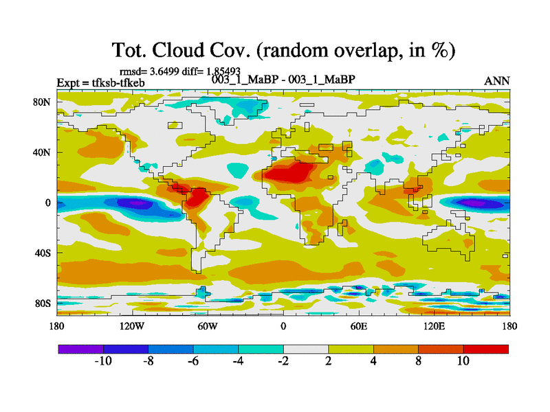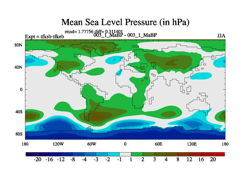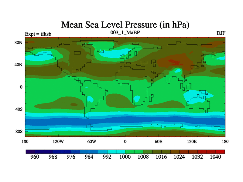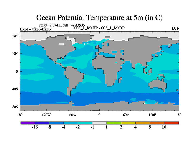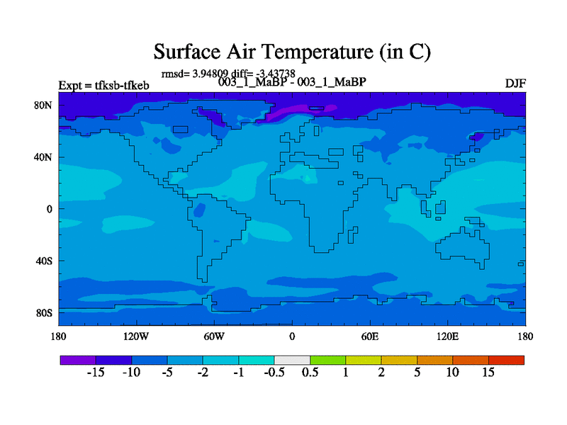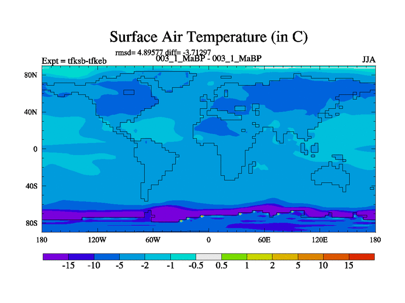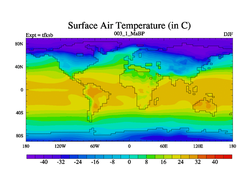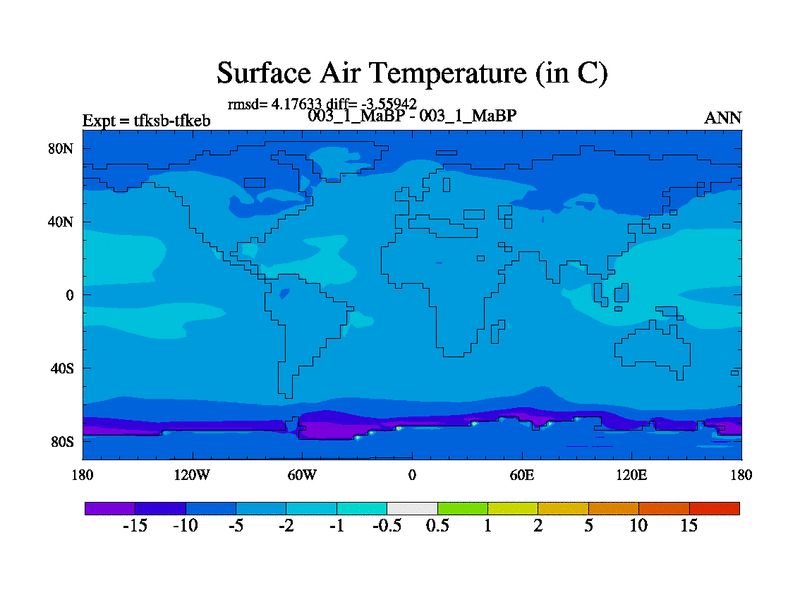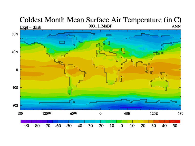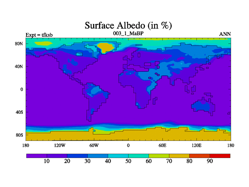 Scientifically as benchmark except using water age update, dark respiration, salinity conservation and revised ozone. Also using new orbital and solar update, and outputting leaf CO2. This version has islands included and atmospheric smoothing and desert albedo. Tuned CO2 to give Scotese temperatures. Started from end of tfkeb.