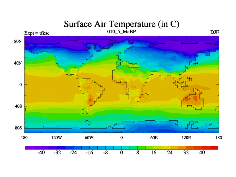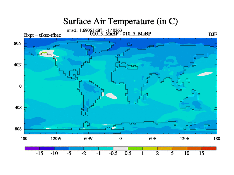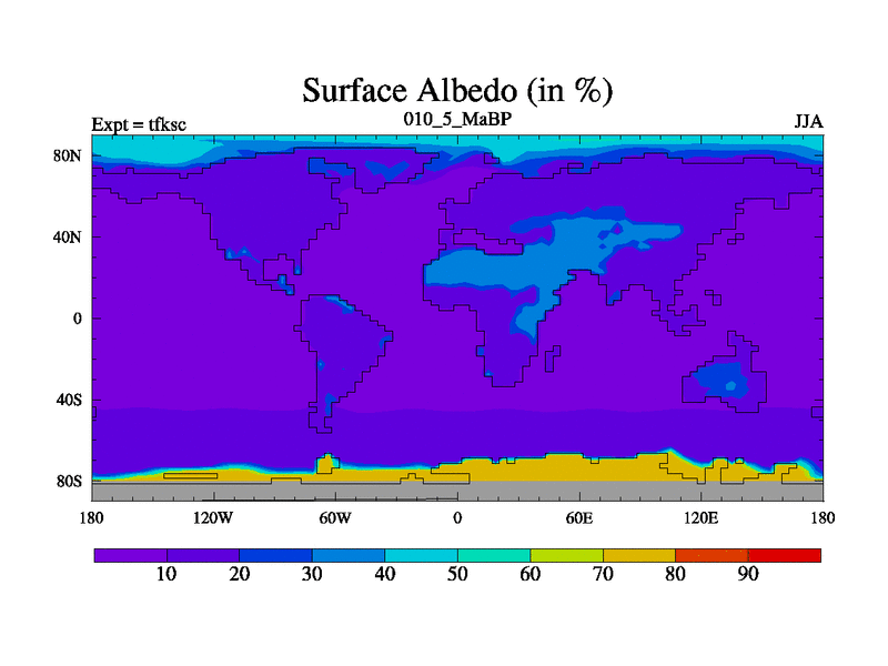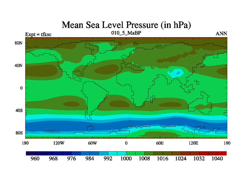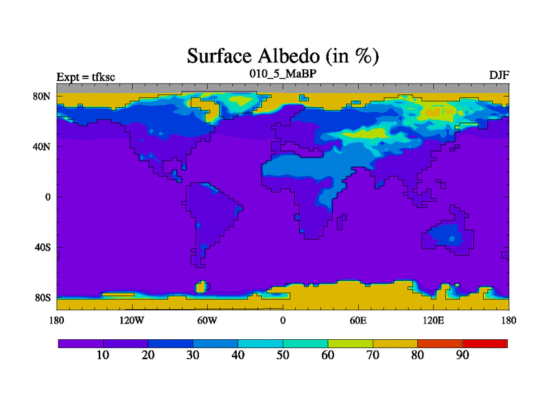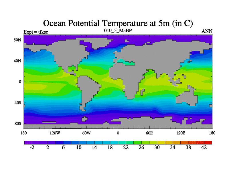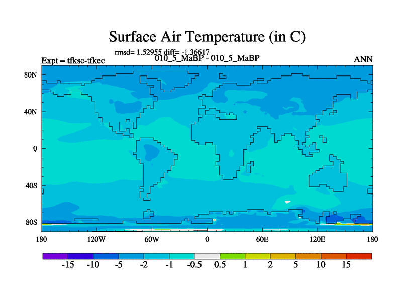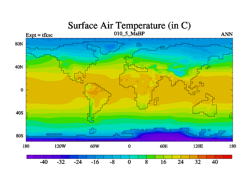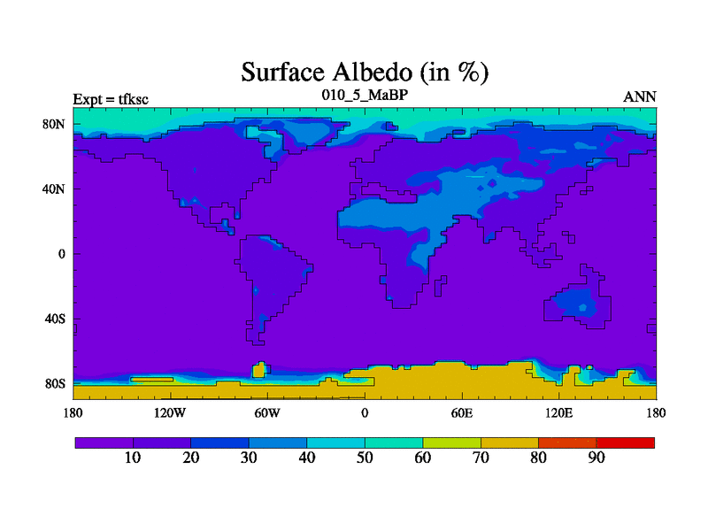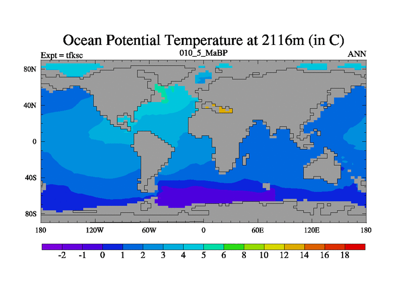 Scientifically as benchmark except using water age update, dark respiration, salinity conservation and revised ozone. Also using new orbital and solar update, and outputting leaf CO2. This version has islands included and atmospheric smoothing and desert albedo. Tuned CO2 to give Scotese temperatures. Started from end of tfkec.