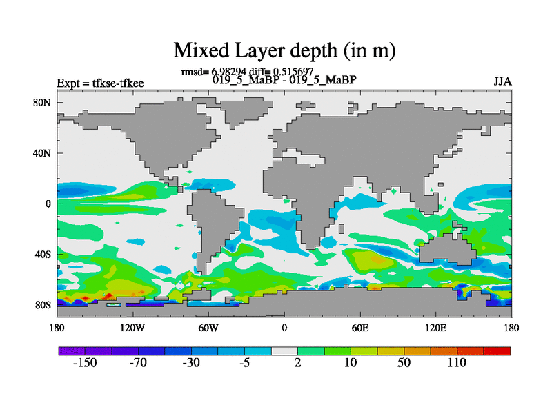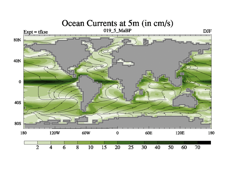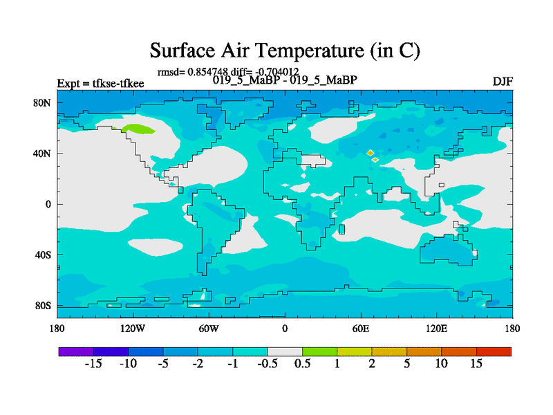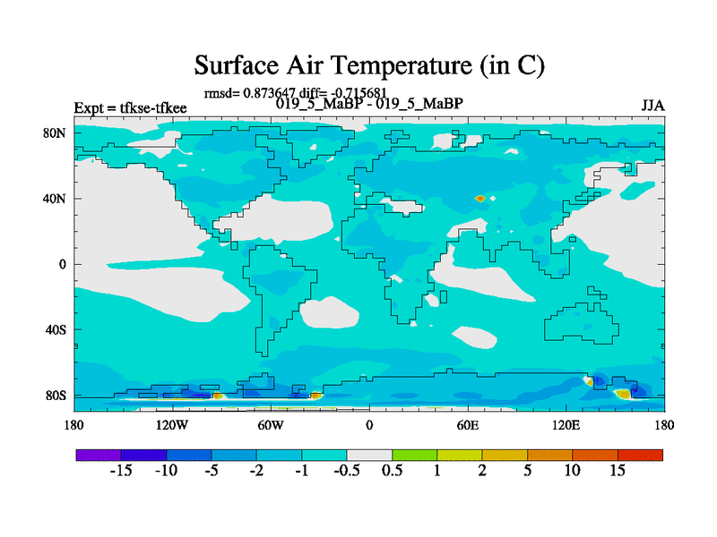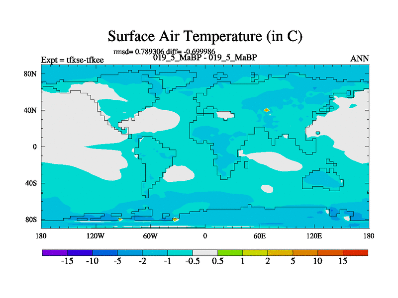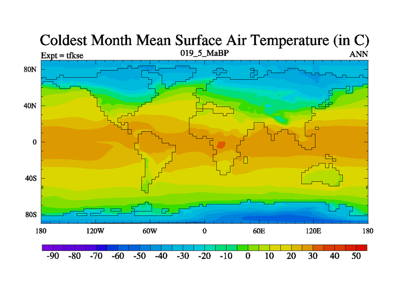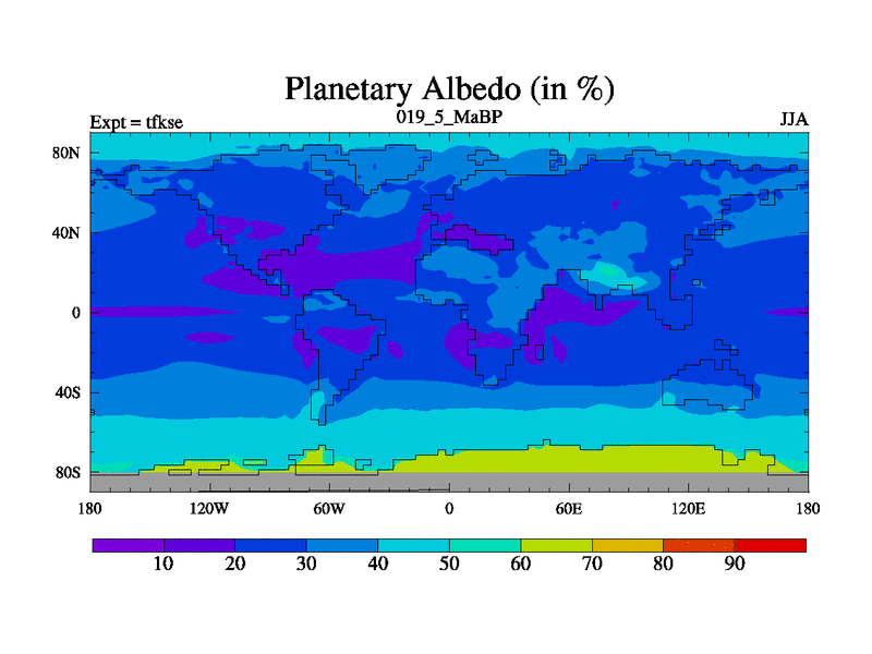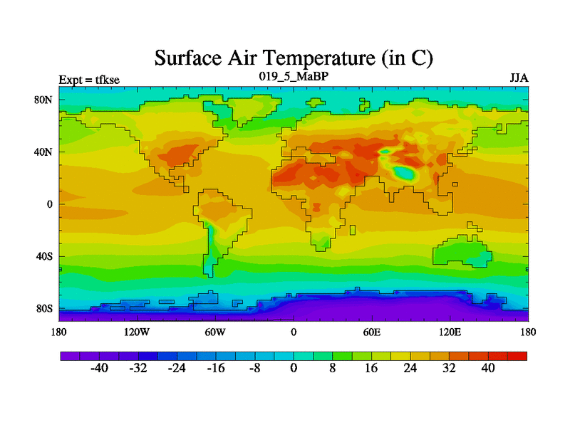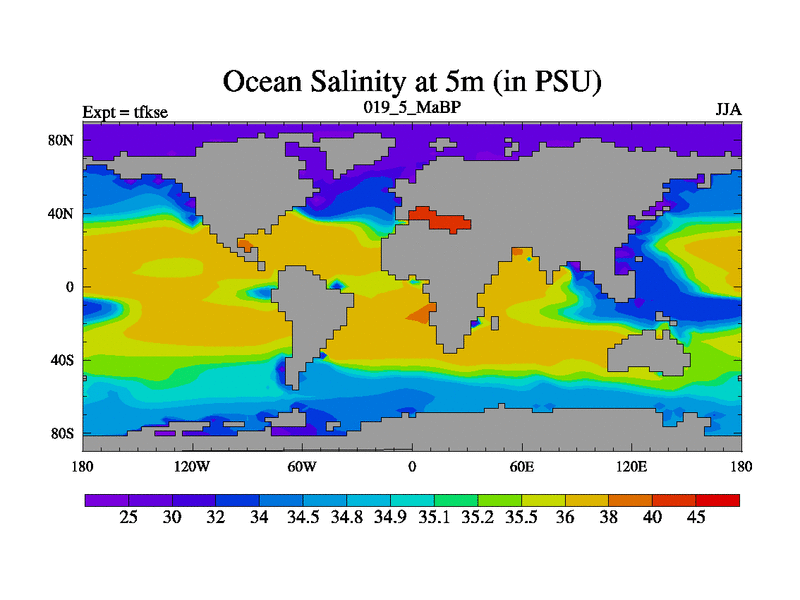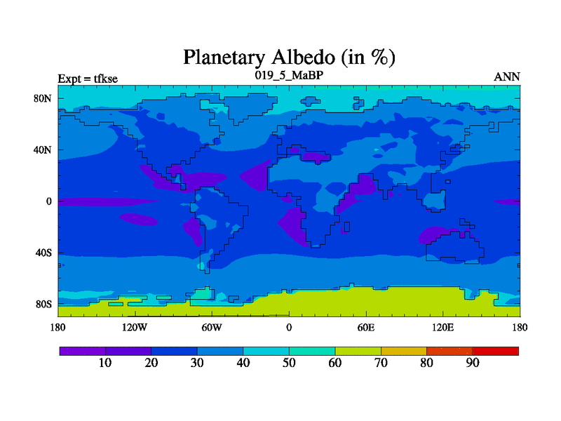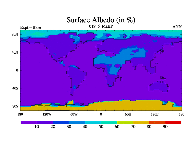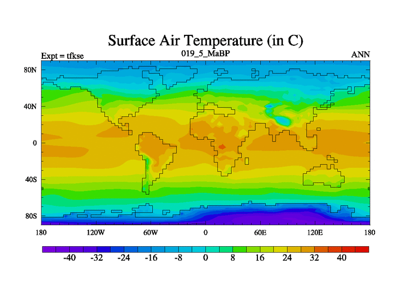 Scientifically as benchmark except using water age update, dark respiration, salinity conservation and revised ozone. Also using new orbital and solar update, and outputting leaf CO2. This version has islands included and atmospheric smoothing and desert albedo. Tuned CO2 to give Scotese temperatures. Started from end of tfkee.