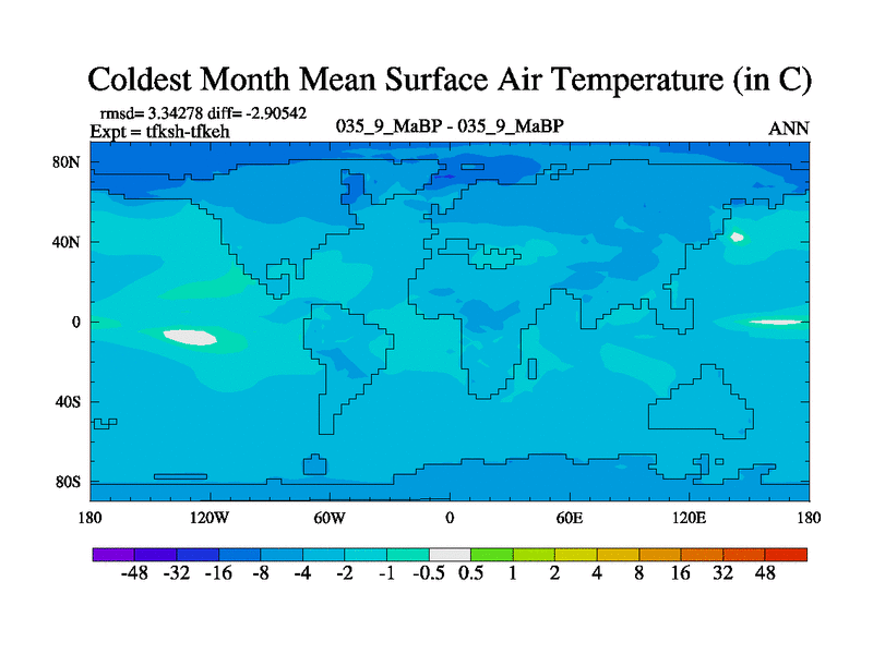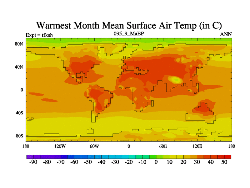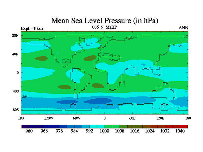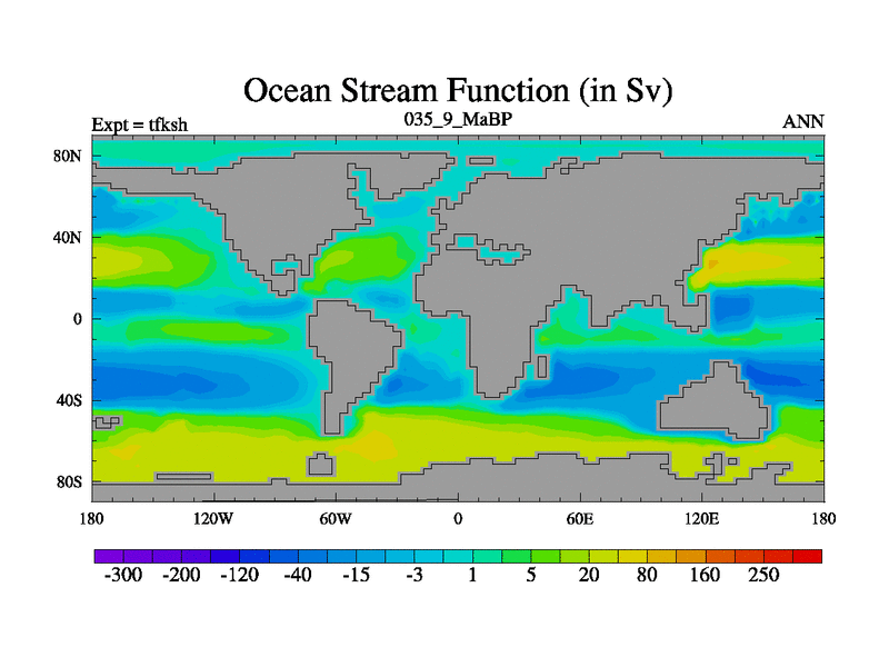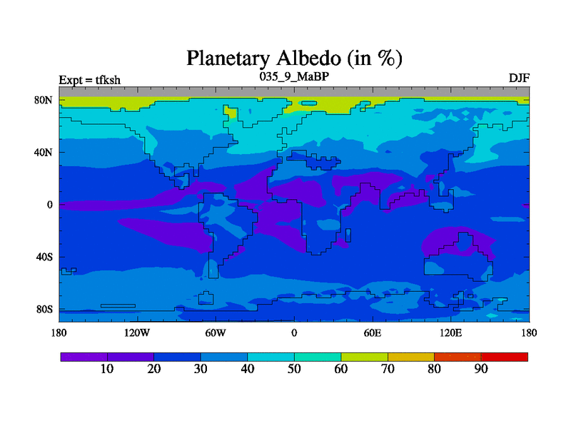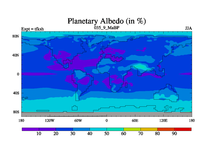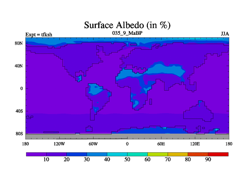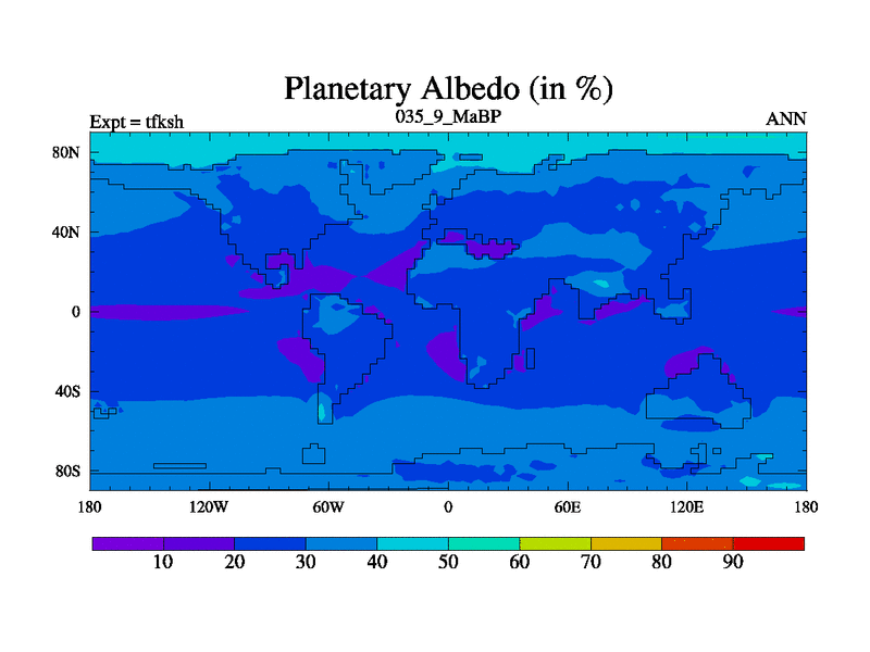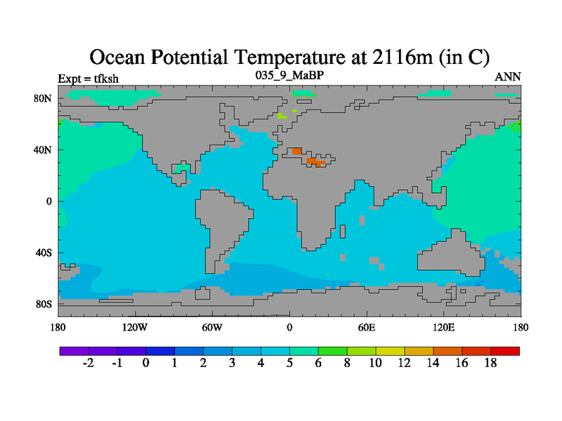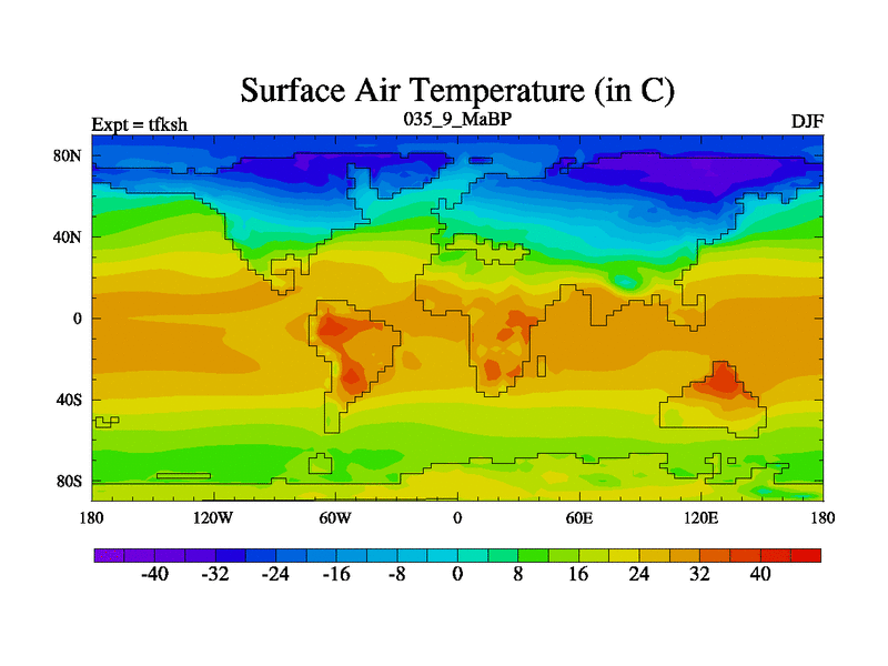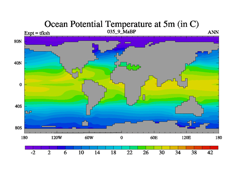 This is the 35.9 Ma simulation using the Scotese palaeogeographies and revised CCN etc. This version has islands and smoothing and desert albedo included. Tuned CO2 to give Scotese temperatures. Started from end of tfkeh.