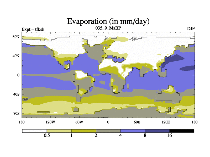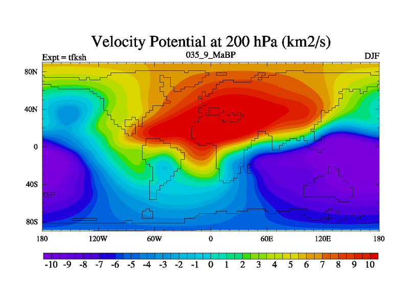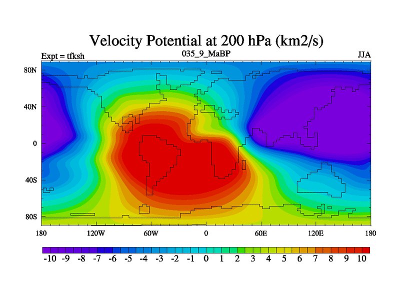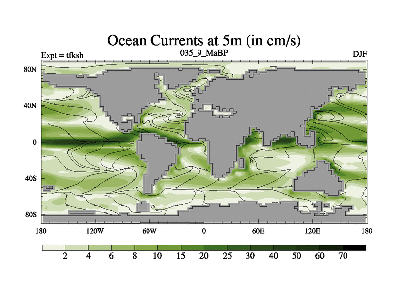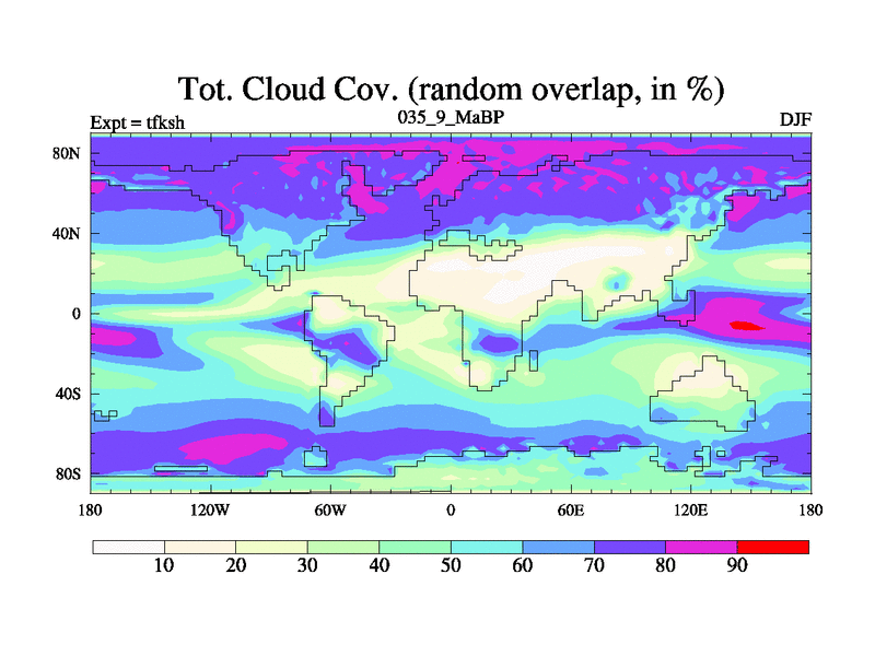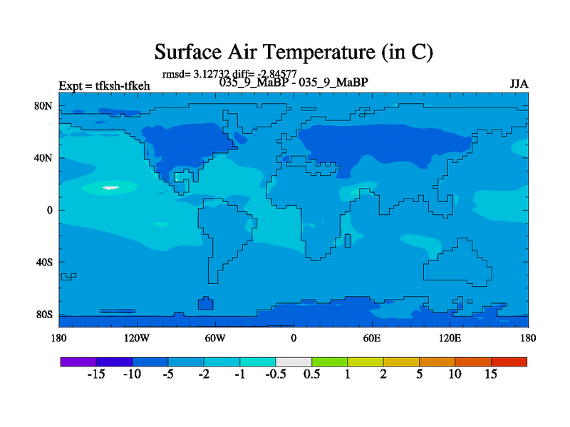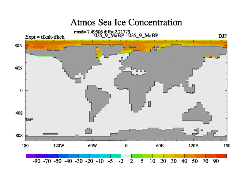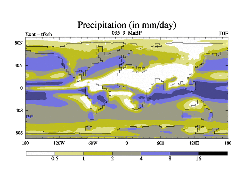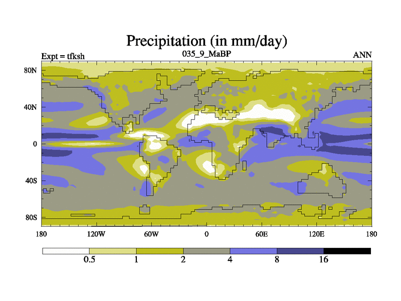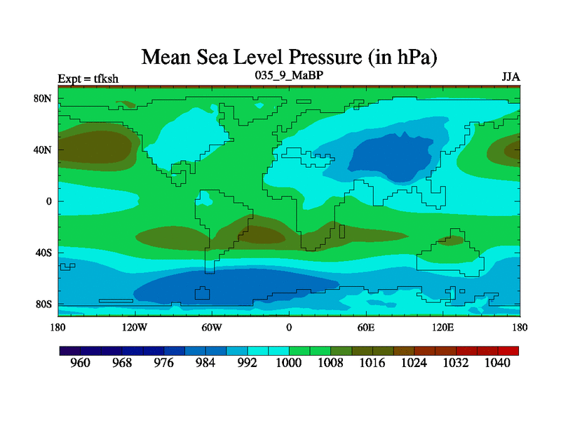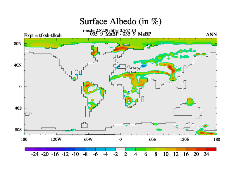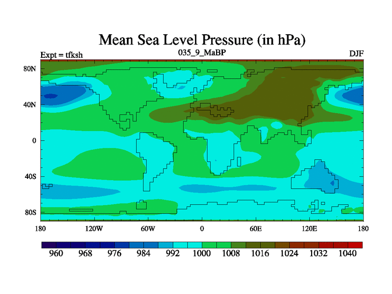 This is the 35.9 Ma simulation using the Scotese palaeogeographies and revised CCN etc. This version has islands and smoothing and desert albedo included. Tuned CO2 to give Scotese temperatures. Started from end of tfkeh.