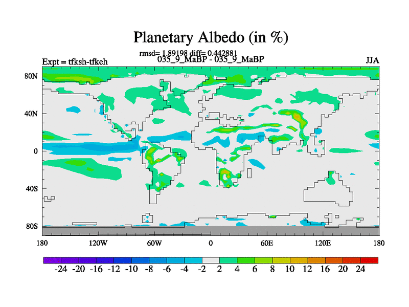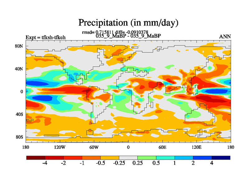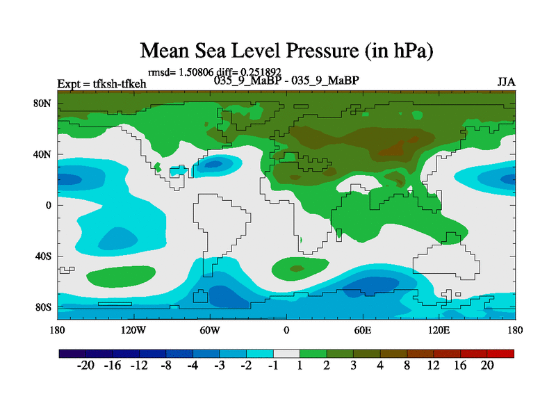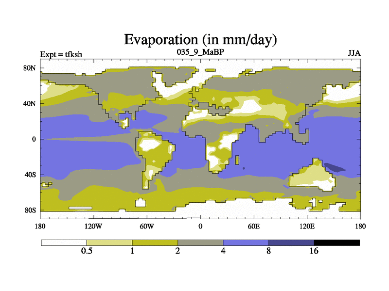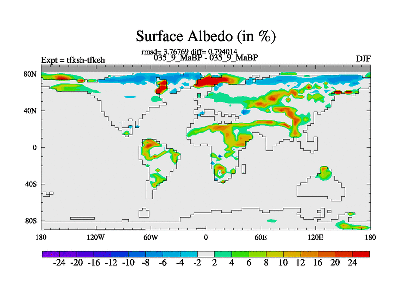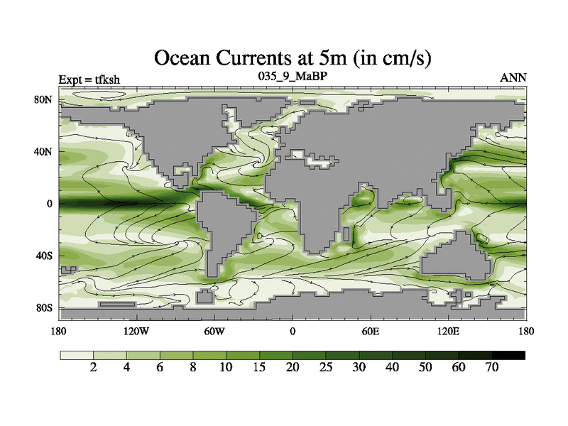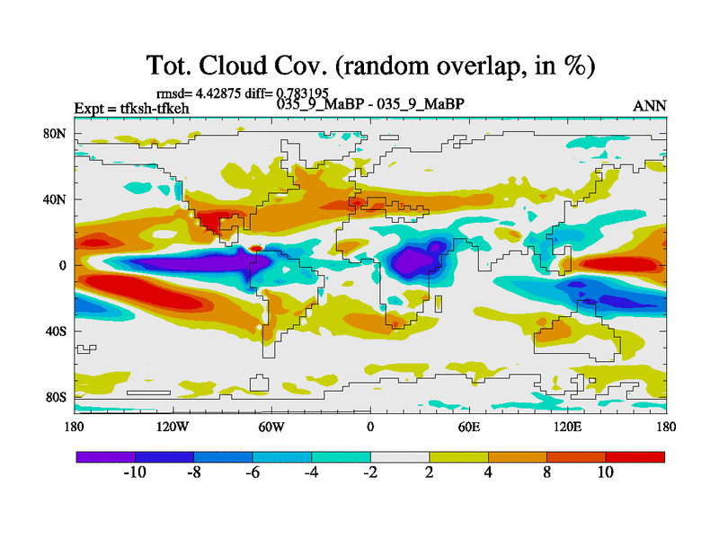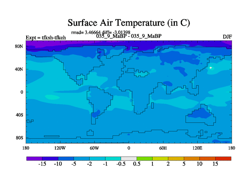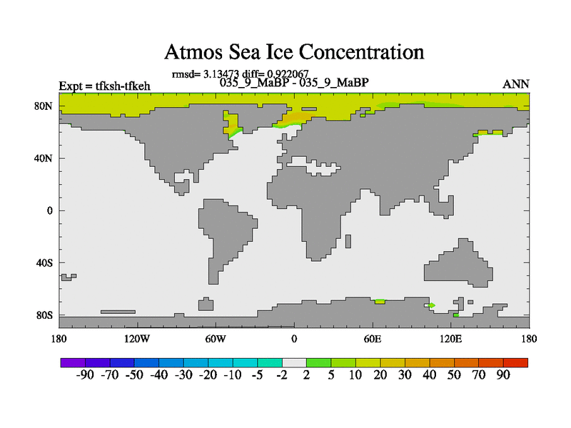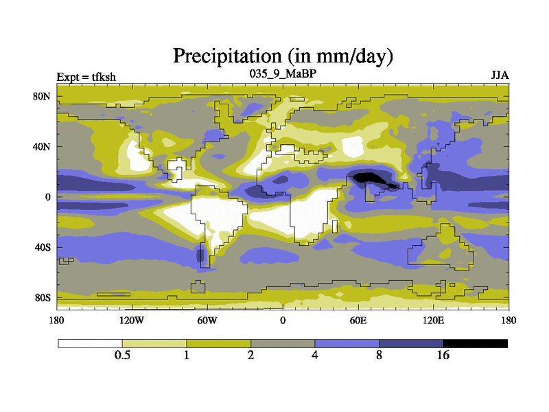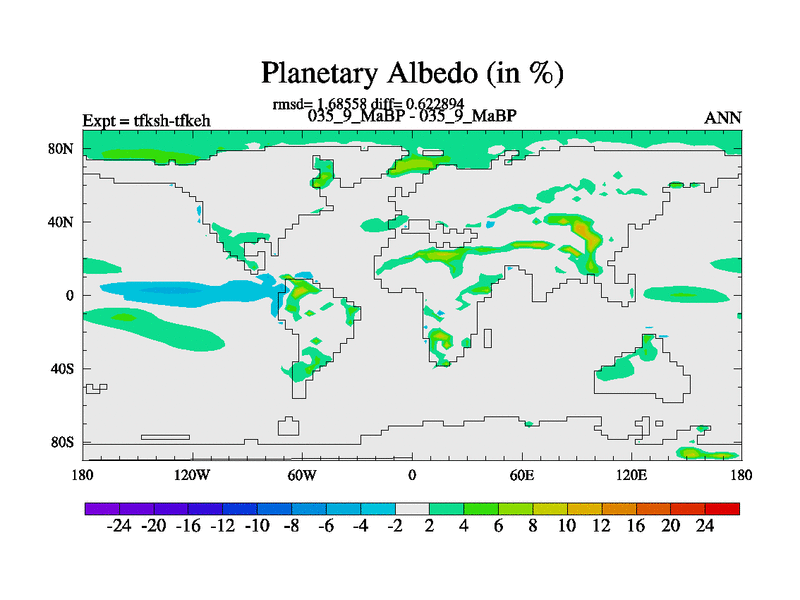This is the 35.9 Ma simulation using the Scotese palaeogeographies and revised CCN etc. This version has islands and smoothing and desert albedo included. Tuned CO2 to give Scotese temperatures. Started from end of tfkeh.