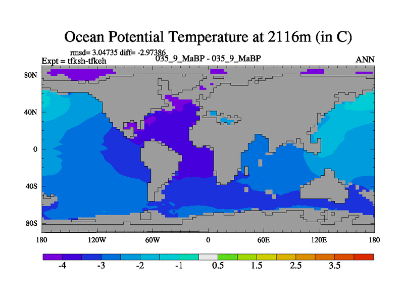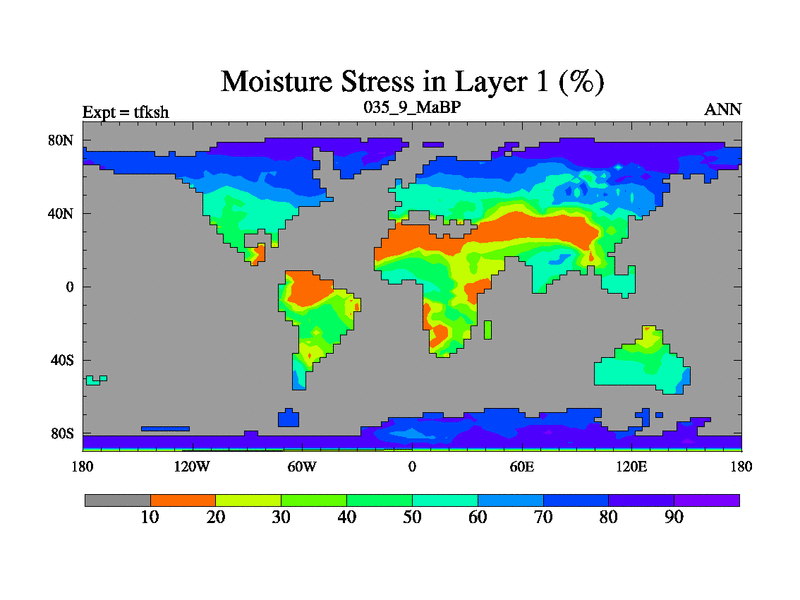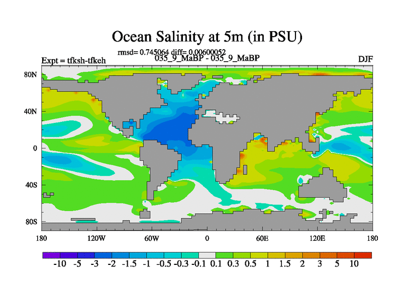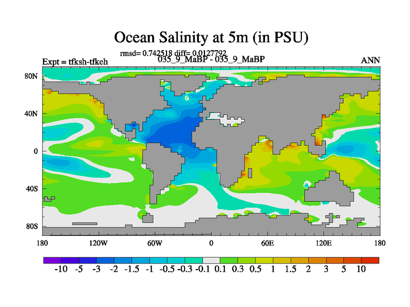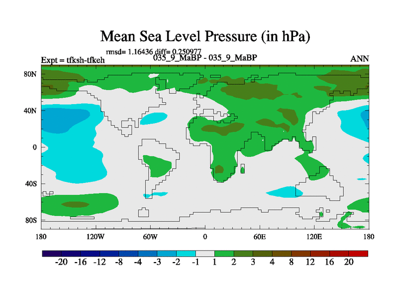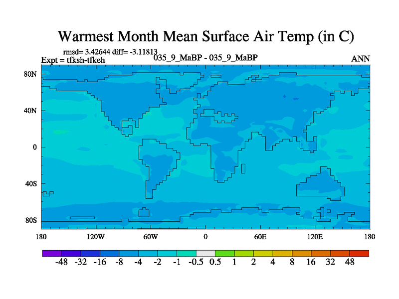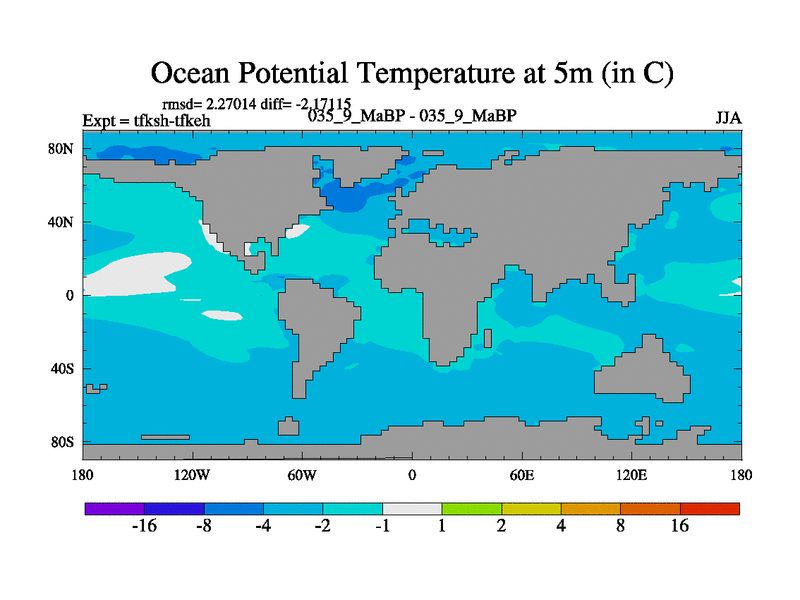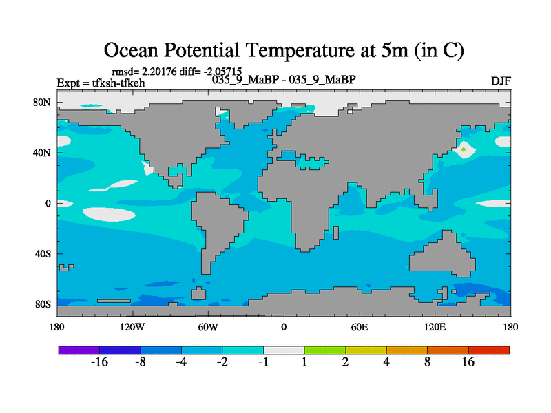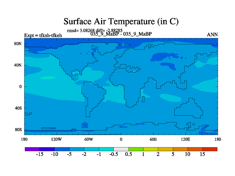 Scientifically as benchmark except using water age update, dark respiration, salinity conservation and revised ozone. Also using new orbital and solar update, and outputting leaf CO2. This version has islands included and atmospheric smoothing and desert albedo. Tuned CO2 to give Scotese temperatures. Started from end of tfkeh.