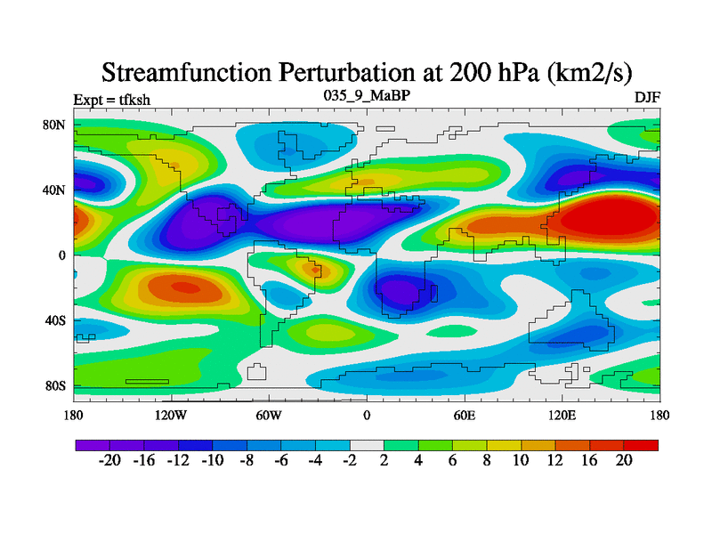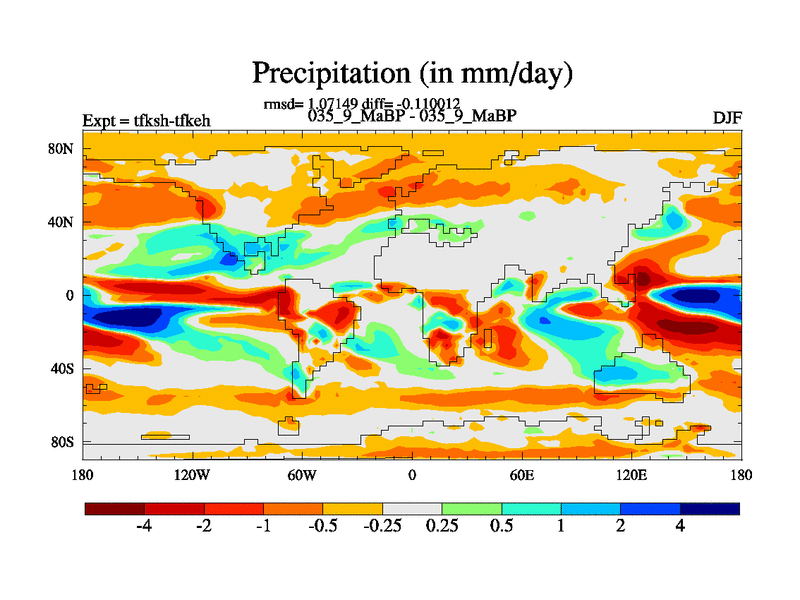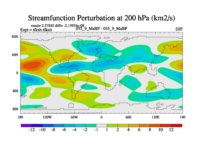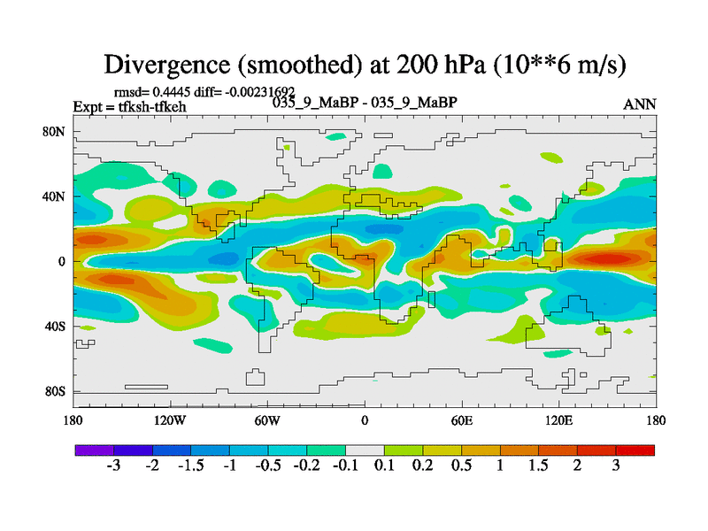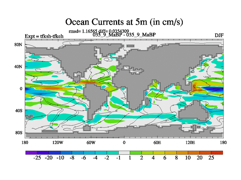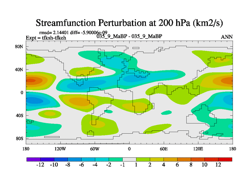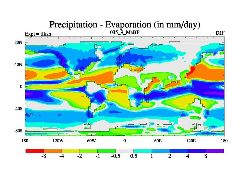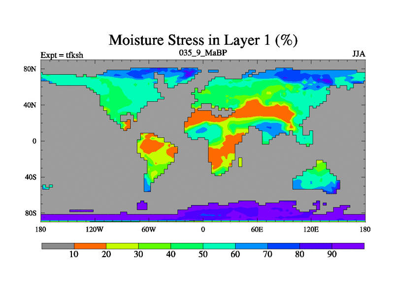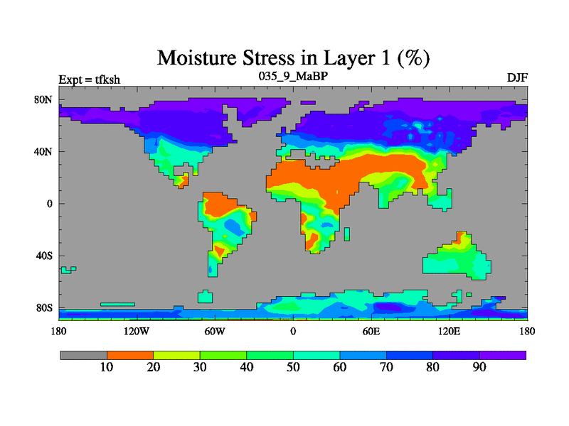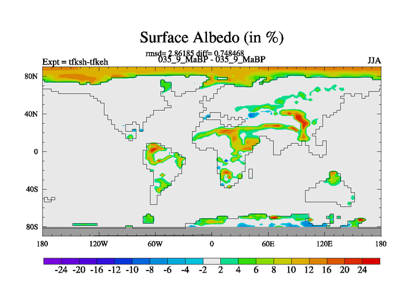 Scientifically as benchmark except using water age update, dark respiration, salinity conservation and revised ozone. Also using new orbital and solar update, and outputting leaf CO2. This version has islands included and atmospheric smoothing and desert albedo. Tuned CO2 to give Scotese temperatures. Started from end of tfkeh.