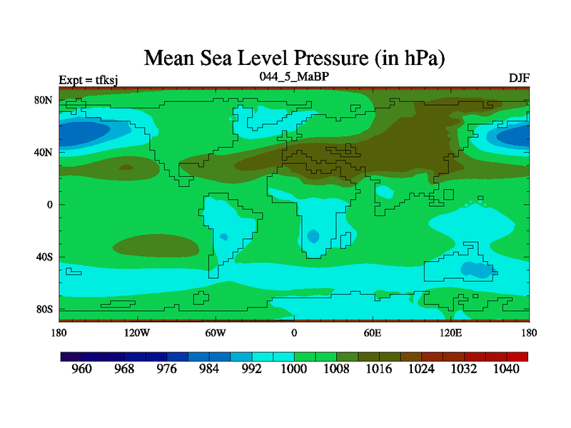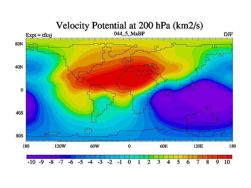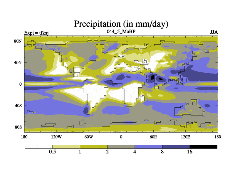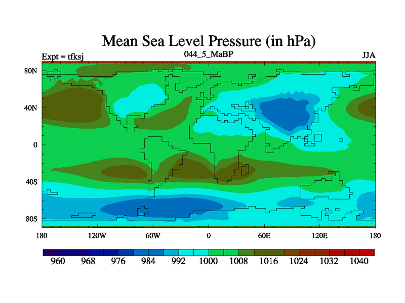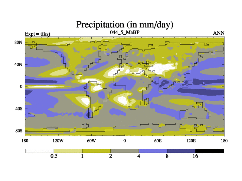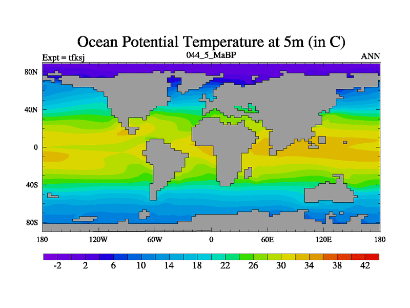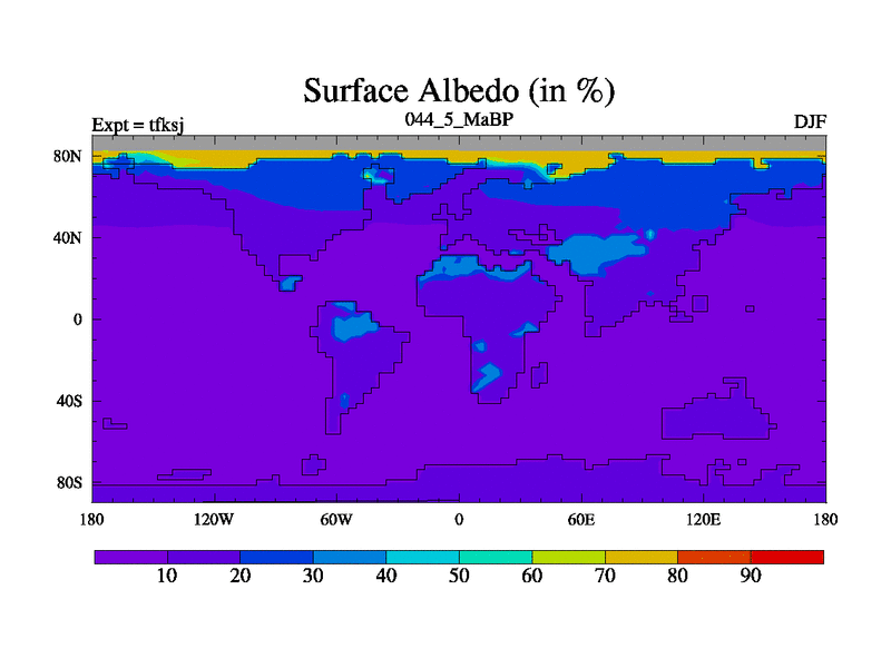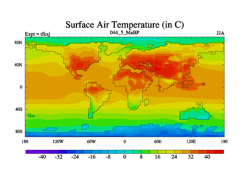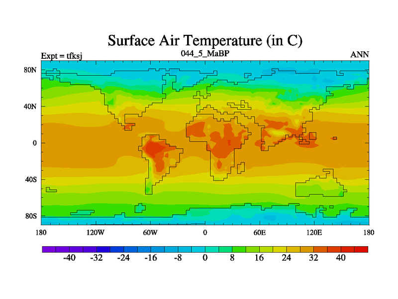 This is the 44.5 Ma simulation using the Scotese palaeogeographies and revised CCN etc. This version has islands and smoothing and desert albedo included. Tuned CO2 to give Scotese temperatures. Started from end of tfkej.