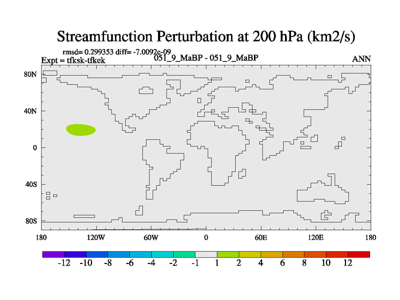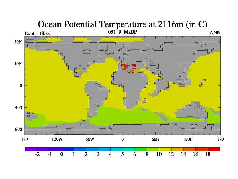 Scientifically as benchmark except using water age update, dark respiration, salinity conservation and revised ozone. Also using new orbital and solar update, and outputting leaf CO2. This version has islands included and atmospheric smoothing and desert albedo. Tuned CO2 to give Scotese temperatures. Started from end of tfkek.