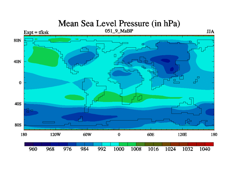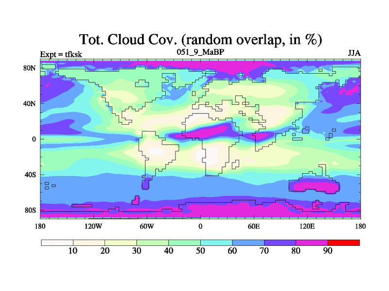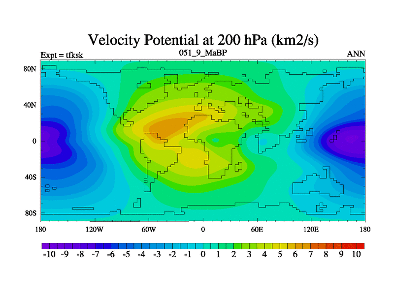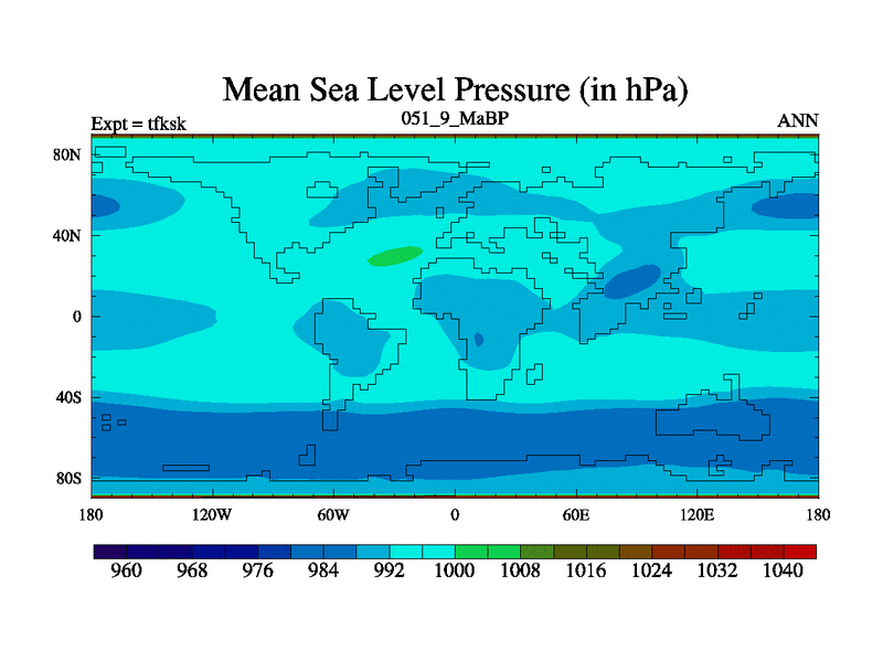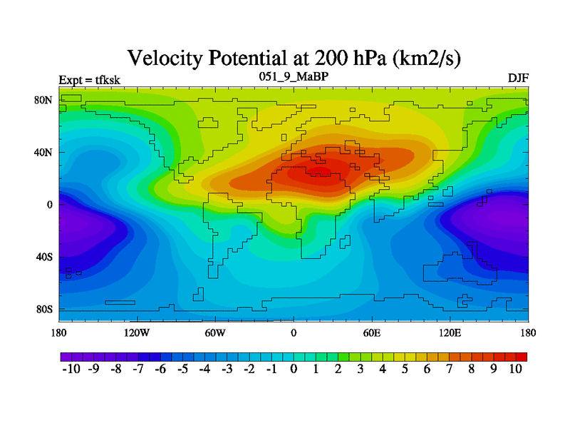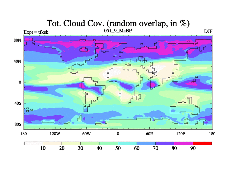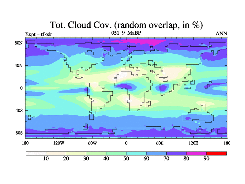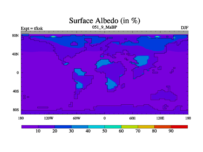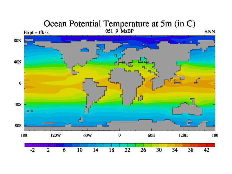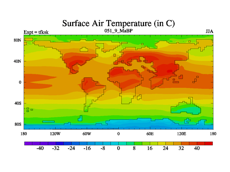 This is the 51.9 Ma simulation using the Scotese palaeogeographies and revised CCN etc. This version has islands and smoothing and desert albedo included. Tuned CO2 to give Scotese temperatures. Started from end of tfkek.