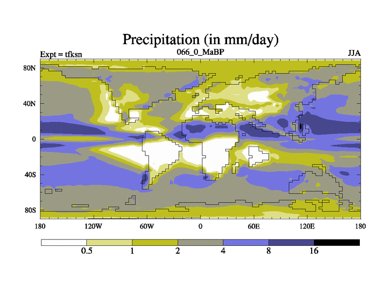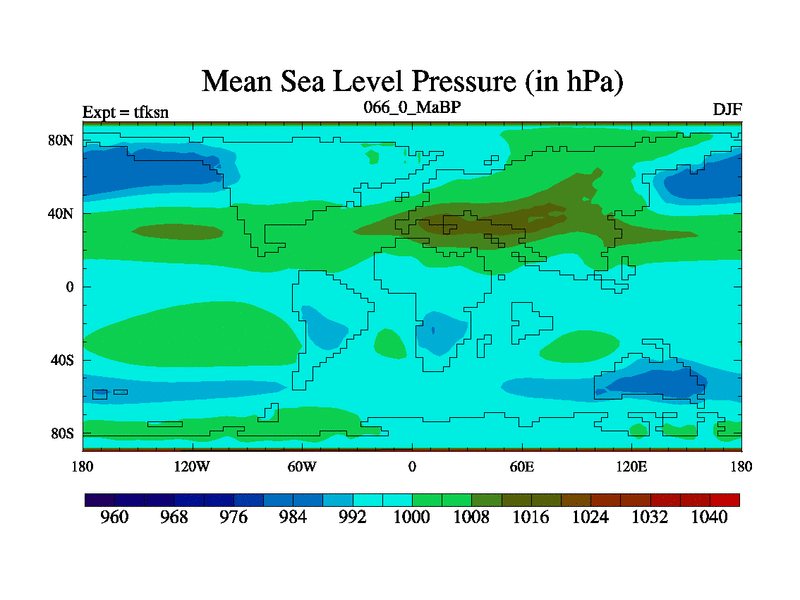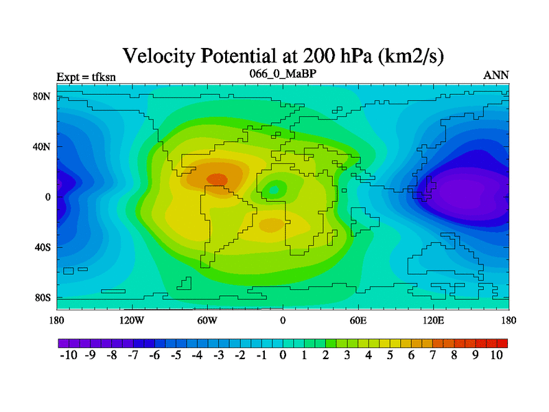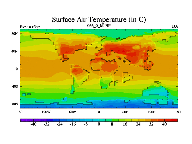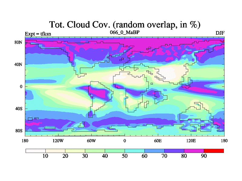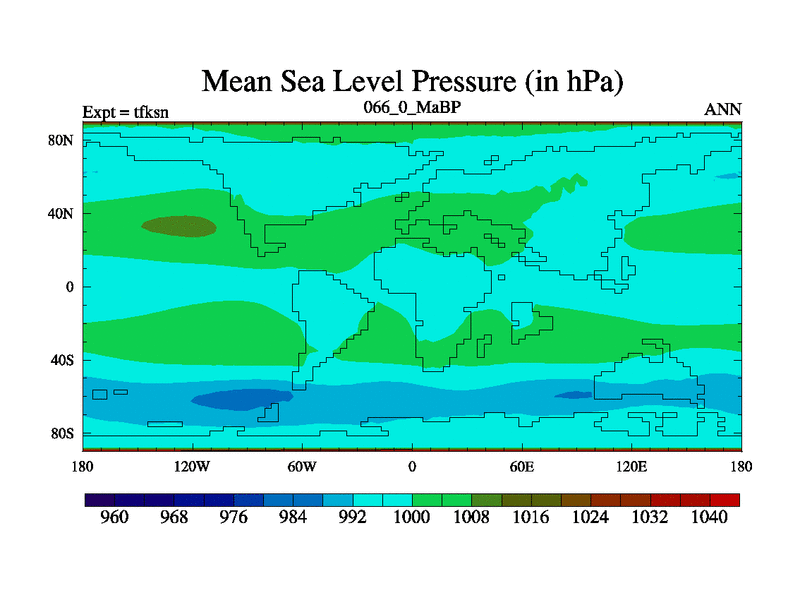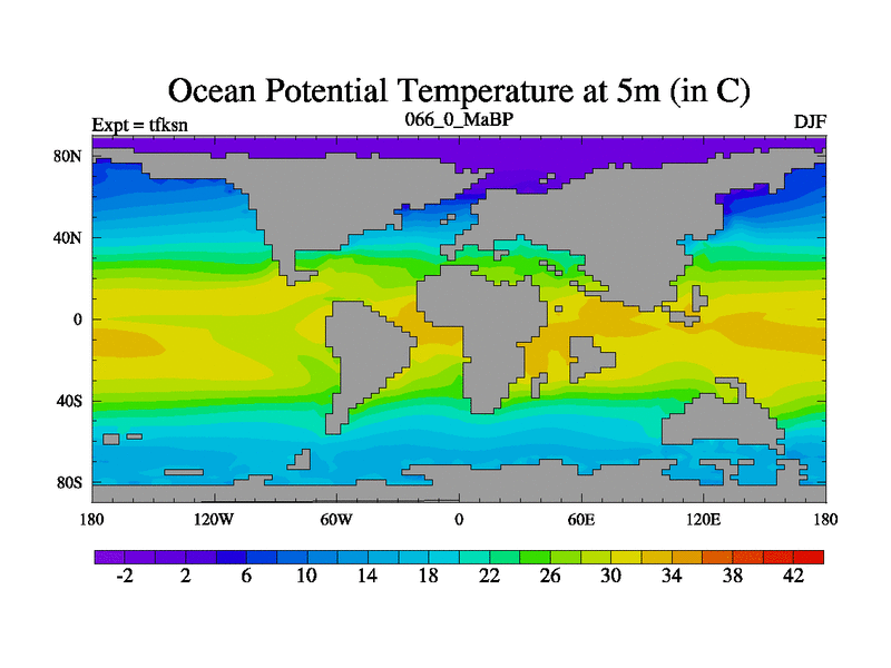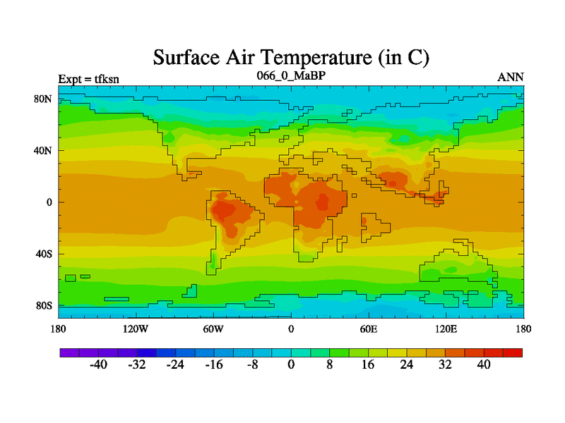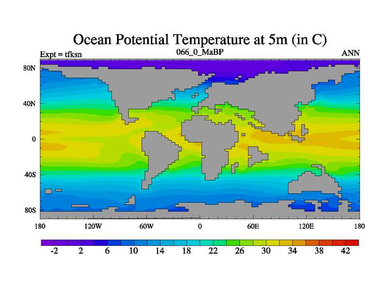 This is the 66.0 Ma simulation using the Scotese palaeogeographies and revised CCN etc. This version has islands and smoothing and desert albedo included. Tuned CO2 to give Scotese temperatures. Started from end of tfken.