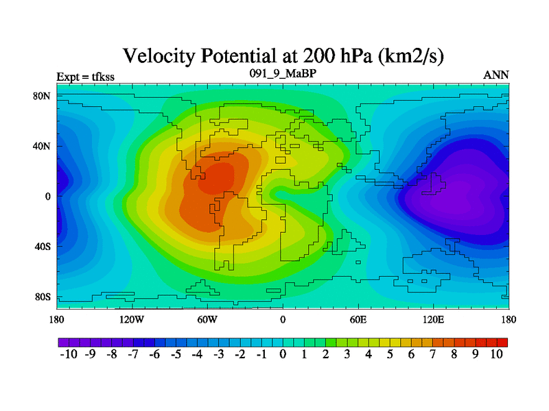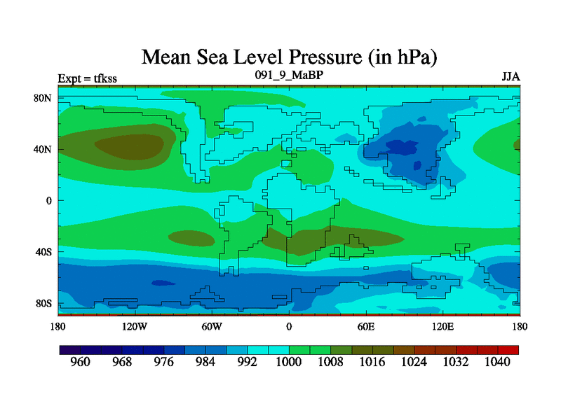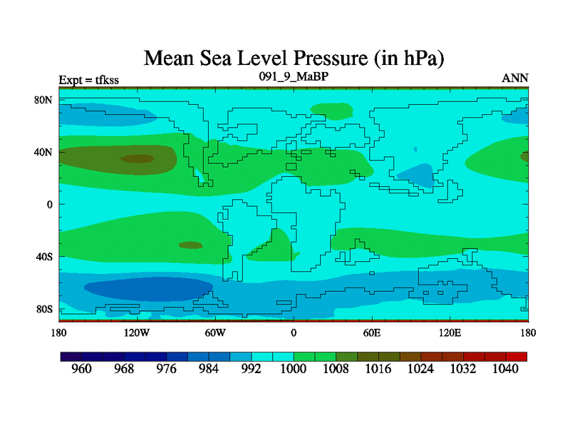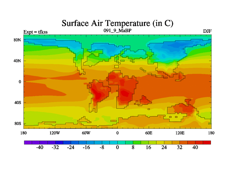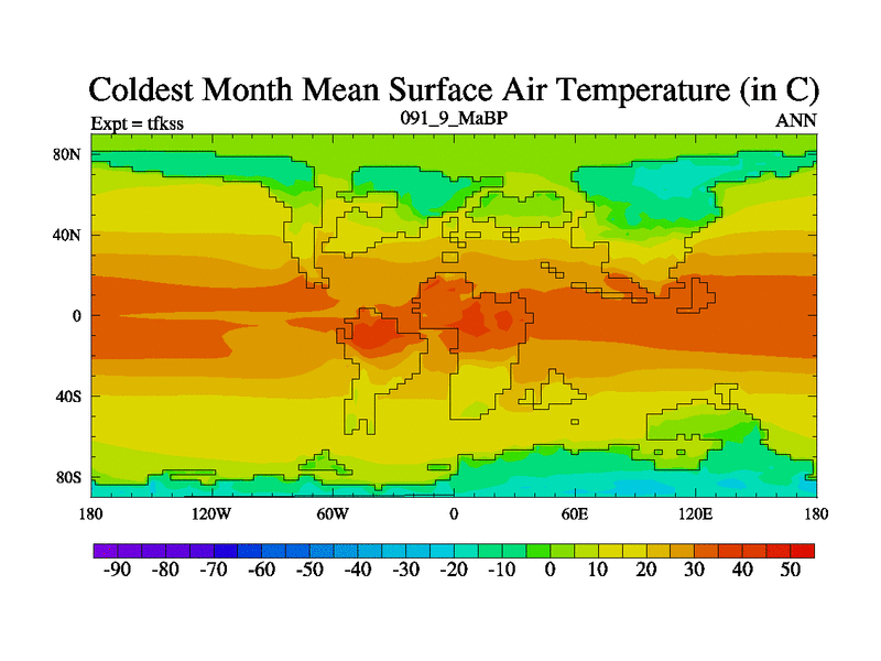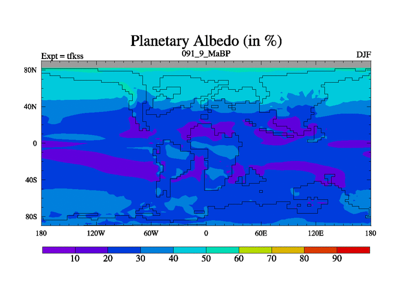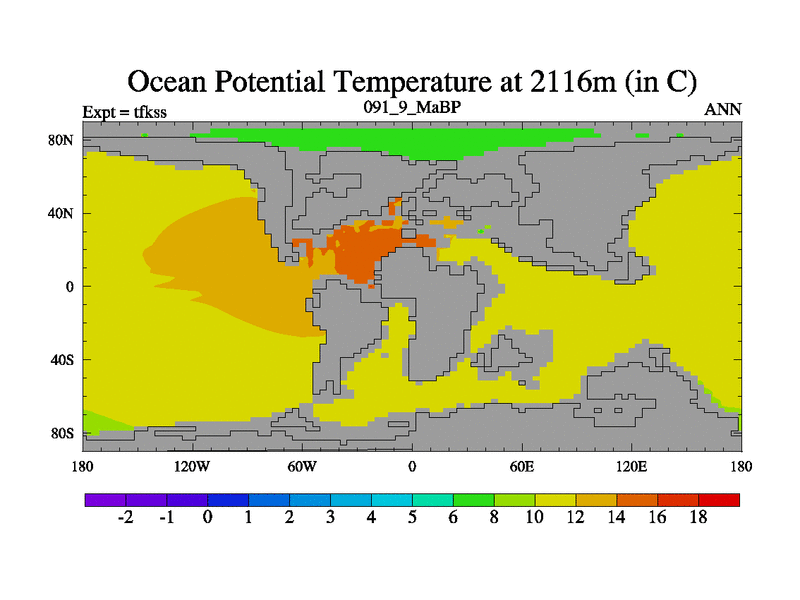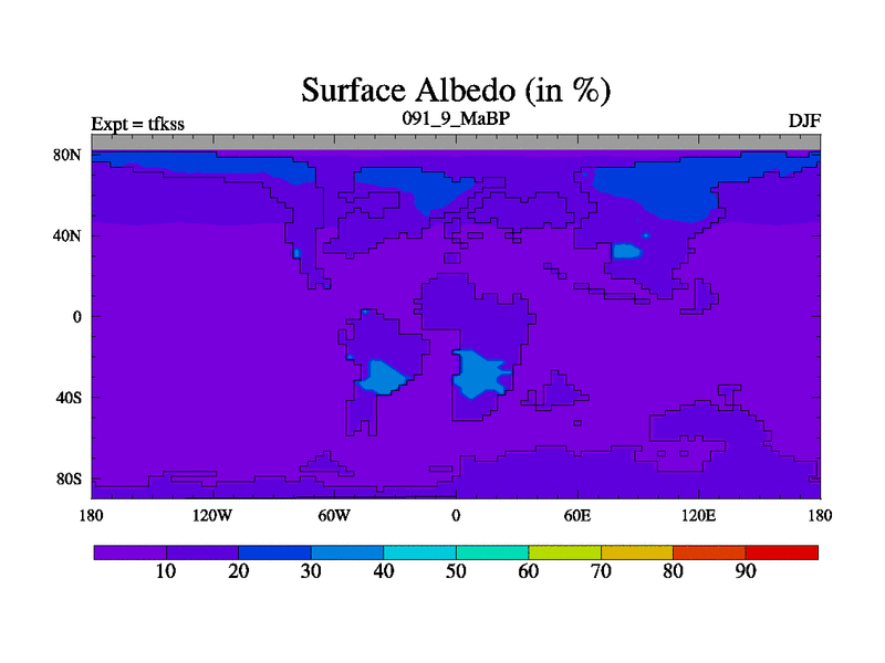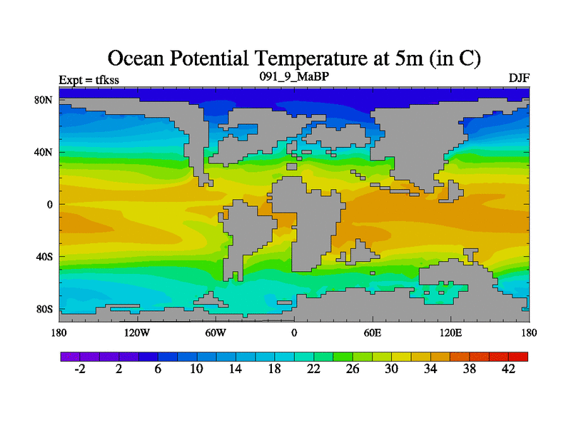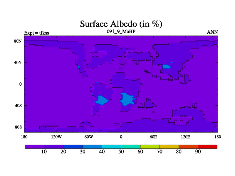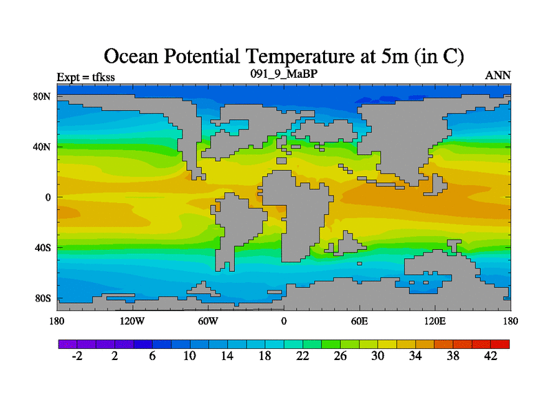 This is the 91.9 Ma simulation using the Scotese palaeogeographies and revised CCN etc. This version has islands and smoothing and desert albedo included. Tuned CO2 to give Scotese temperatures. Started from end of tfkes.