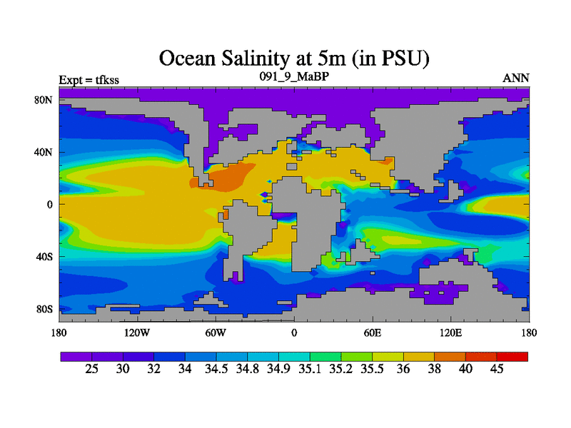 Scientifically as benchmark except using water age update, dark respiration, salinity conservation and revised ozone. Also using new orbital and solar update, and outputting leaf CO2. This version has islands included and atmospheric smoothing and desert albedo. Tuned CO2 to give Scotese temperatures. Started from end of tfkes.