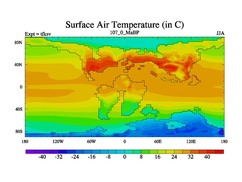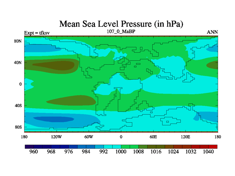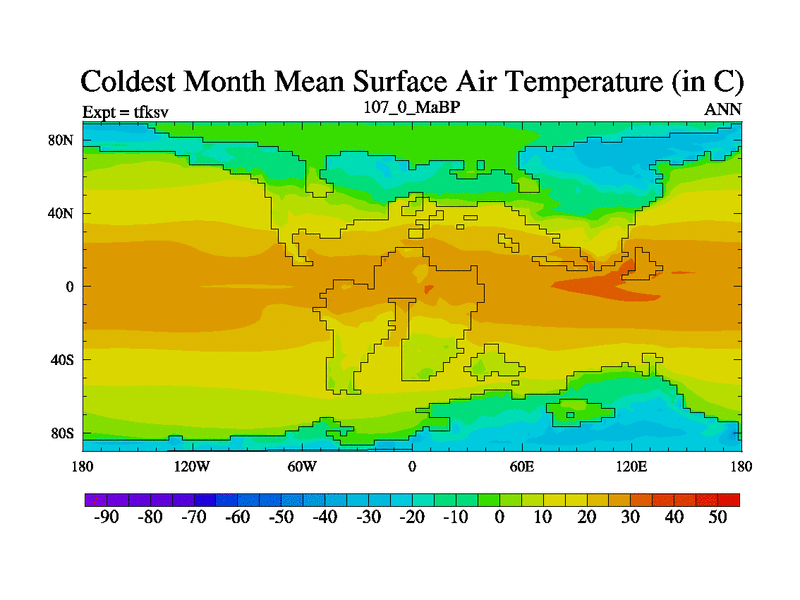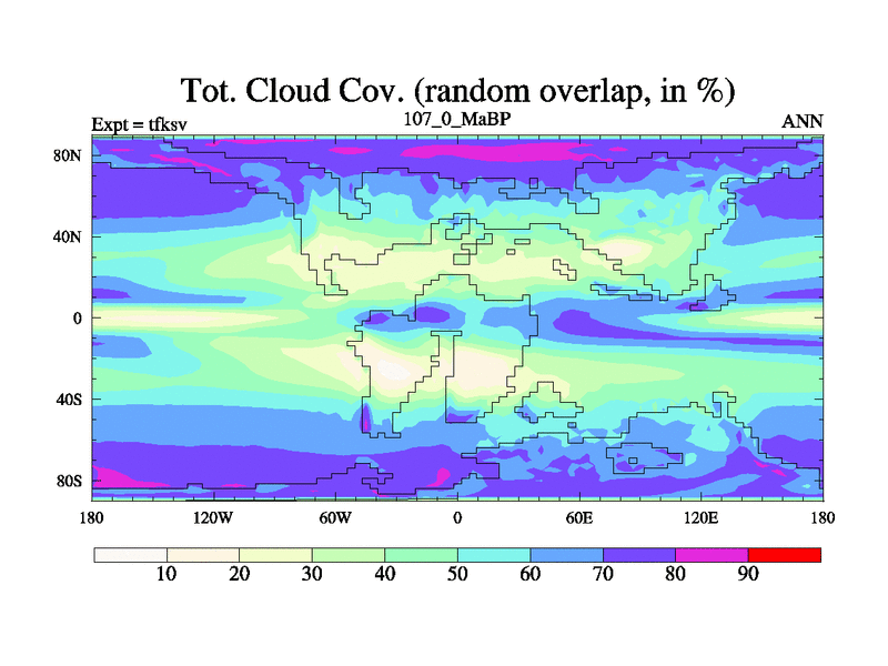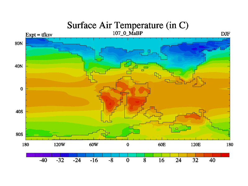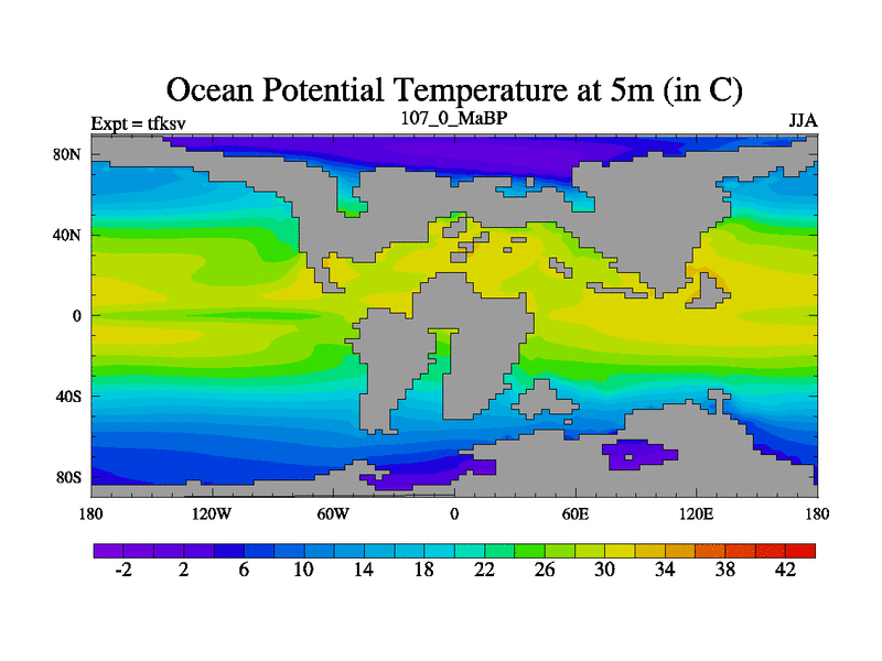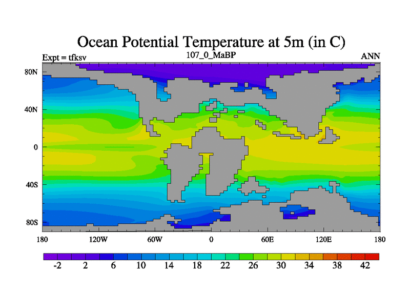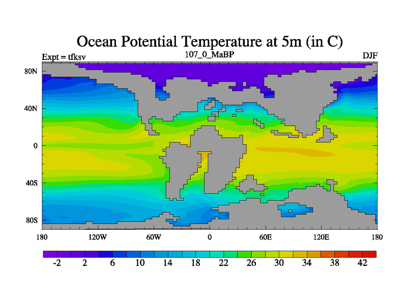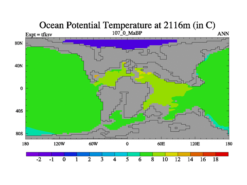 This is the 107.0 Ma simulation using the Scotese palaeogeographies and revised CCN etc. This version has islands and smoothing and desert albedo included. Tuned CO2 to give Scotese temperatures. Started from end of tfkev.
