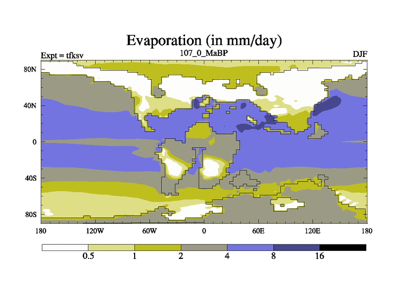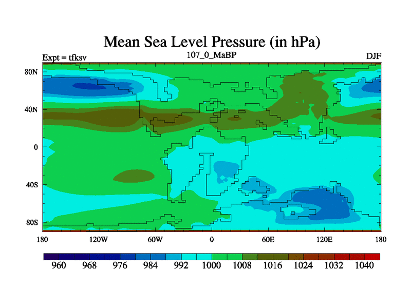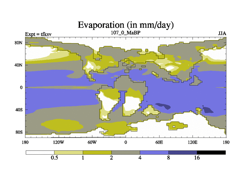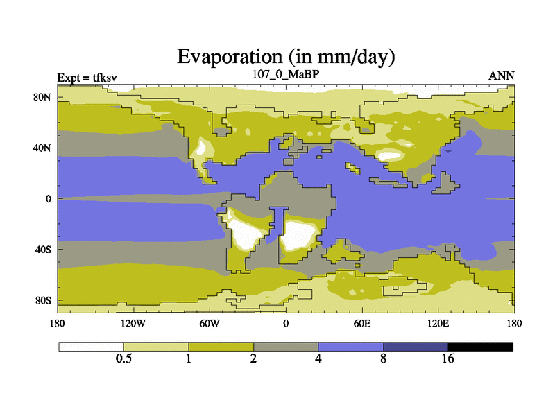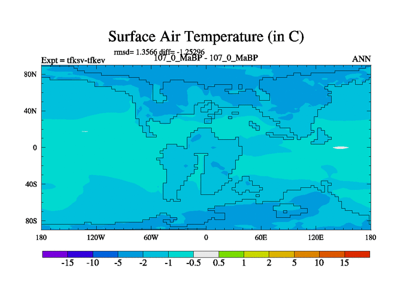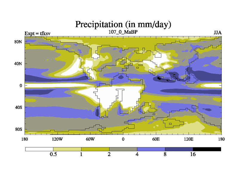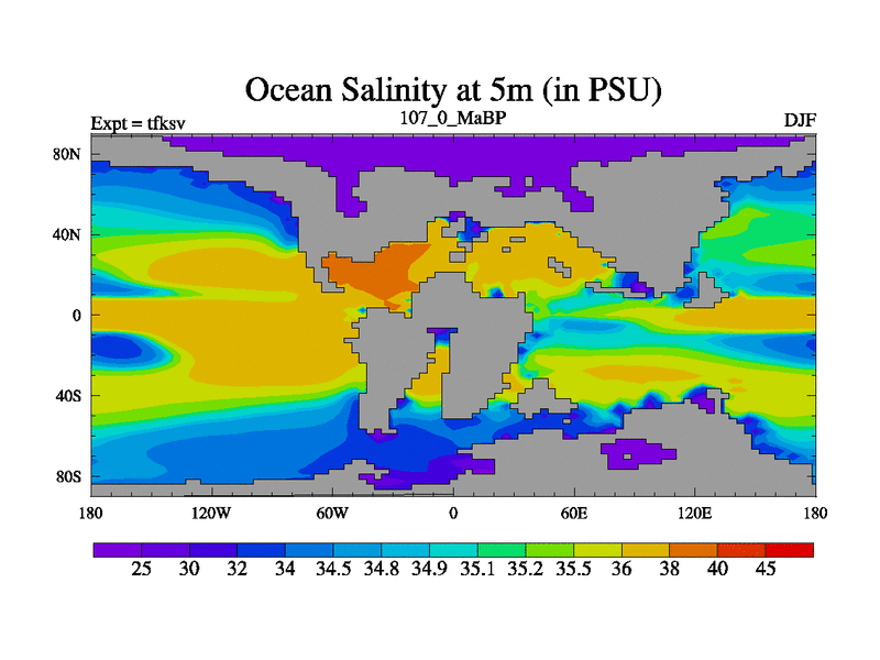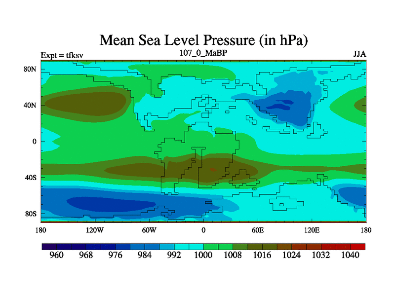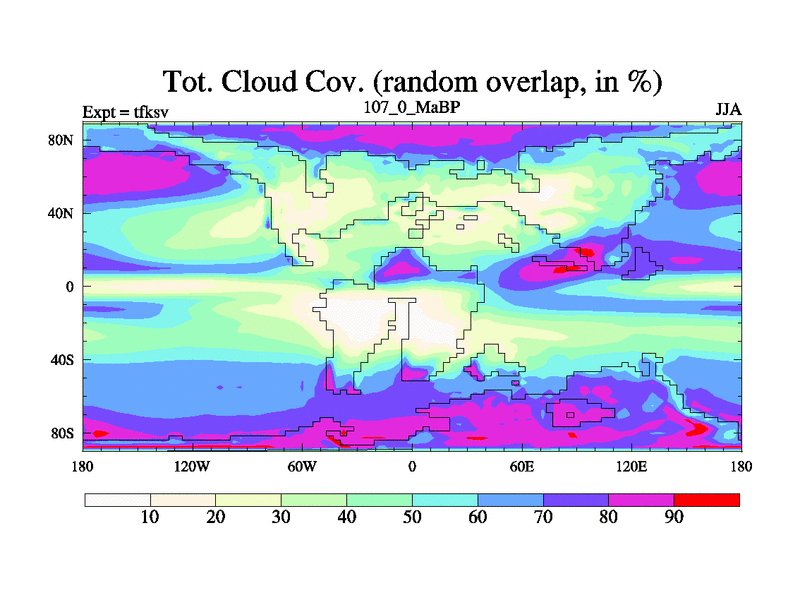 This is the 107.0 Ma simulation using the Scotese palaeogeographies and revised CCN etc. This version has islands and smoothing and desert albedo included. Tuned CO2 to give Scotese temperatures. Started from end of tfkev.