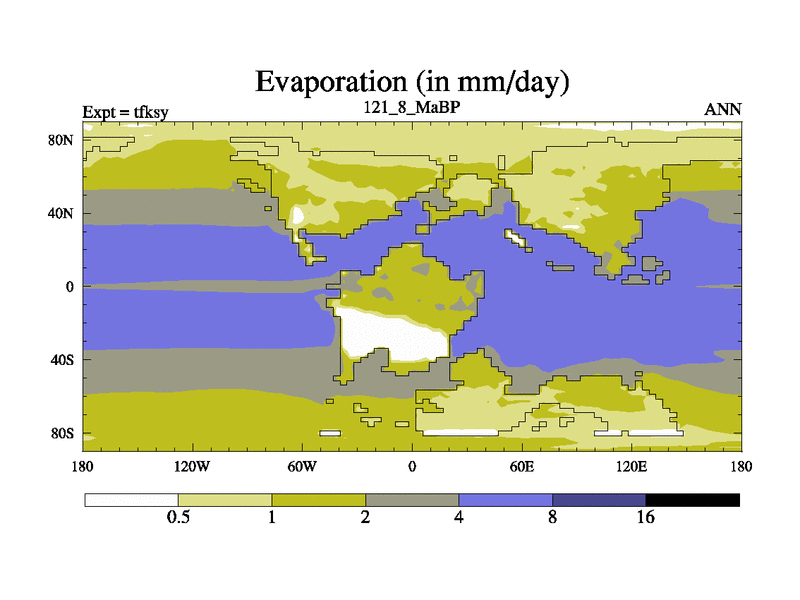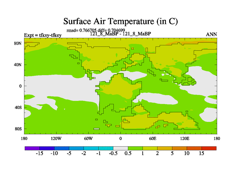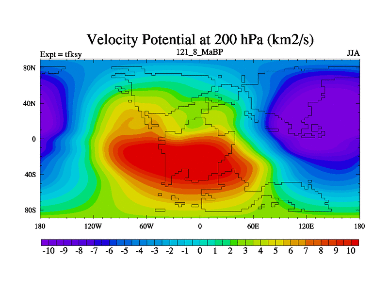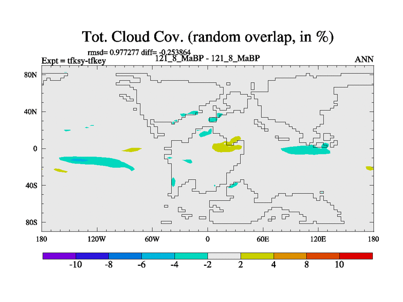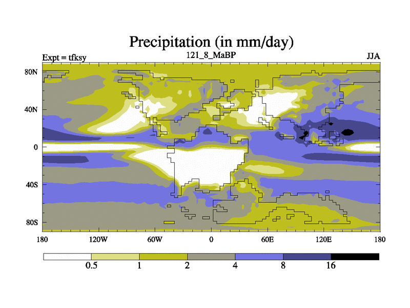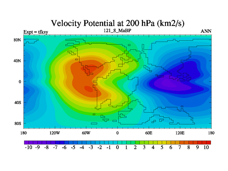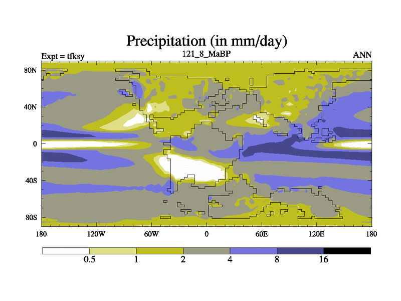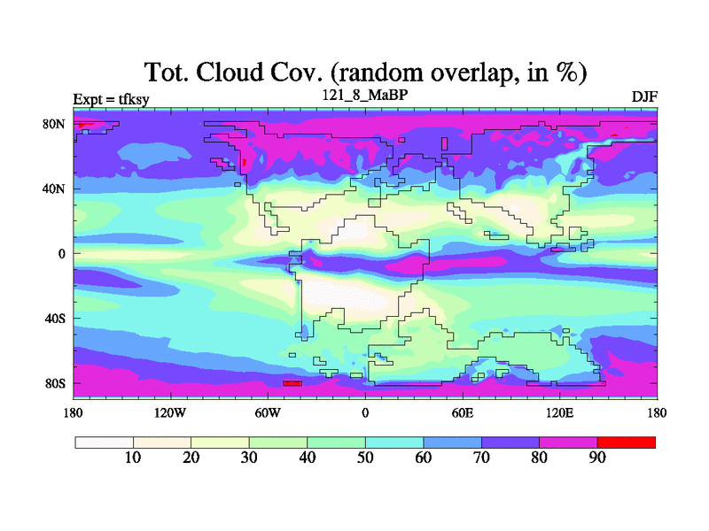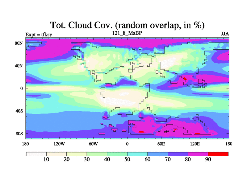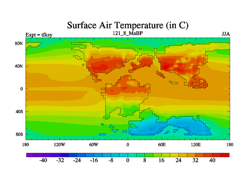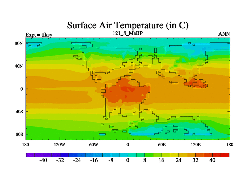 This is the 121.8 Ma simulation using the Scotese palaeogeographies and revised CCN etc. This version has islands and smoothing and desert albedo included. Tuned CO2 to give Scotese temperatures. Started from end of tfkey.