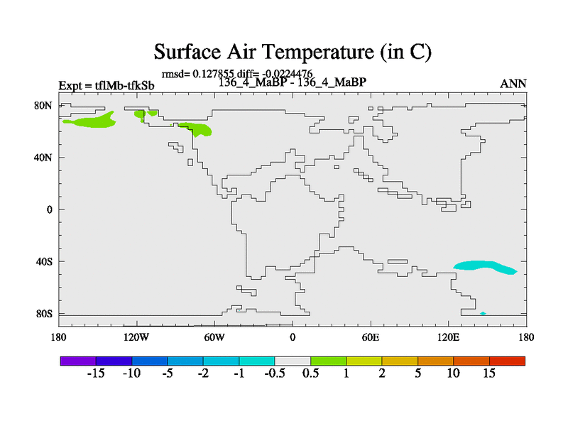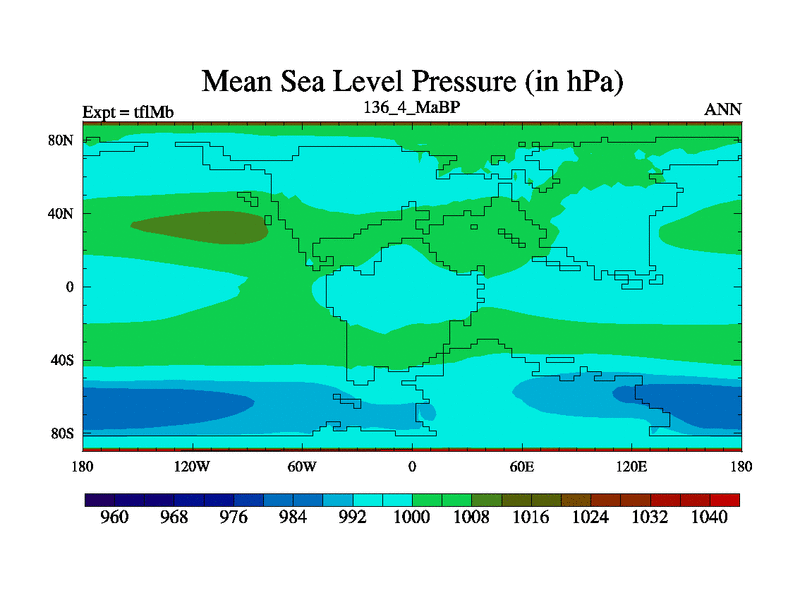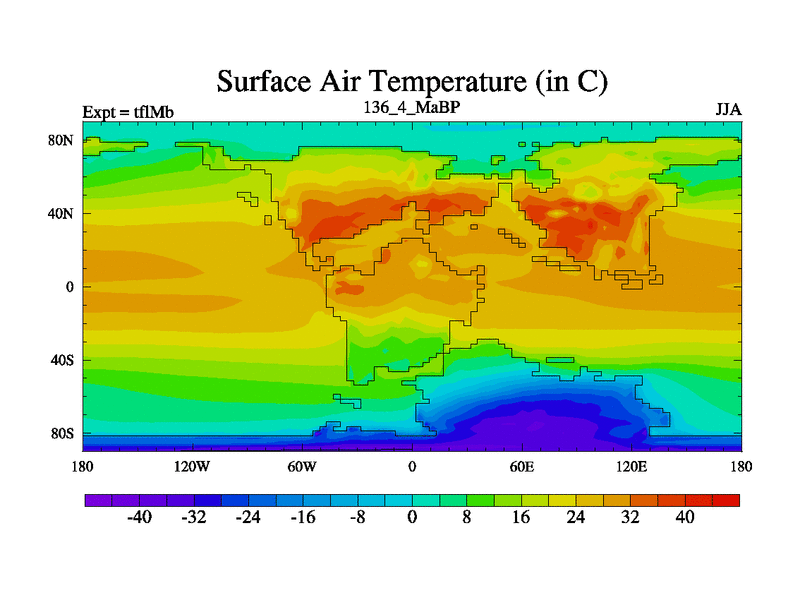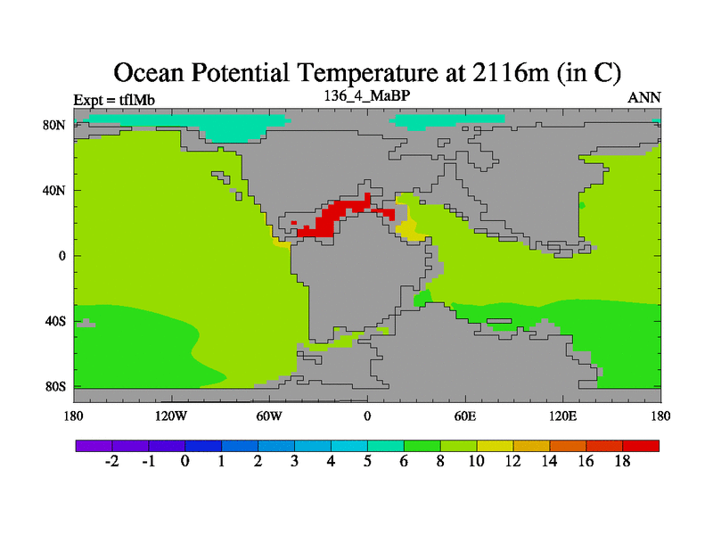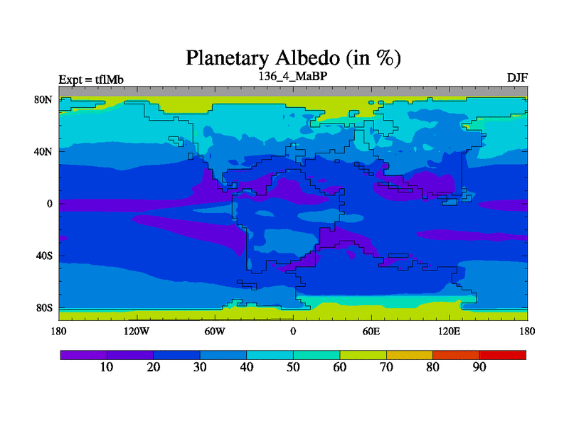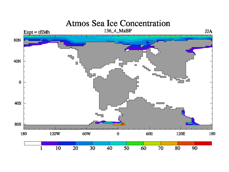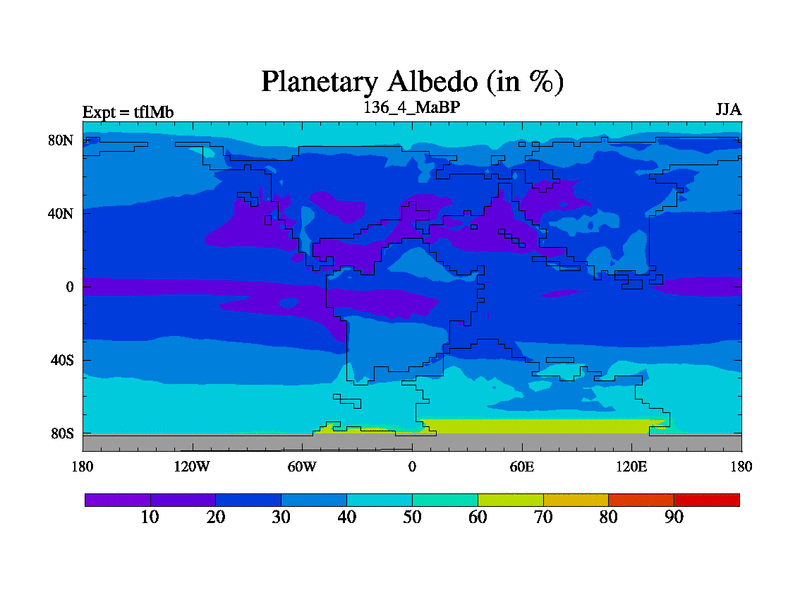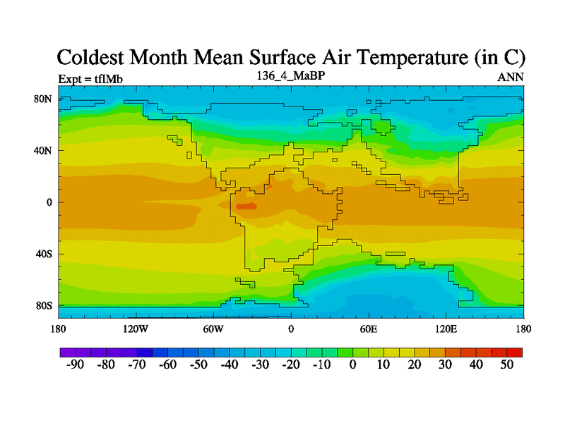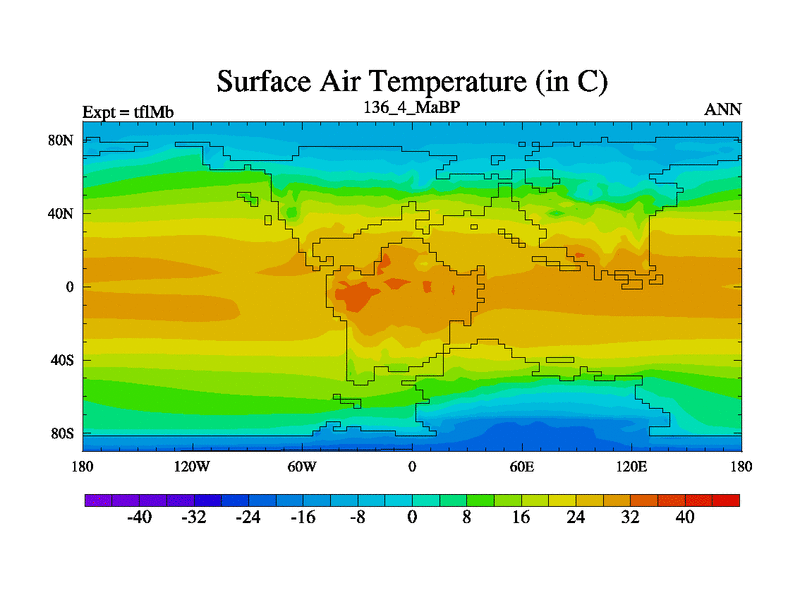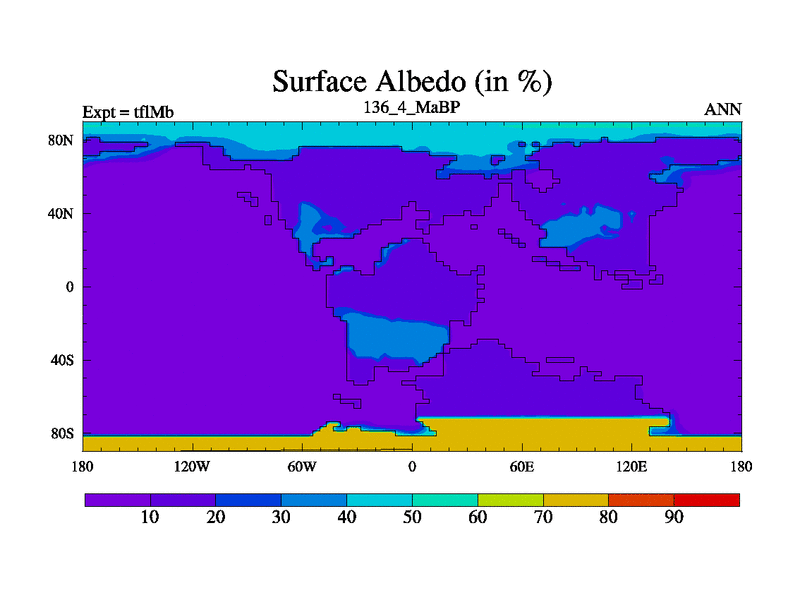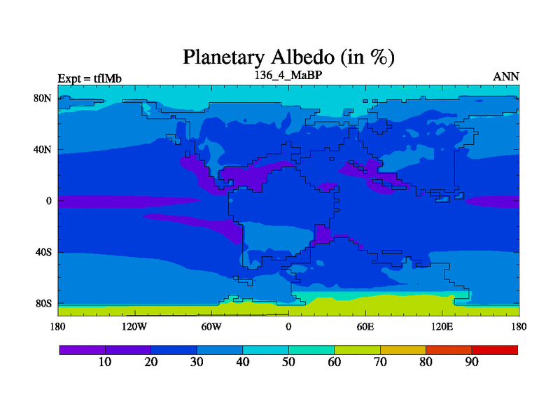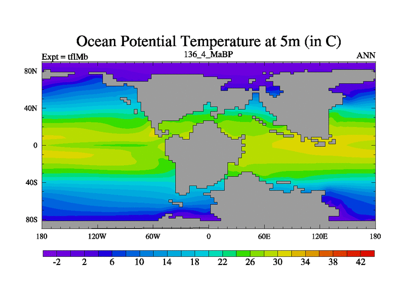 This is the 136.4 Ma simulation using the Scotese palaeogeographies and revised CCN etc. This version has islands and smoothing and desert albedo included. Tuned CO2 to give Scotese temperatures. Started from end of tfkSb. With JEDI output.