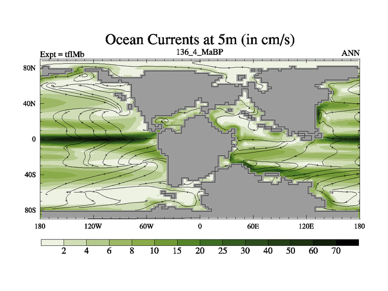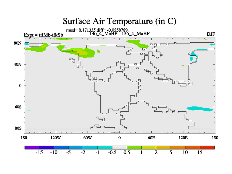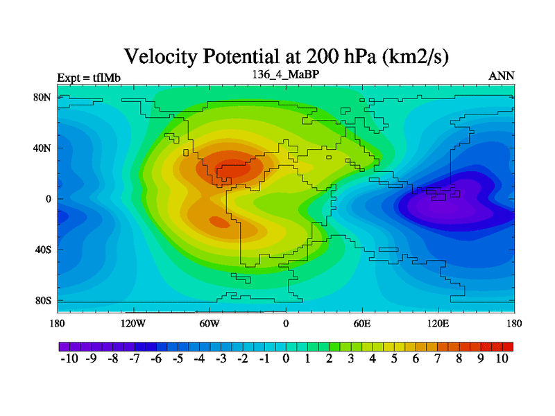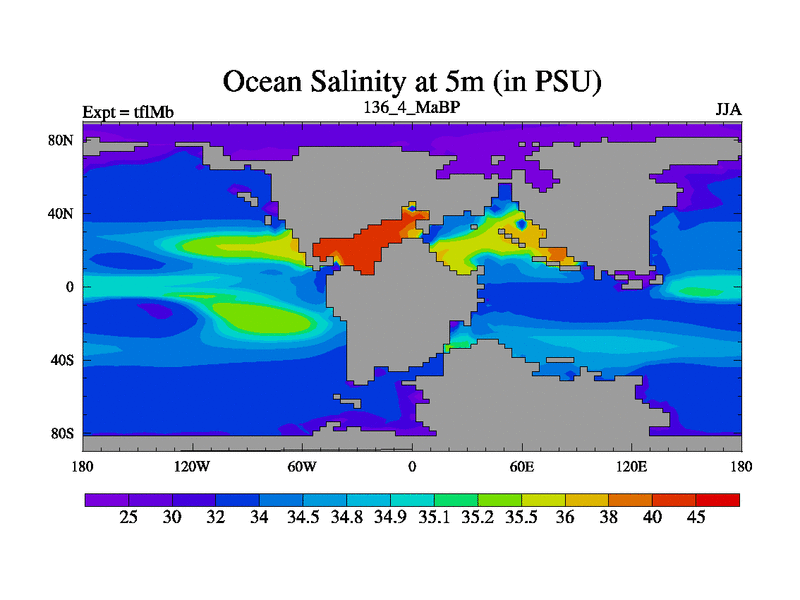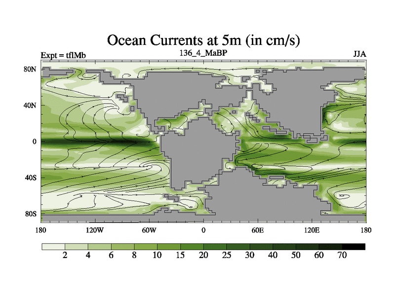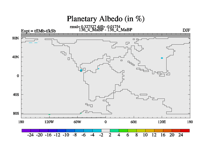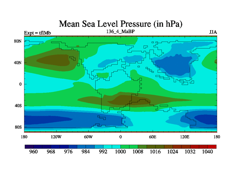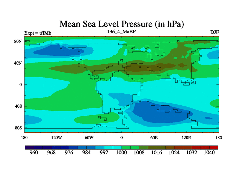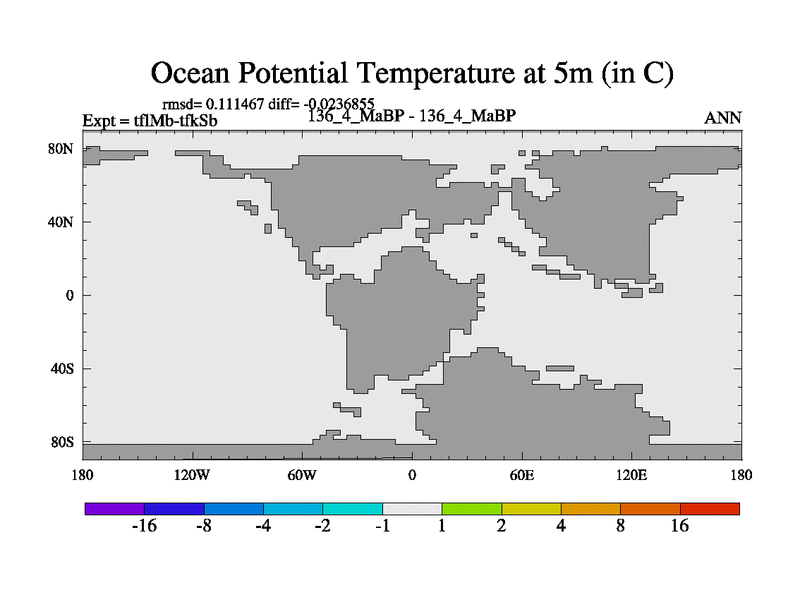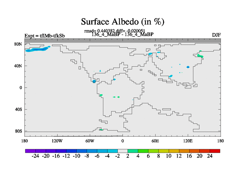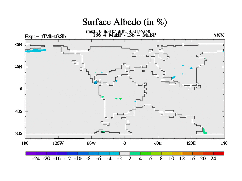 This is the 136.4 Ma simulation using the Scotese palaeogeographies and revised CCN etc. This version has islands and smoothing and desert albedo included. Tuned CO2 to give Scotese temperatures. Started from end of tfkSb. With JEDI output.