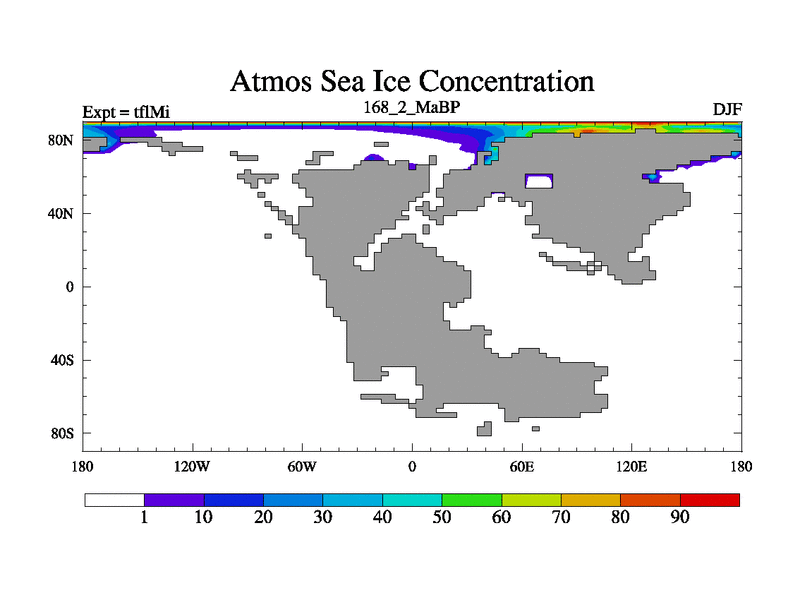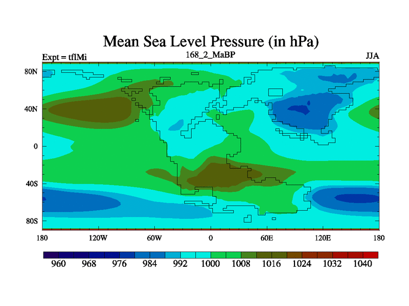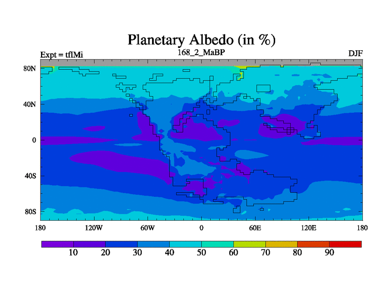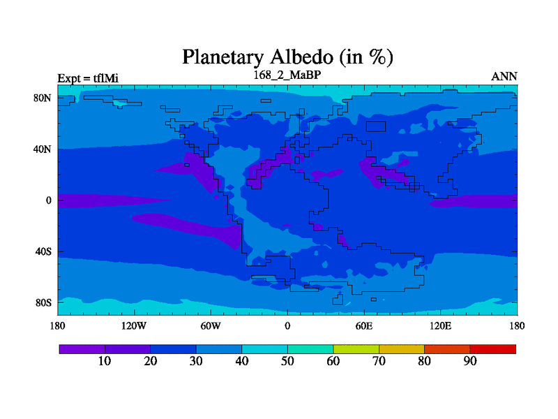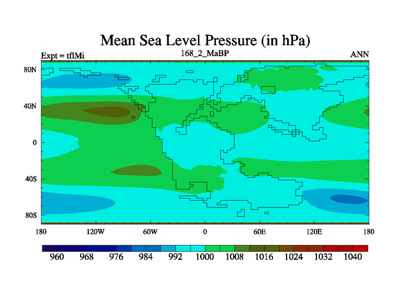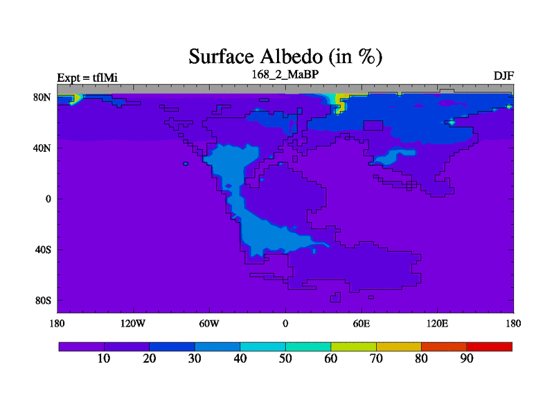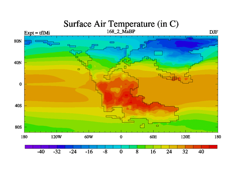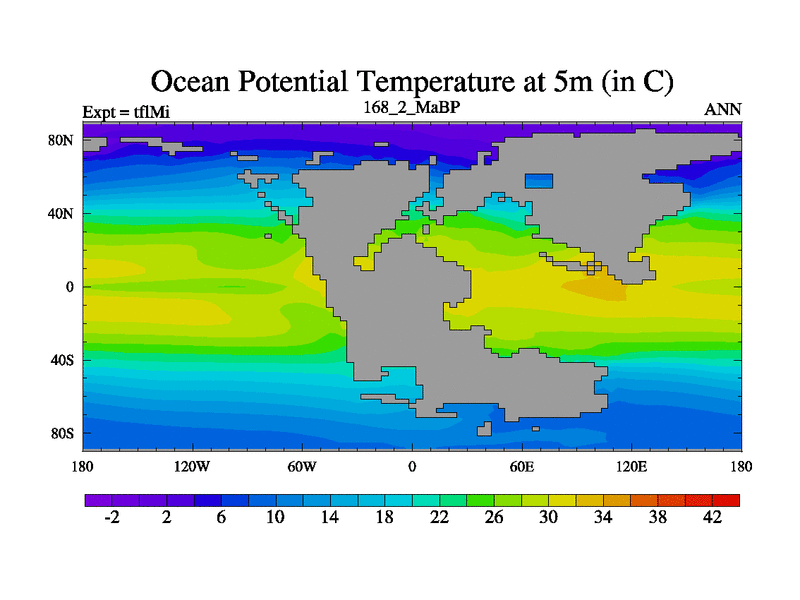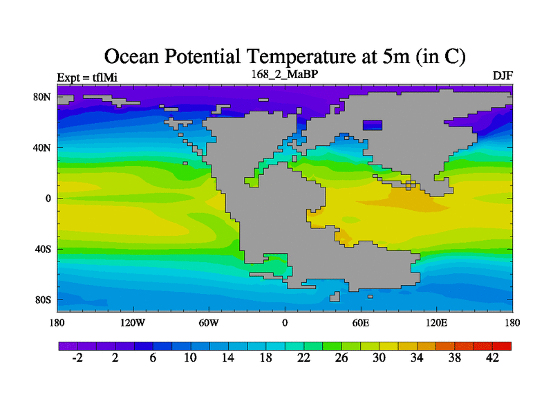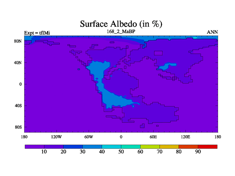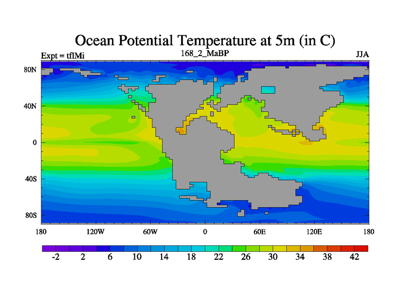 This is the 168.2 Ma simulation using the Scotese palaeogeographies and revised CCN etc. This version has islands and smoothing and desert albedo included. Tuned CO2 to give Scotese temperatures. Started from end of tfkSi. With JEDI output.