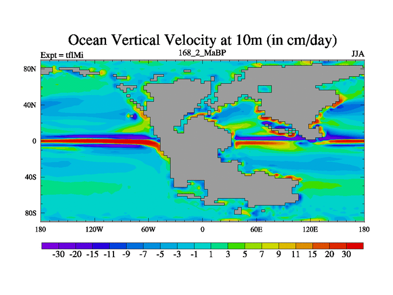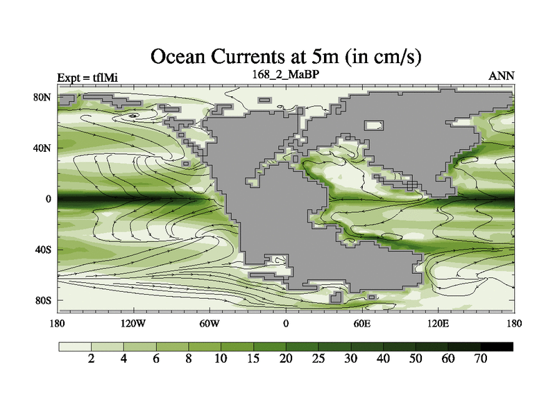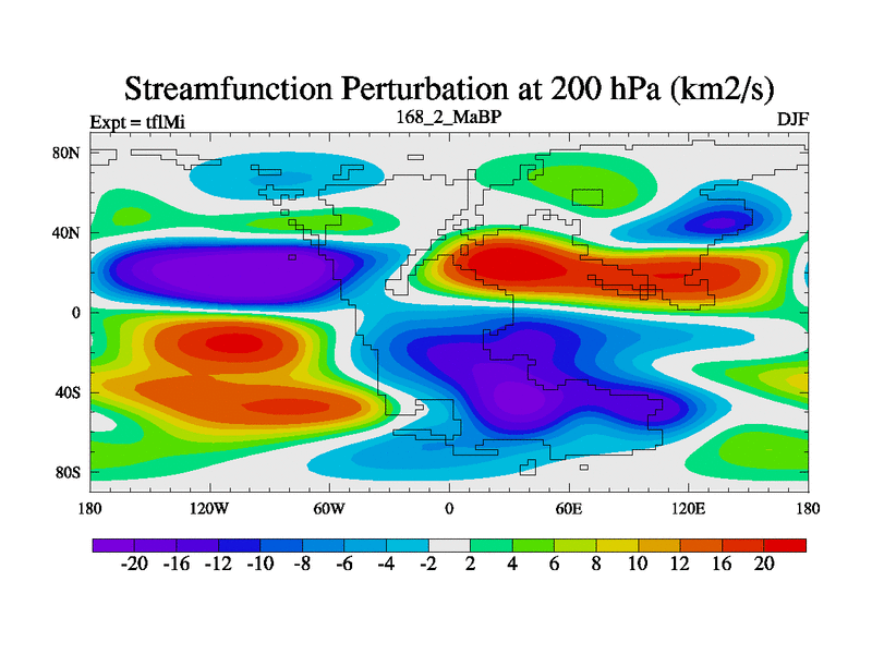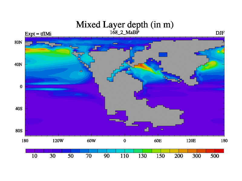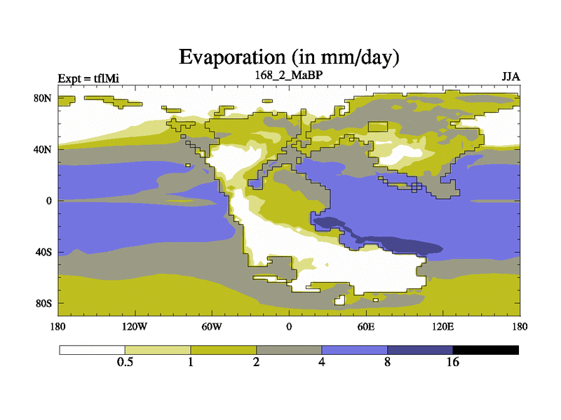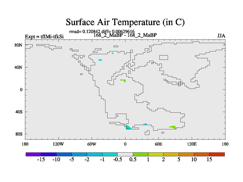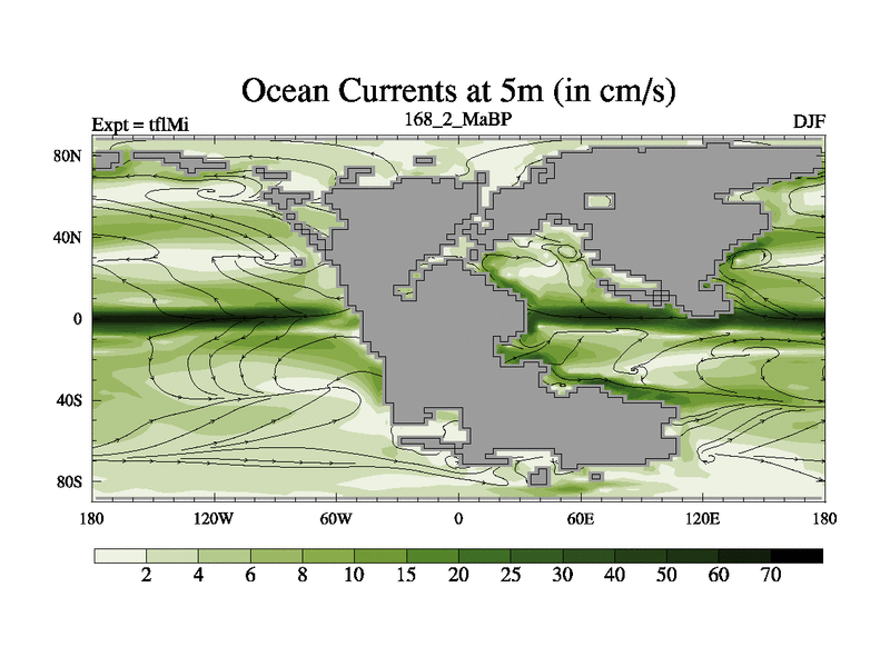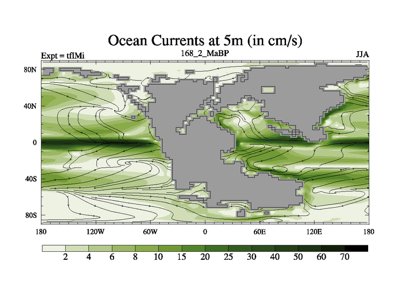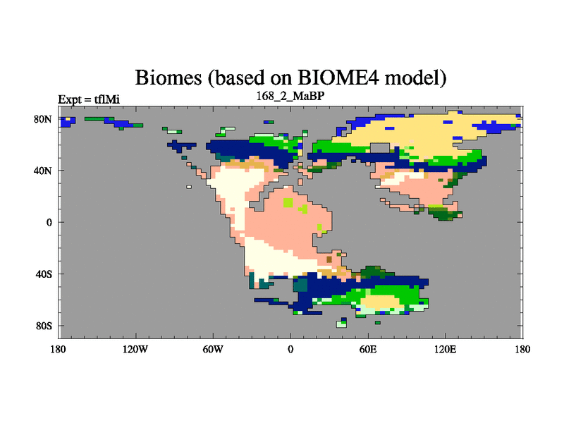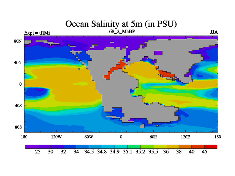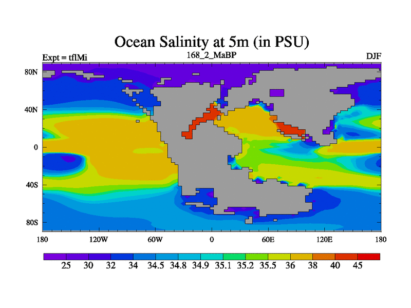 This is the 168.2 Ma simulation using the Scotese palaeogeographies and revised CCN etc. This version has islands and smoothing and desert albedo included. Tuned CO2 to give Scotese temperatures. Started from end of tfkSi. With JEDI output.