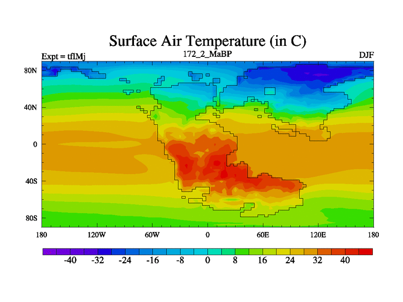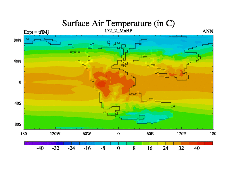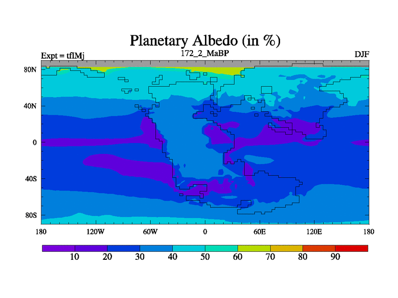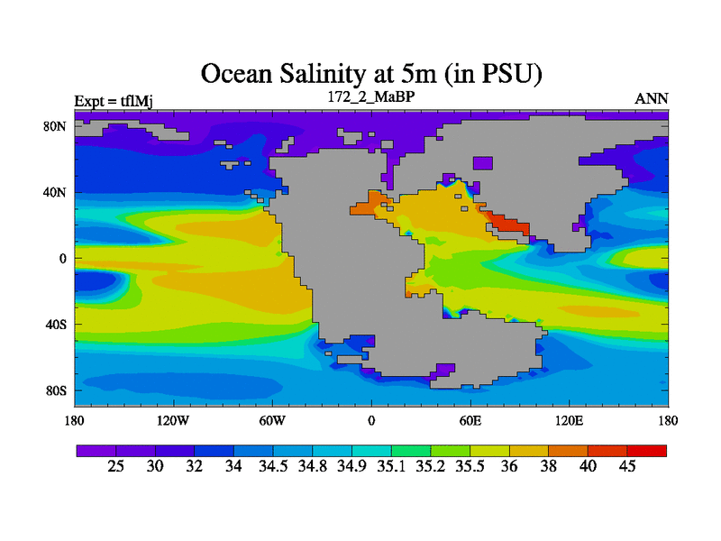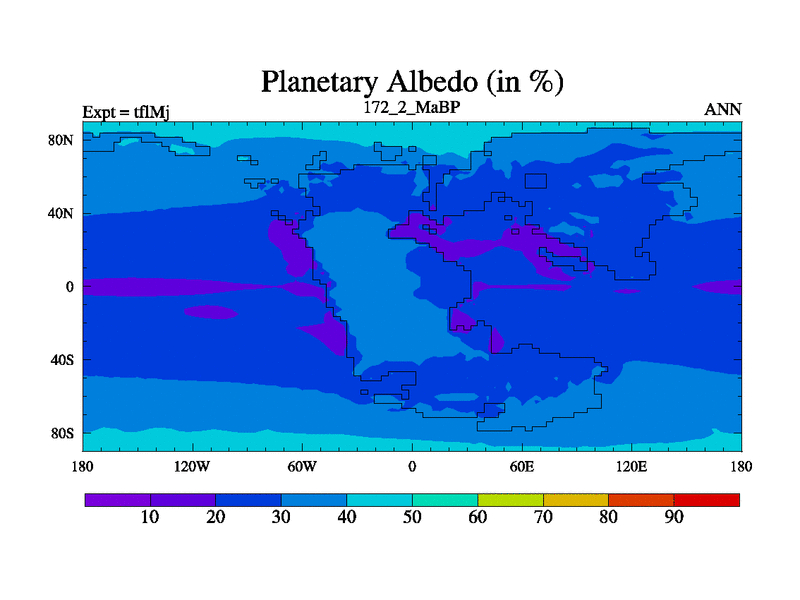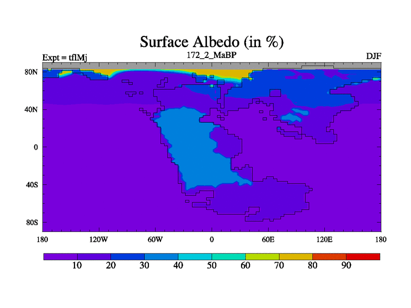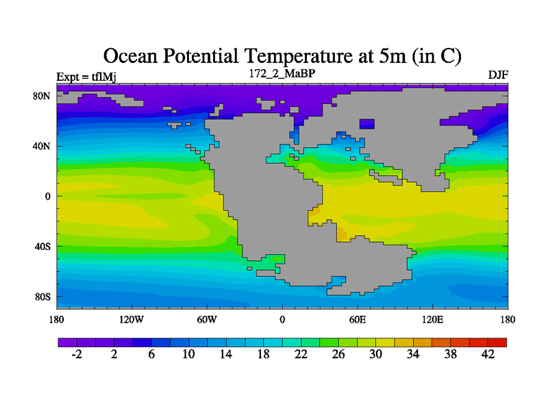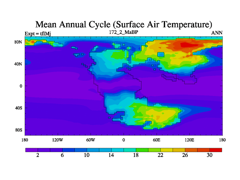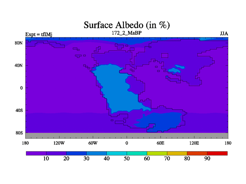 This is the 172.2 Ma simulation using the Scotese palaeogeographies and revised CCN etc. This version has islands and smoothing and desert albedo included. Tuned CO2 to give Scotese temperatures. Started from end of tfkSj. With JEDI output.