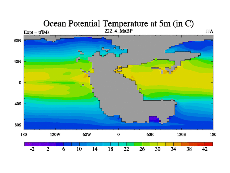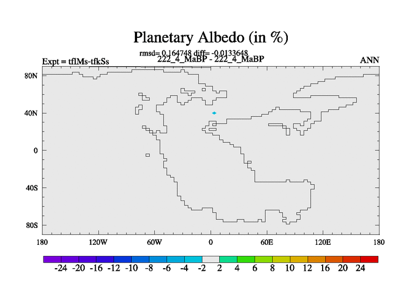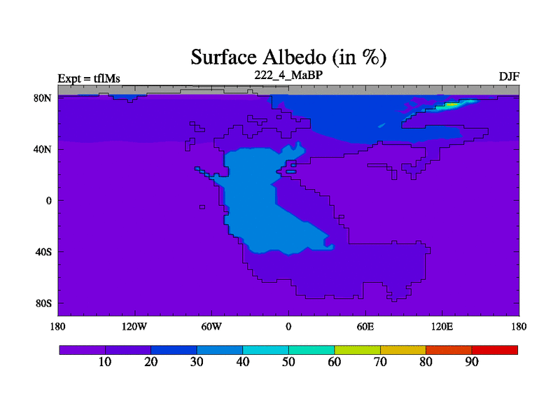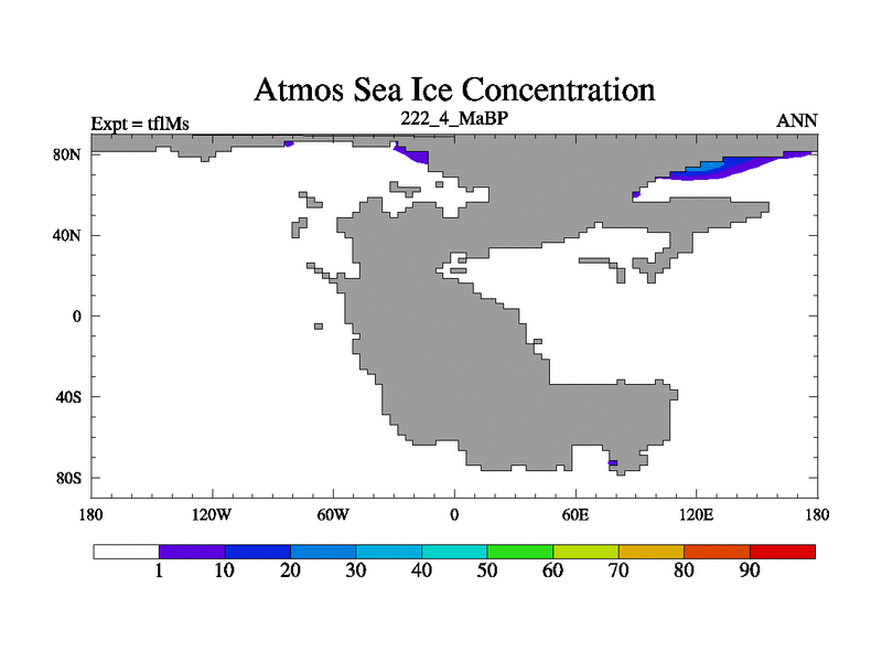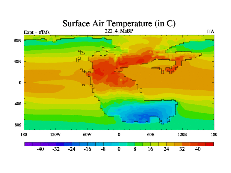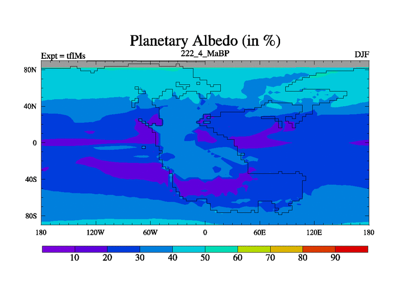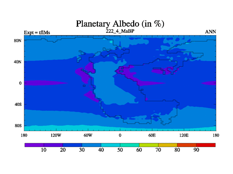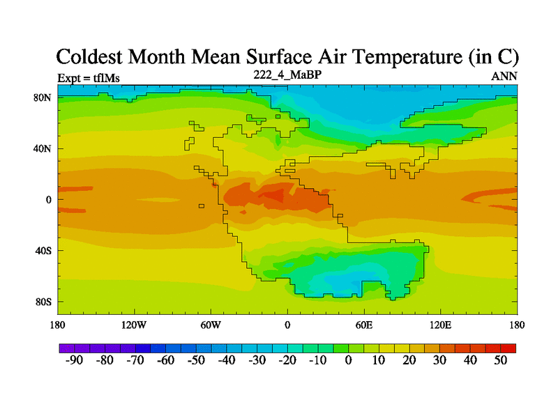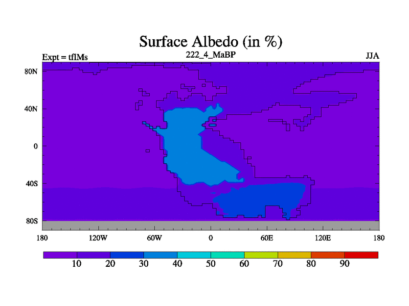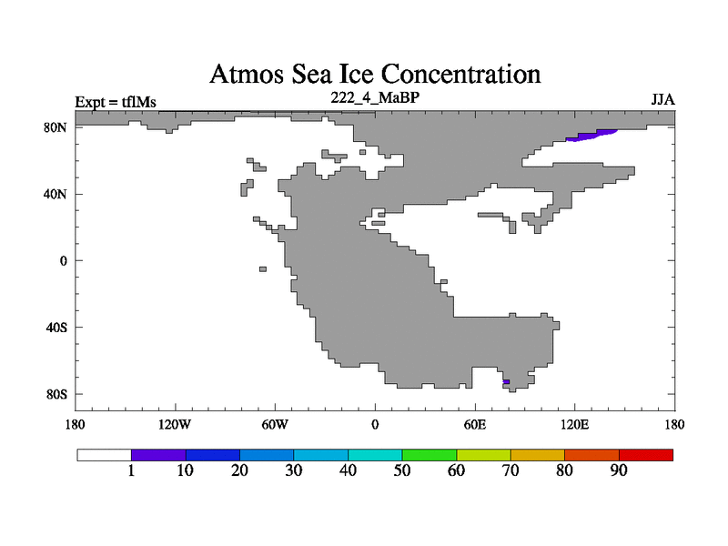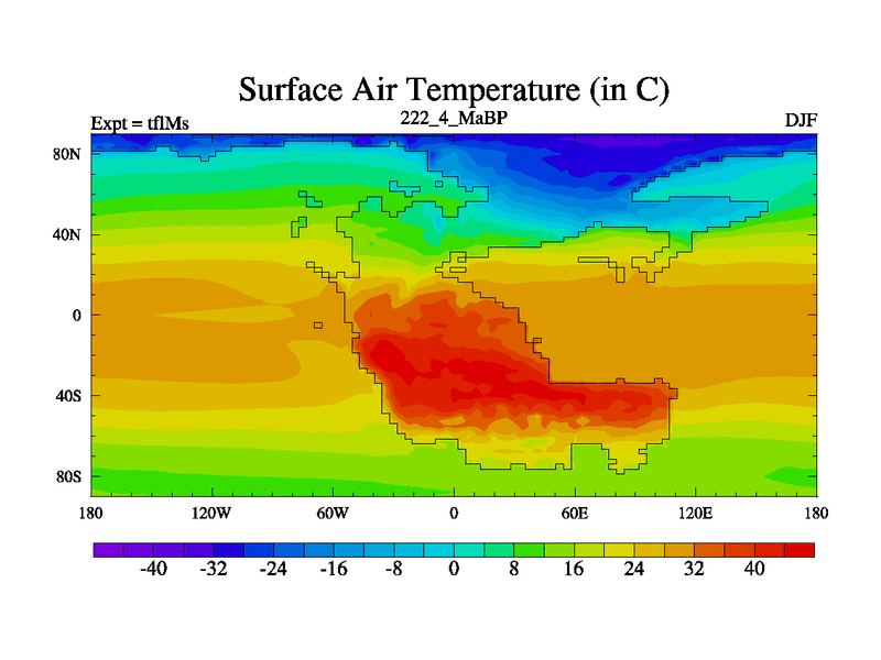 This is the 222.4 Ma simulation using the Scotese palaeogeographies and revised CCN etc. This version has islands and smoothing and desert albedo included. Tuned CO2 to give Scotese temperatures. Started from end of tfkSs. With JEDI output.