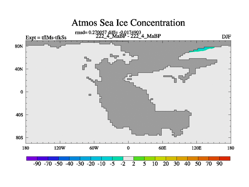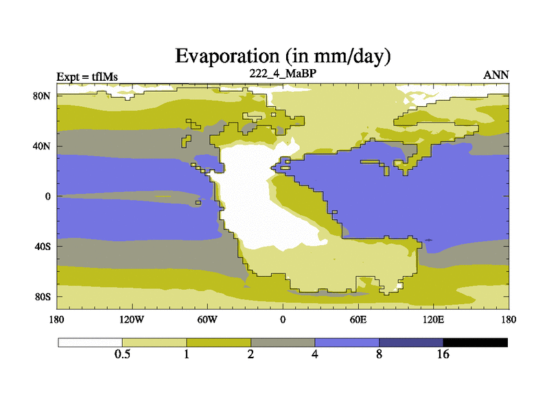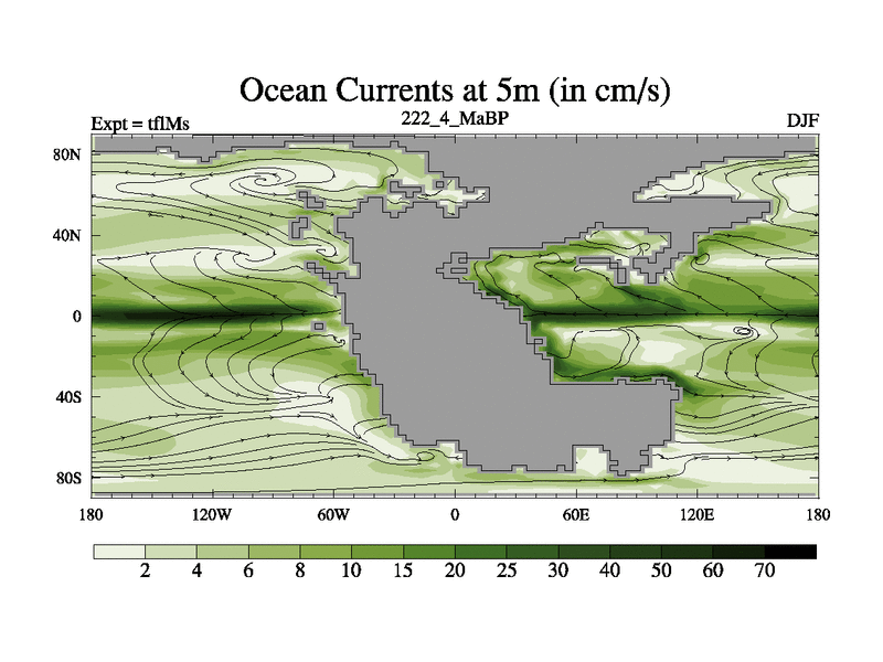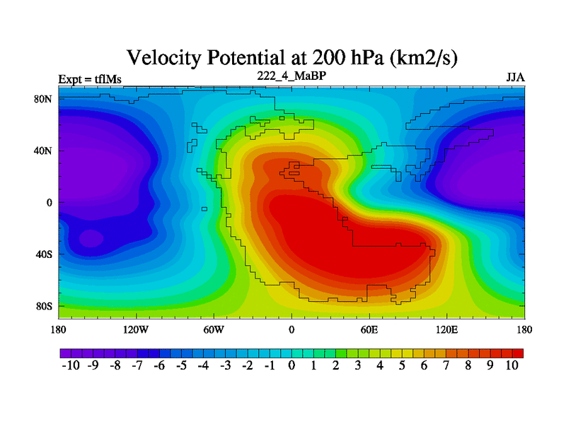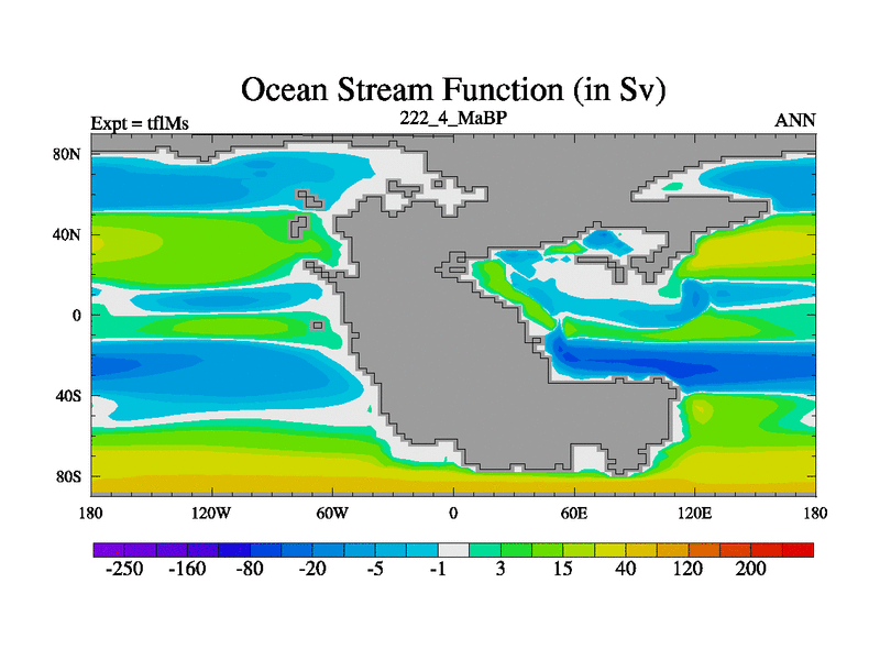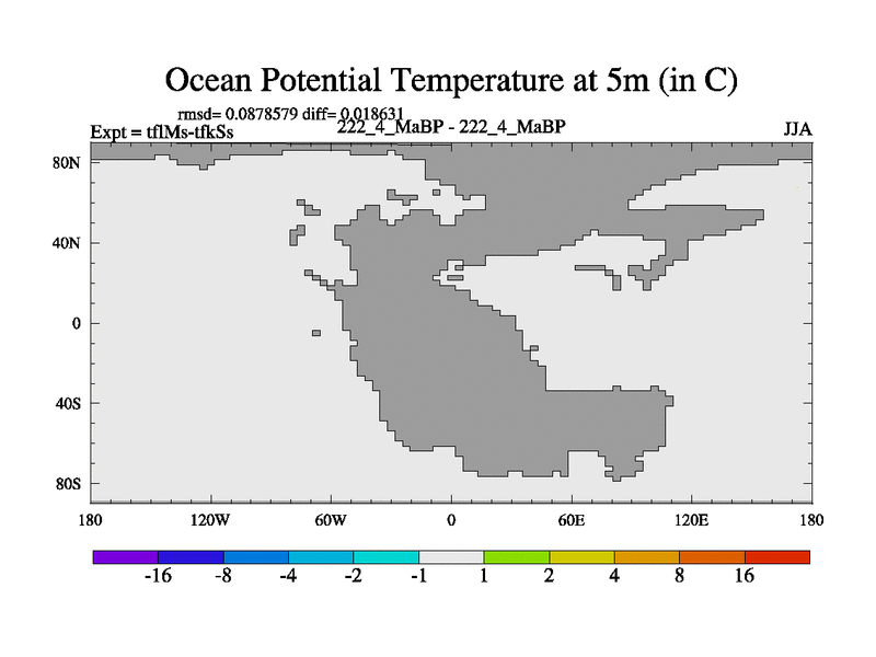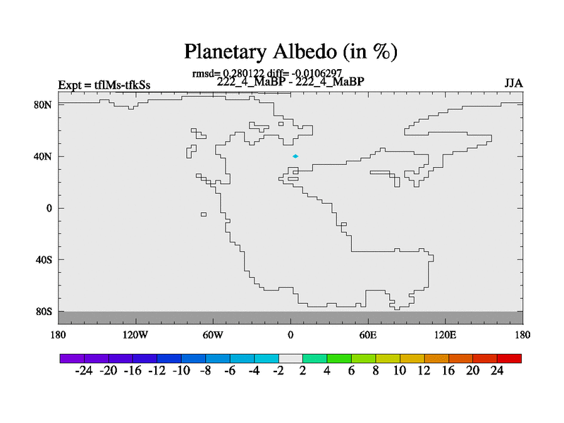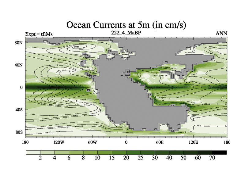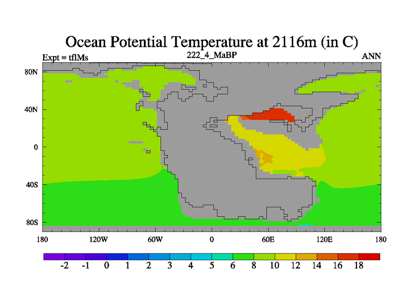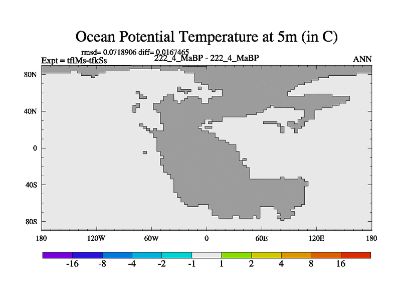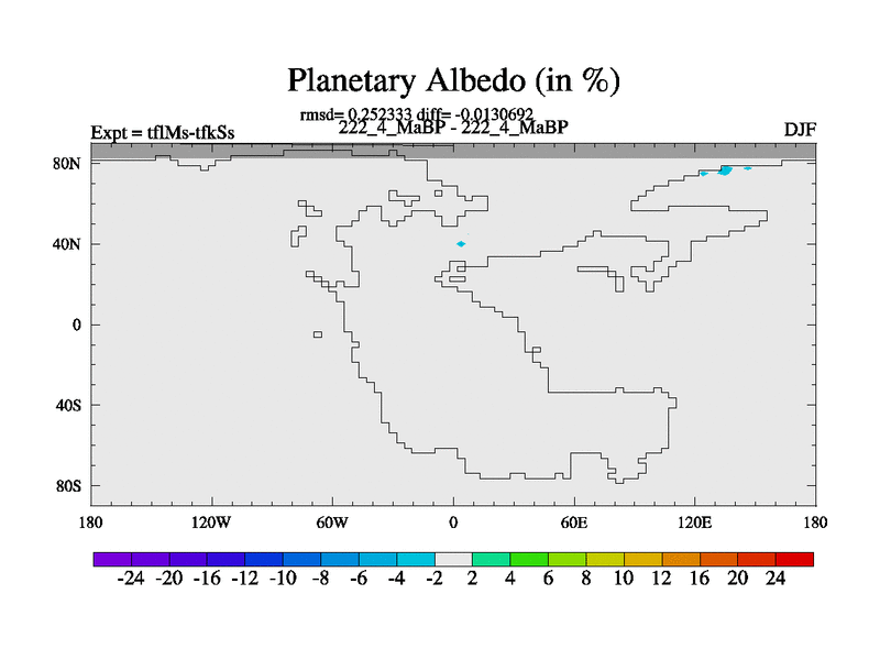 This is the 222.4 Ma simulation using the Scotese palaeogeographies and revised CCN etc. This version has islands and smoothing and desert albedo included. Tuned CO2 to give Scotese temperatures. Started from end of tfkSs. With JEDI output.