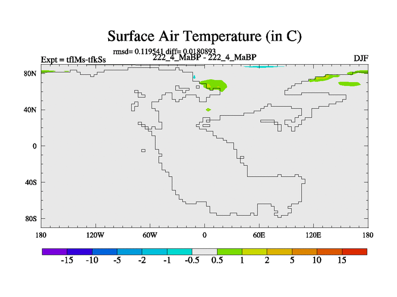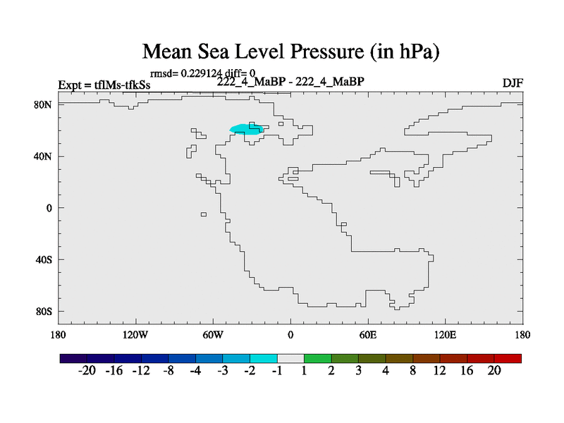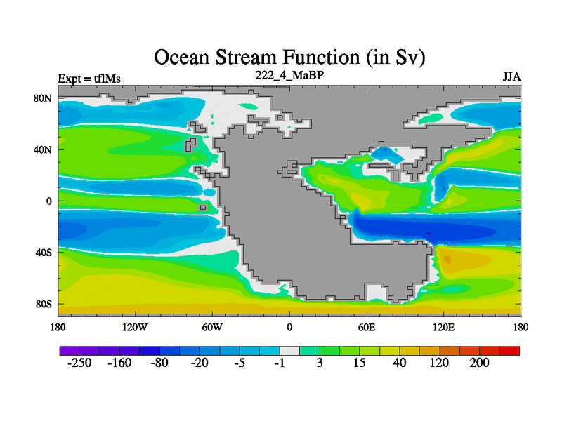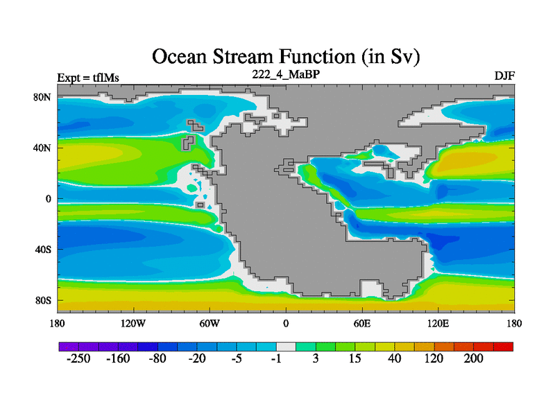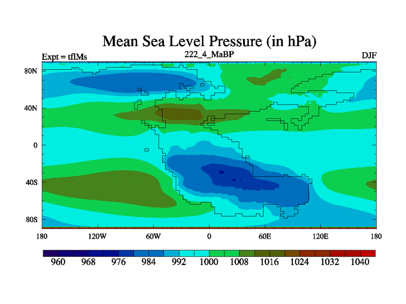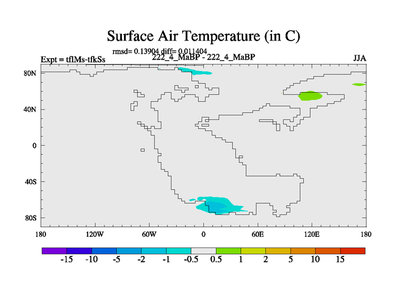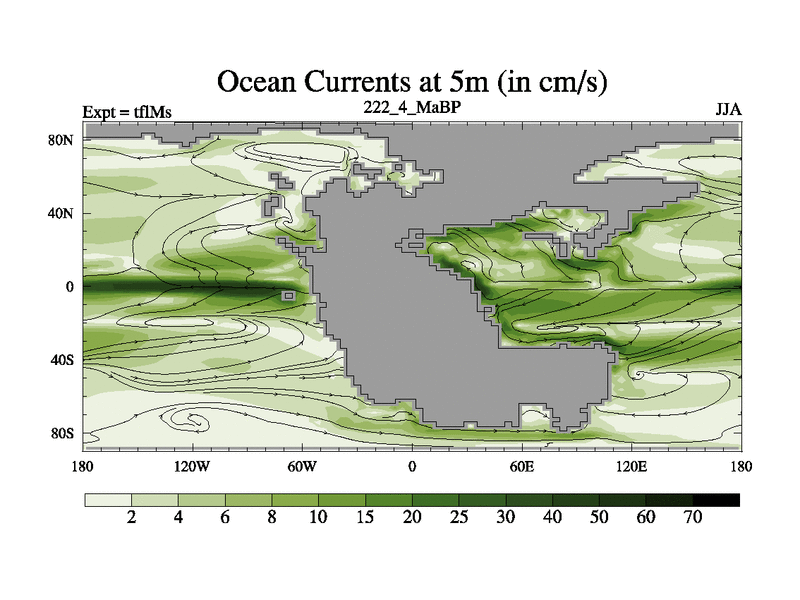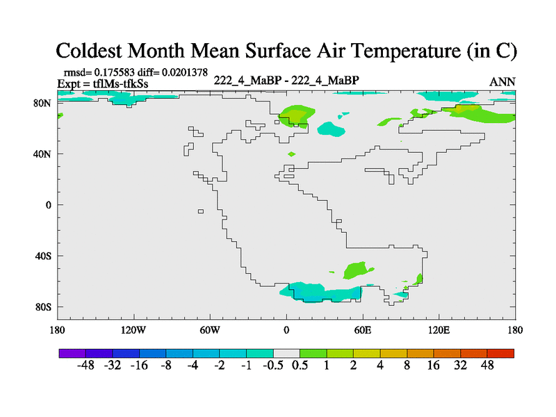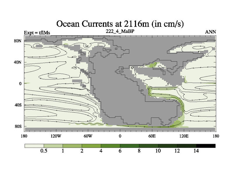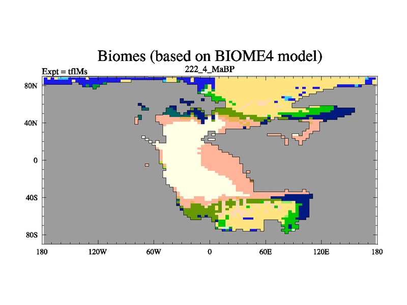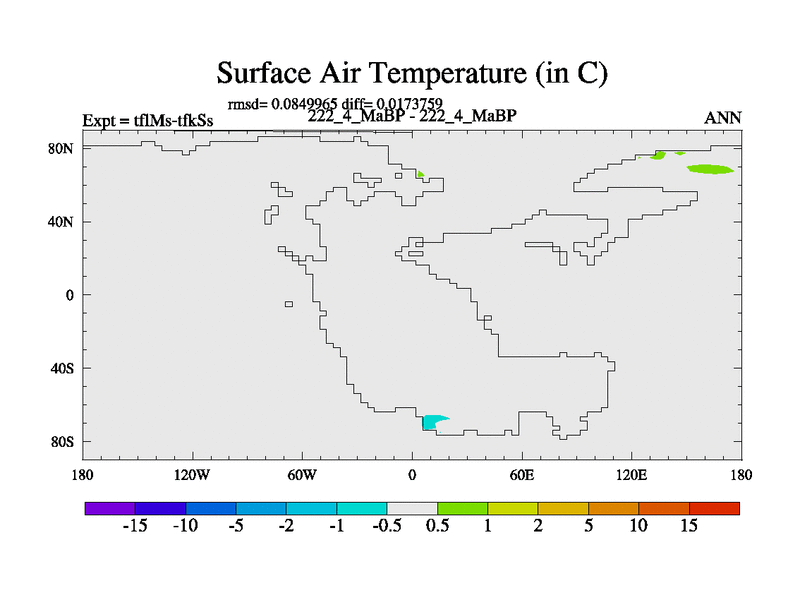 This is the 222.4 Ma simulation using the Scotese palaeogeographies and revised CCN etc. This version has islands and smoothing and desert albedo included. Tuned CO2 to give Scotese temperatures. Started from end of tfkSs. With JEDI output.