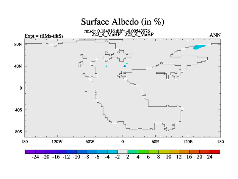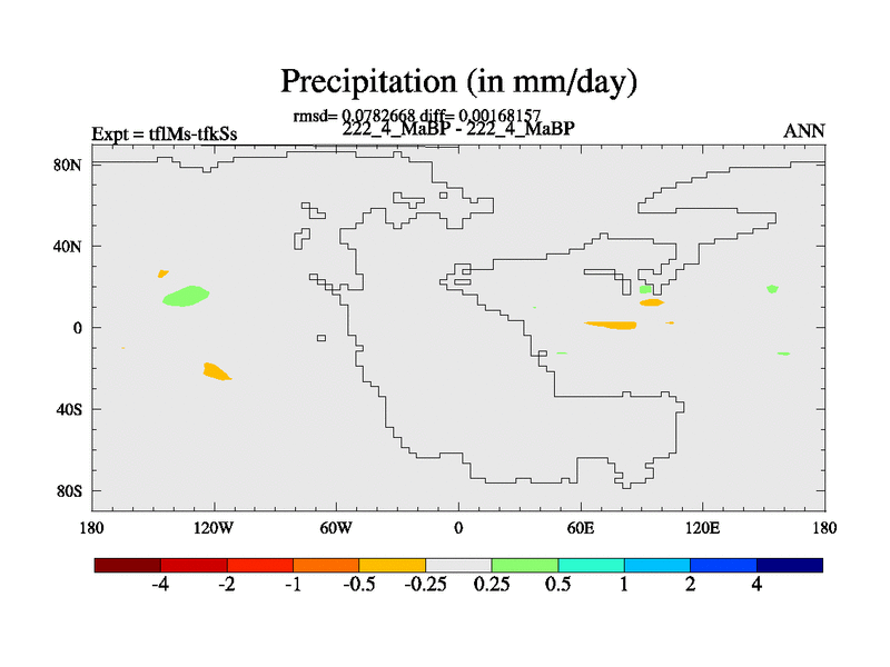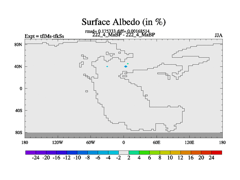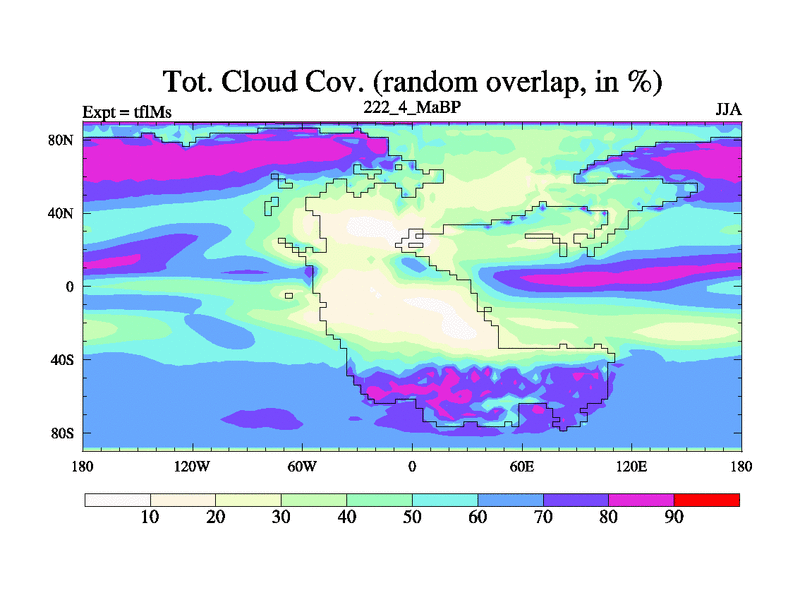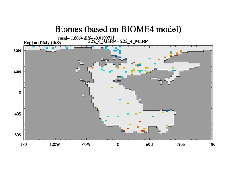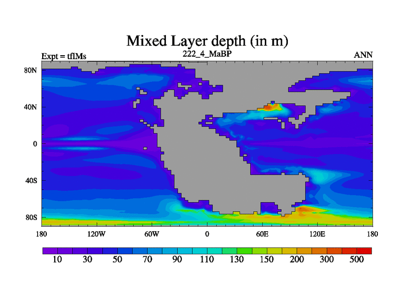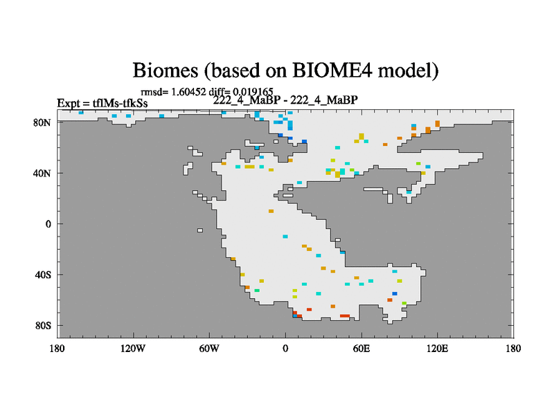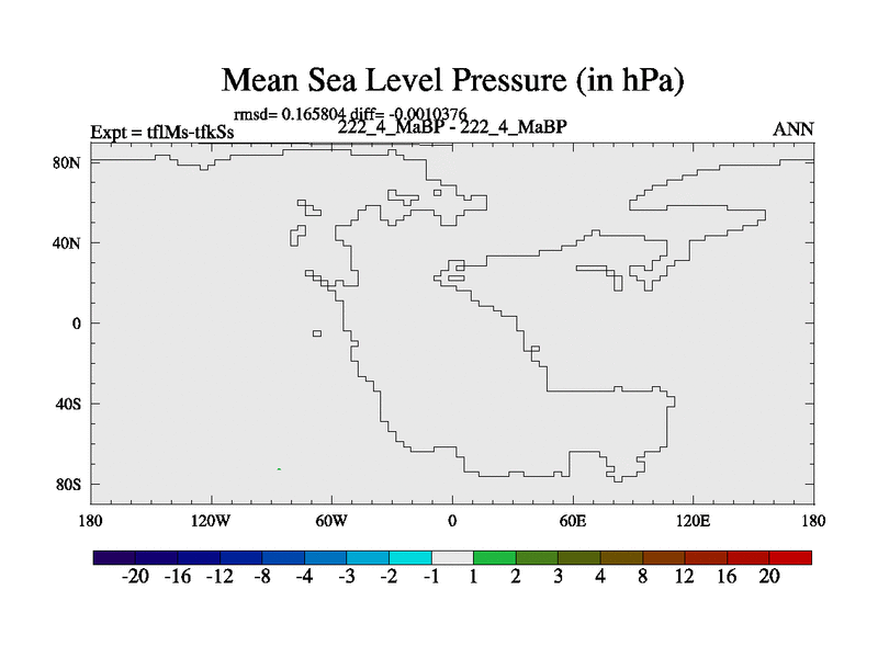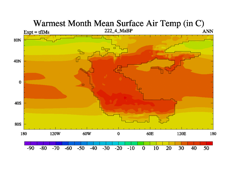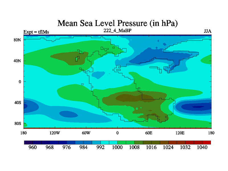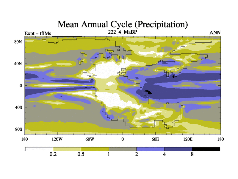 This is the 222.4 Ma simulation using the Scotese palaeogeographies and revised CCN etc. This version has islands and smoothing and desert albedo included. Tuned CO2 to give Scotese temperatures. Started from end of tfkSs. With JEDI output.