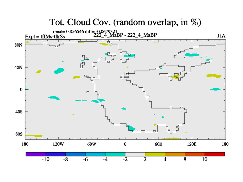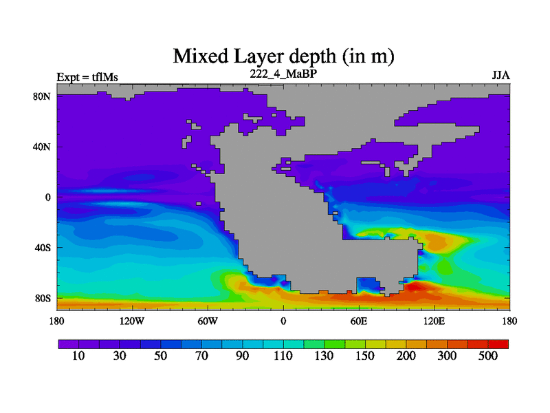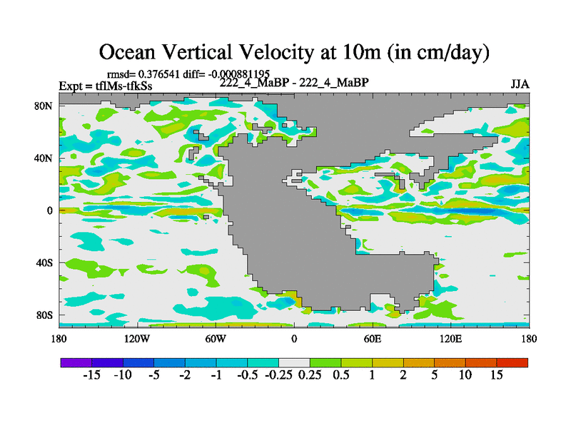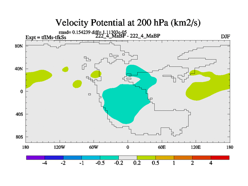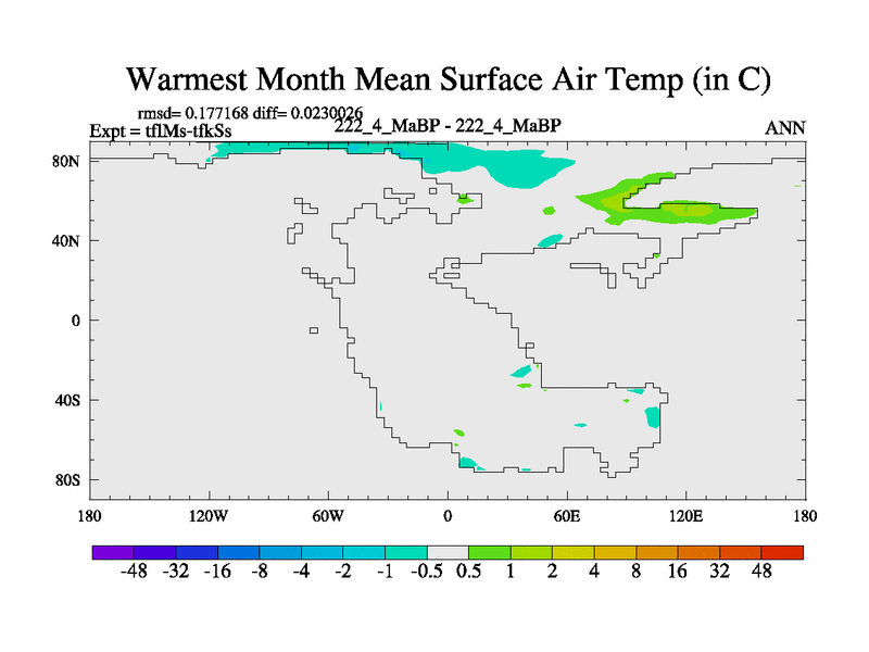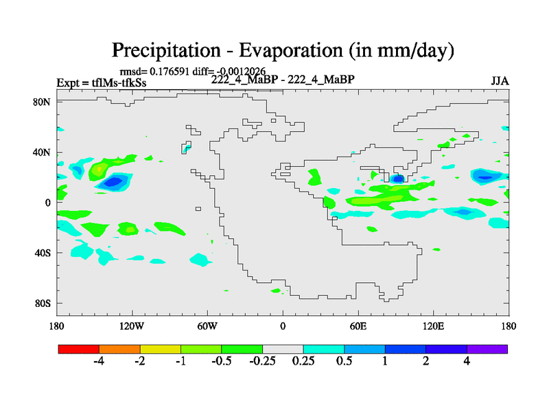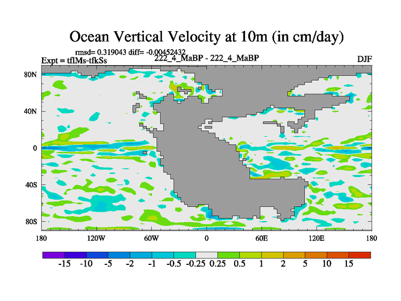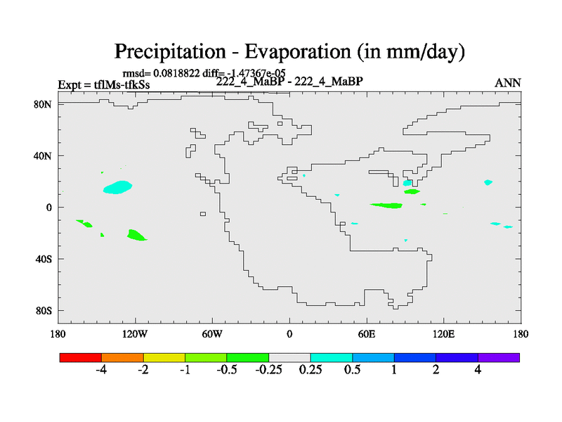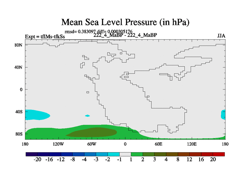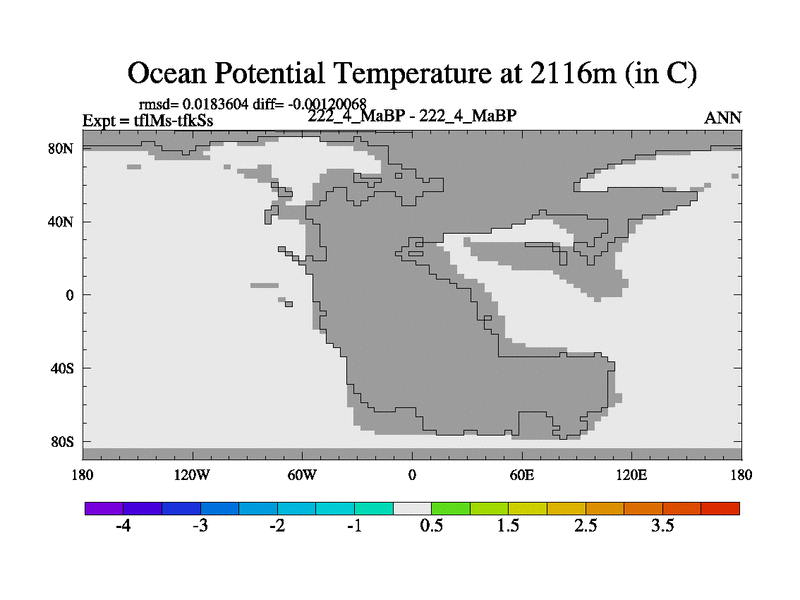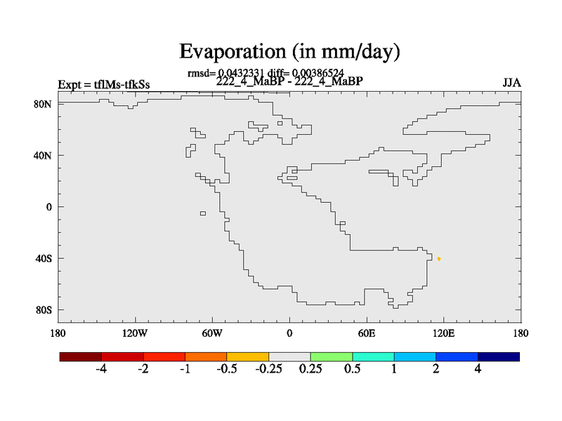 This is the 222.4 Ma simulation using the Scotese palaeogeographies and revised CCN etc. This version has islands and smoothing and desert albedo included. Tuned CO2 to give Scotese temperatures. Started from end of tfkSs. With JEDI output.