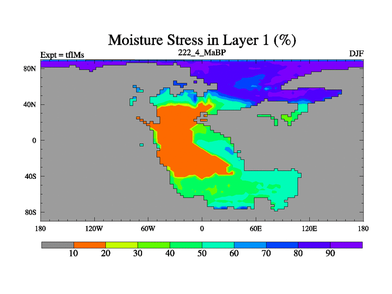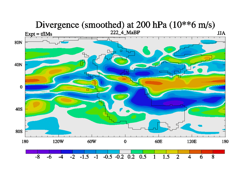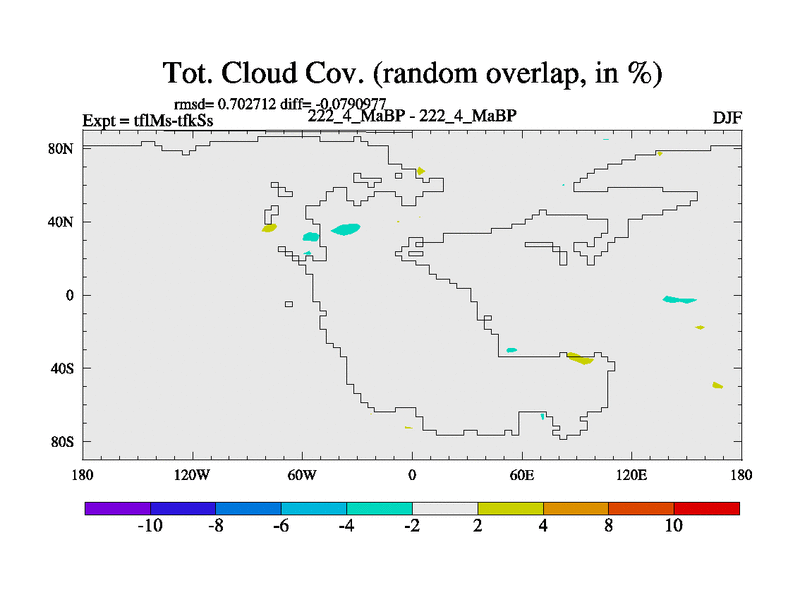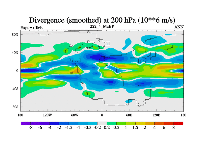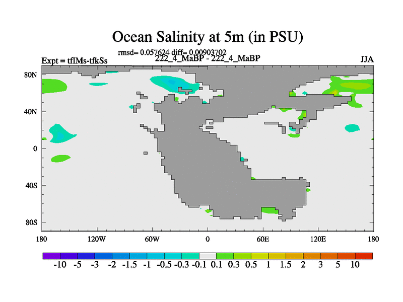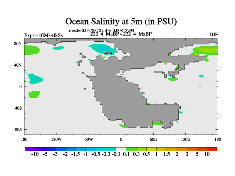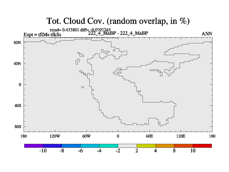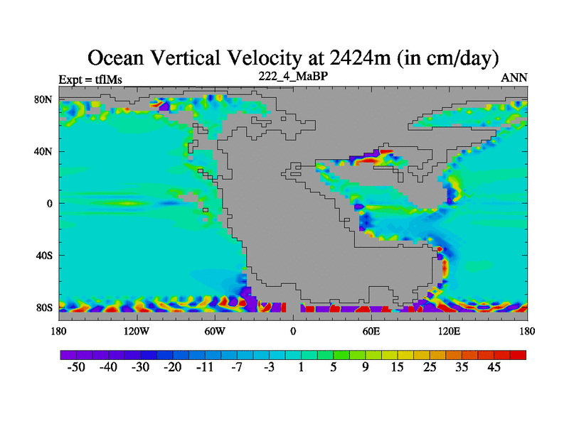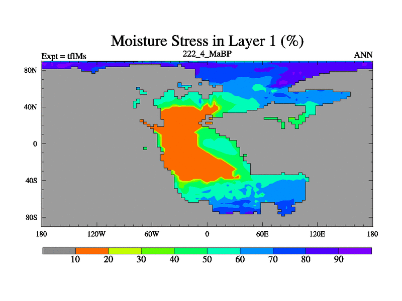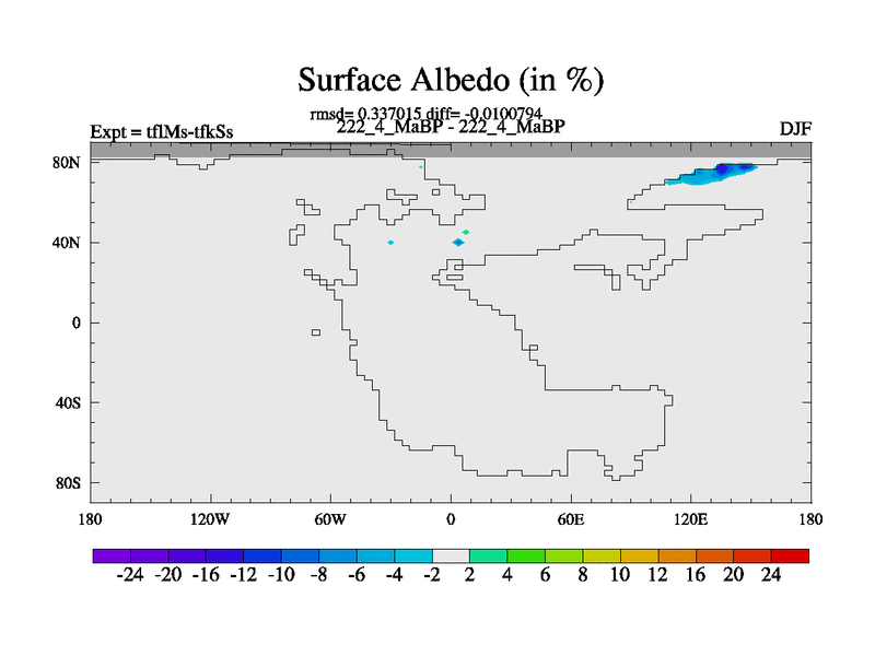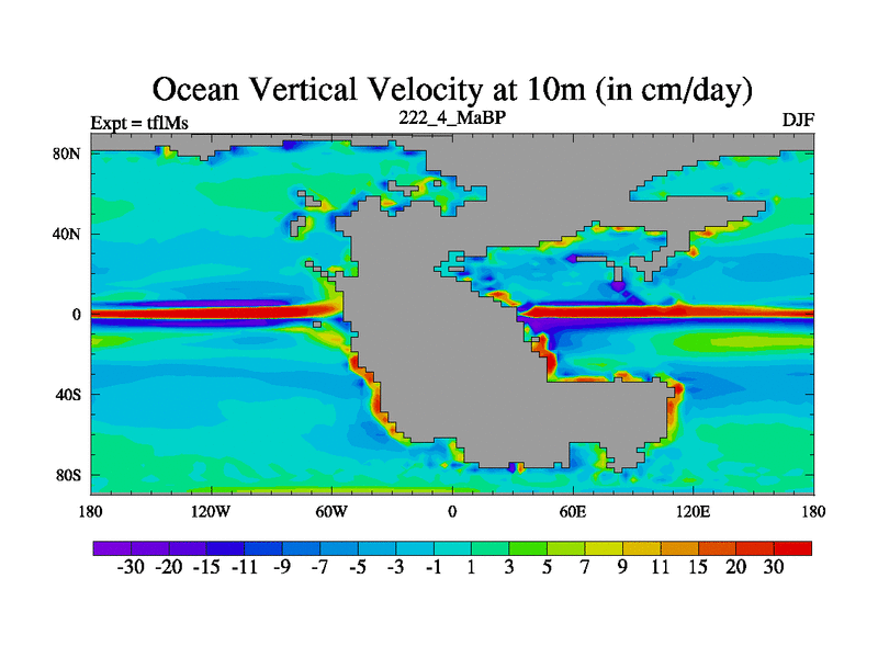 This is the 222.4 Ma simulation using the Scotese palaeogeographies and revised CCN etc. This version has islands and smoothing and desert albedo included. Tuned CO2 to give Scotese temperatures. Started from end of tfkSs. With JEDI output.