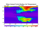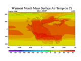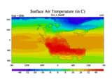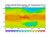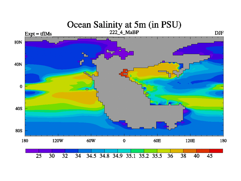 Scientifically as benchmark except using water age update, dark respiration, salinity conservation and revised ozone. Also using new orbital and solar update, and outputting leaf CO2. This version has islands included and atmospheric smoothing and desert albedo. Tuned CO2 to give Scotese temperatures. Started from end of tfkSs. With JEDI output.
