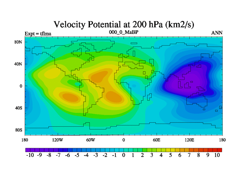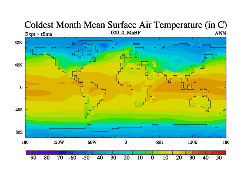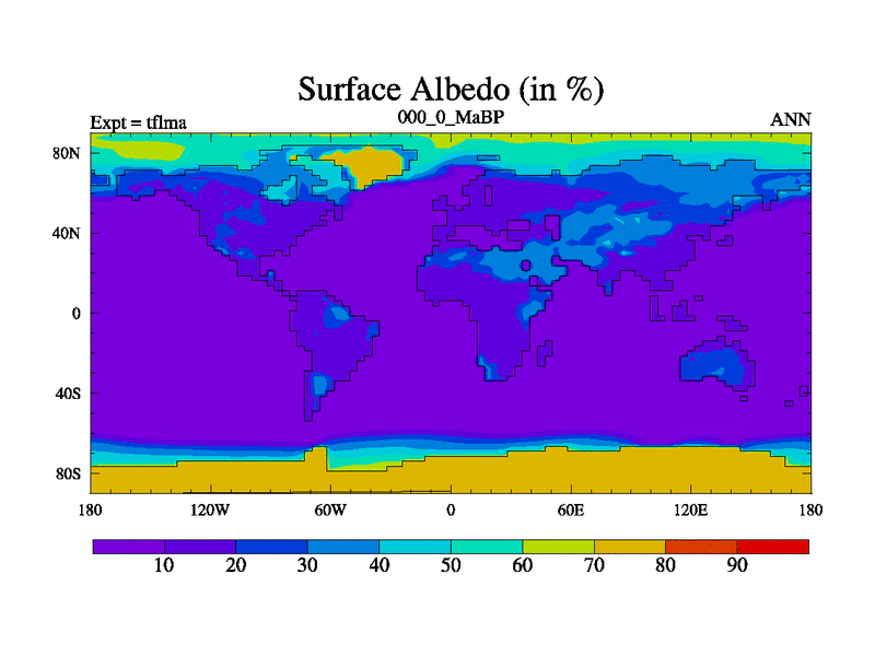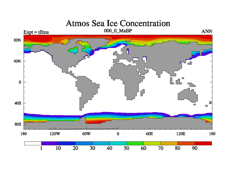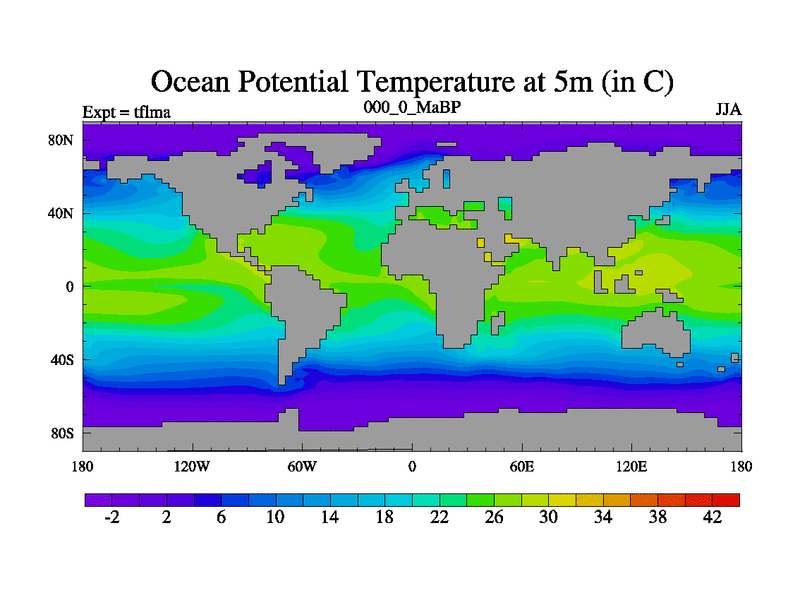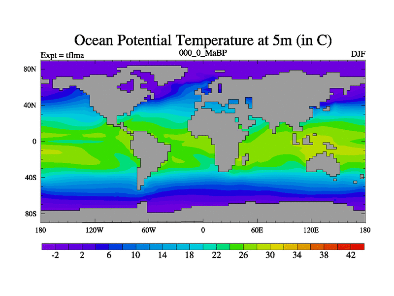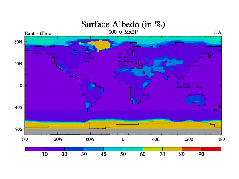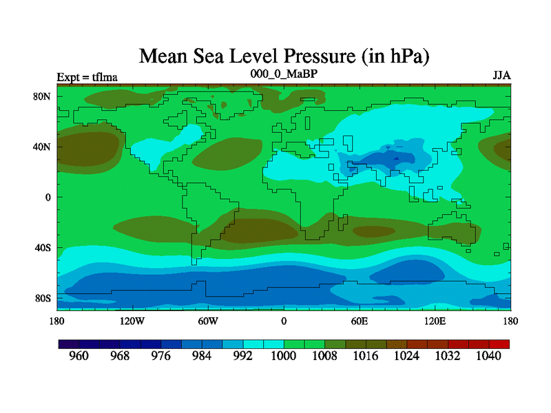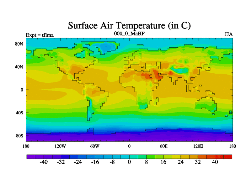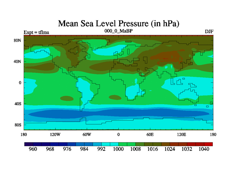 This is the 0.0 Ma simulation using the Scotese palaeogeographies and revised CCN etc. This version has islands and smoothing and desert albedo included. Tuned CO2 to give Scotese temperatures. Started from end of tfksa. With JEDI output.