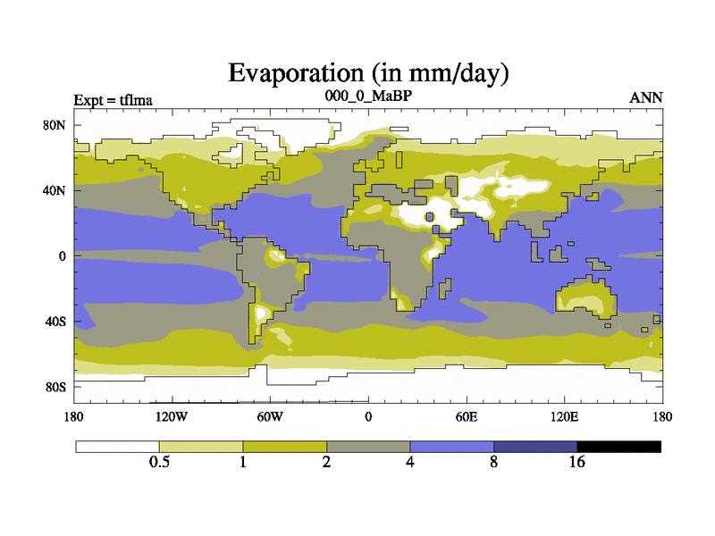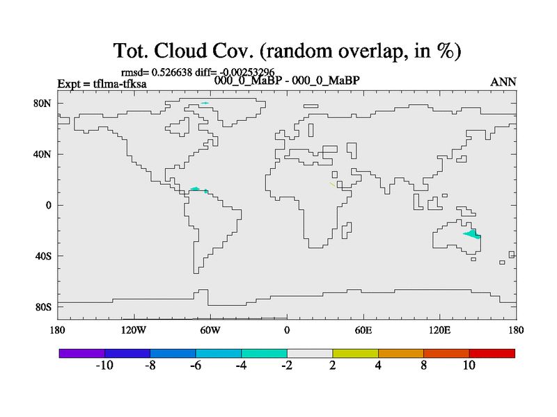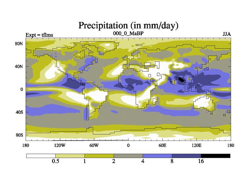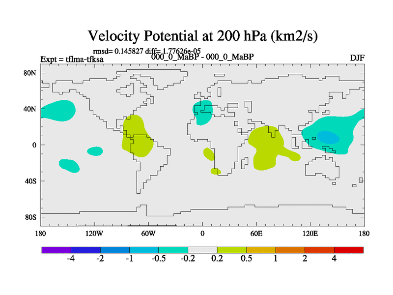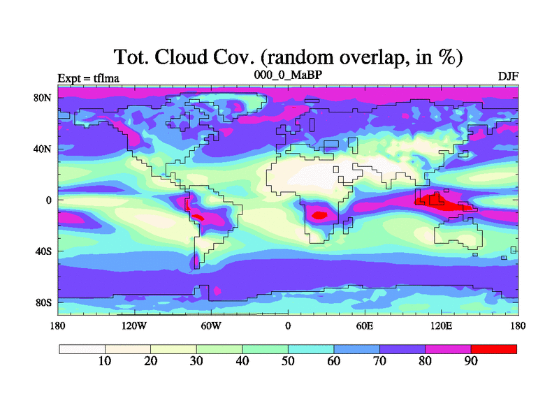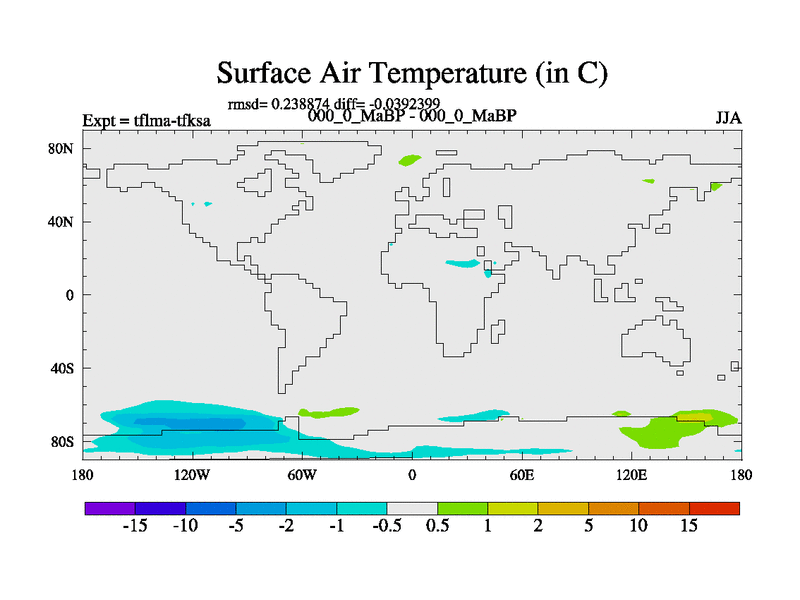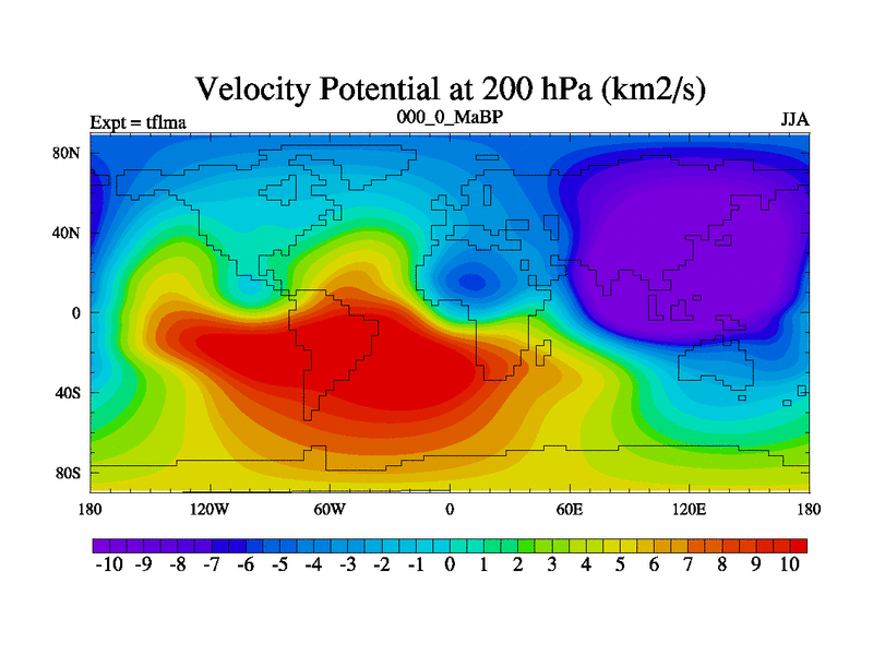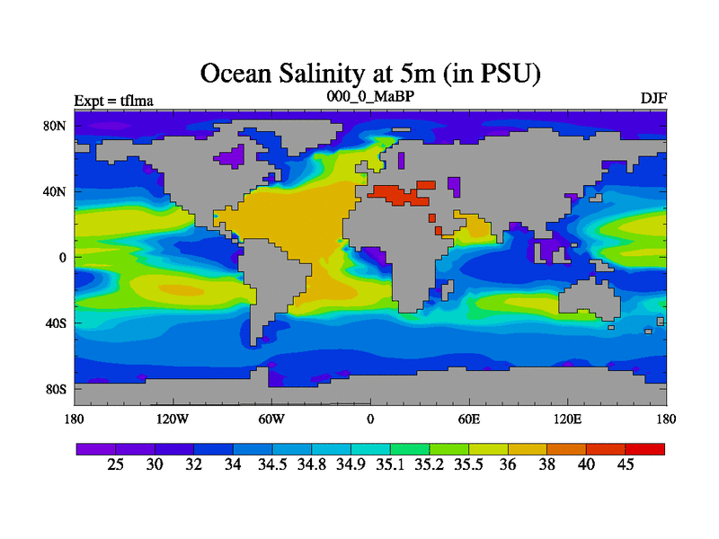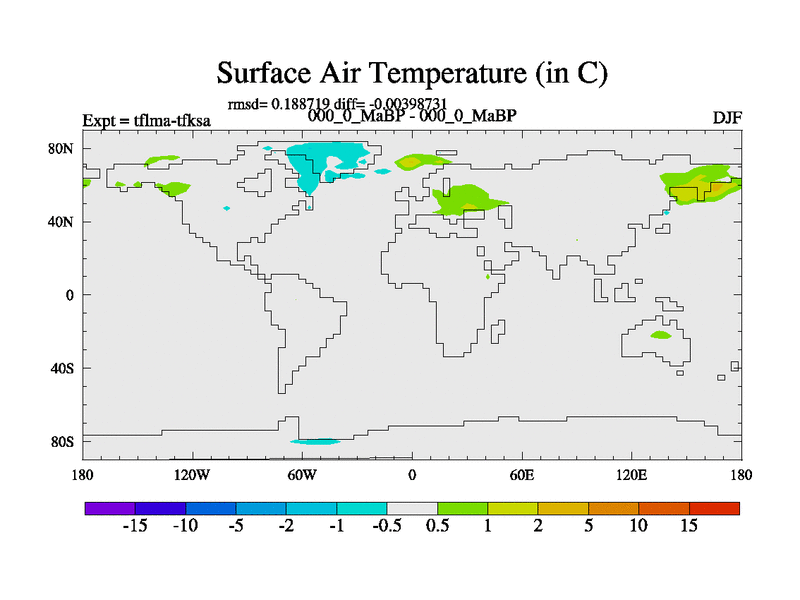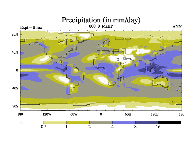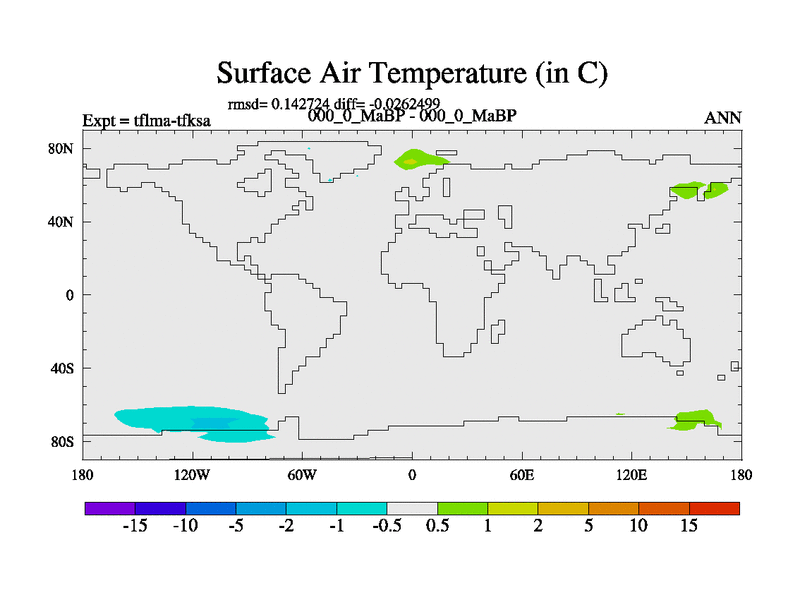 This is the 0.0 Ma simulation using the Scotese palaeogeographies and revised CCN etc. This version has islands and smoothing and desert albedo included. Tuned CO2 to give Scotese temperatures. Started from end of tfksa. With JEDI output.
