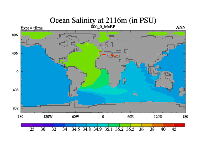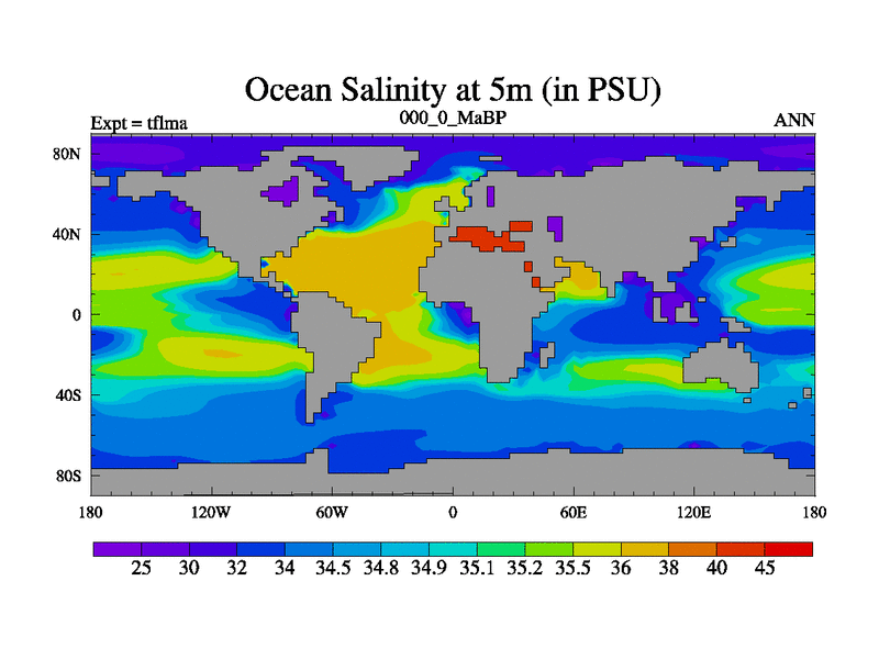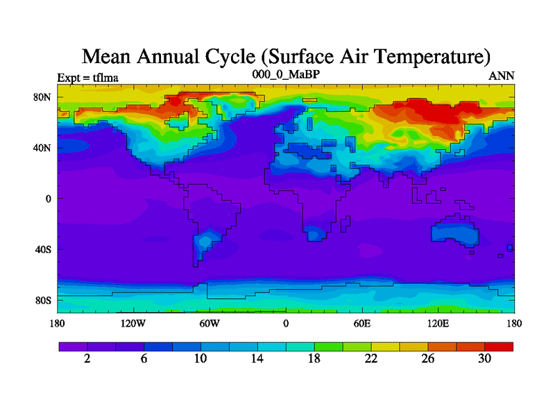 Scientifically as benchmark except using water age update, dark respiration, salinity conservation and revised ozone. Also using new orbital and solar update, and outputting leaf CO2. This version has islands included and atmospheric smoothing and desert albedo. Tuned CO2 to give Scotese temperatures. Started from end of tfksa. With JEDI output.