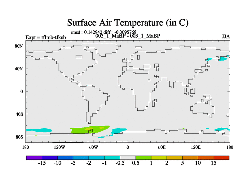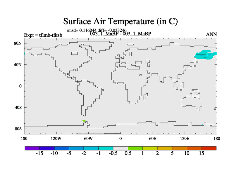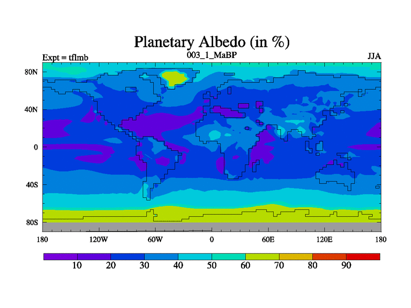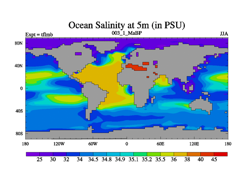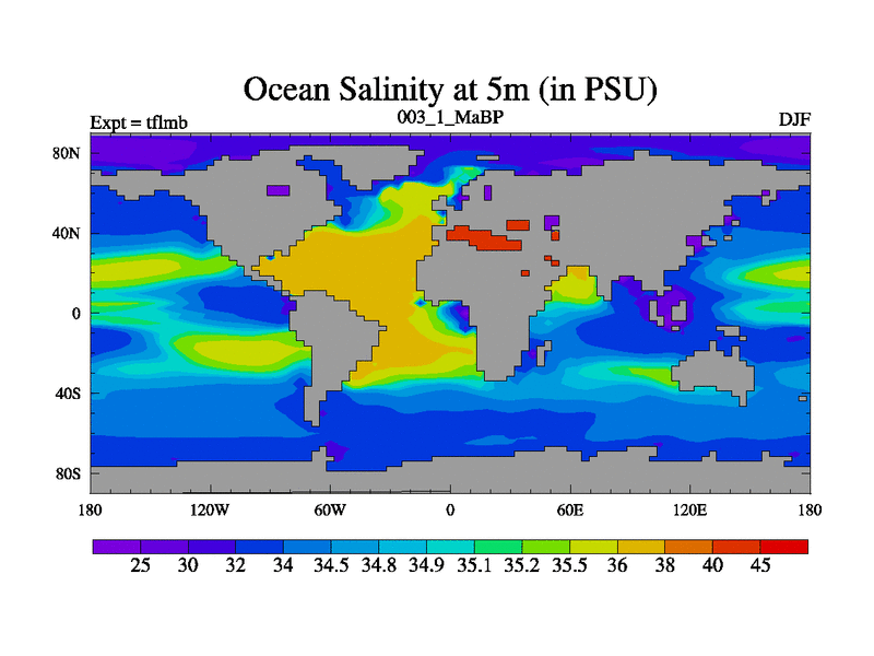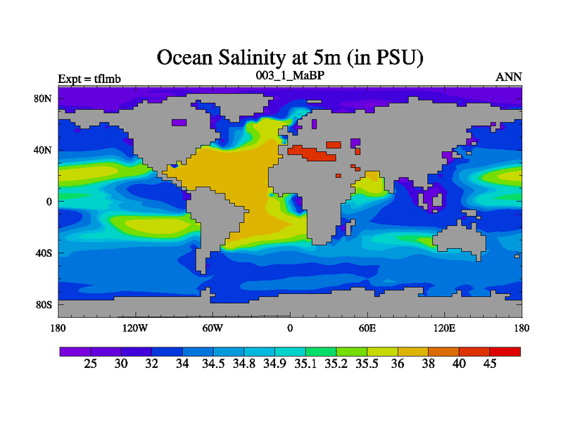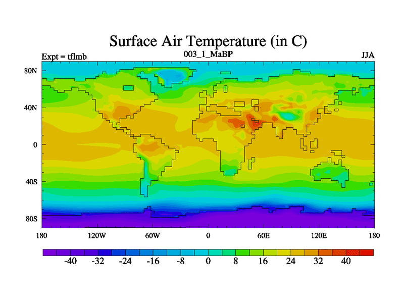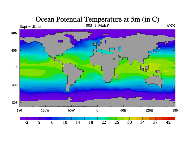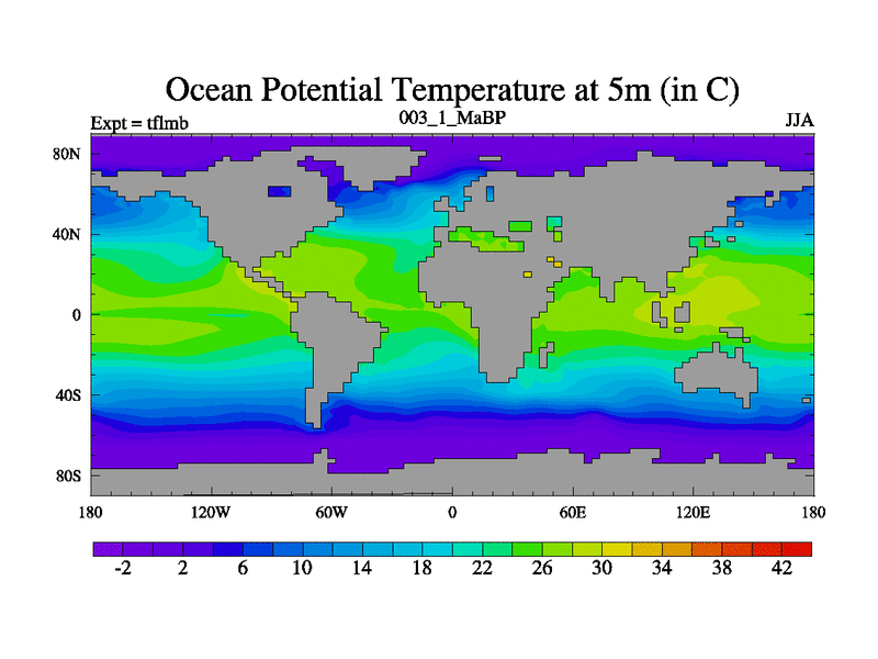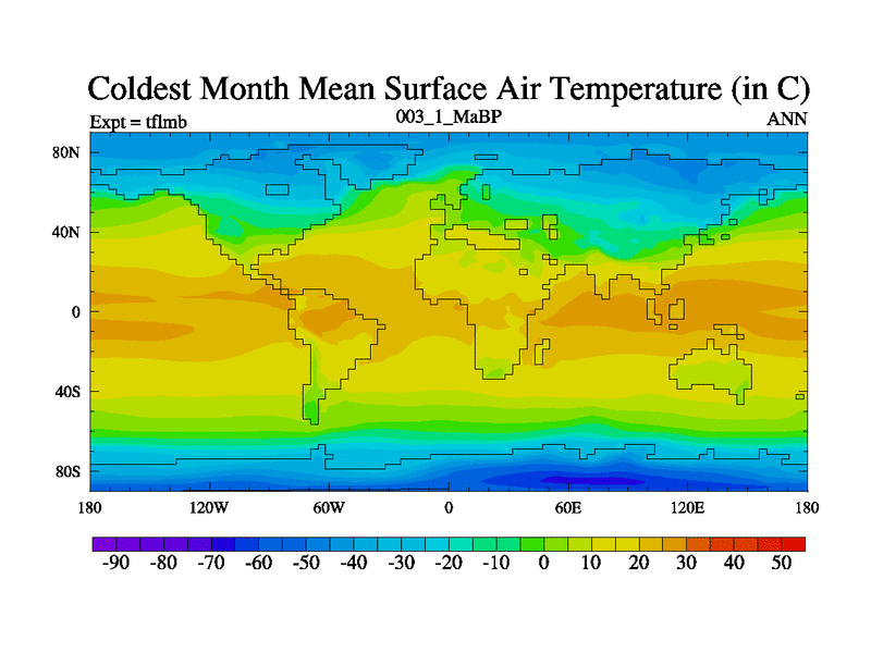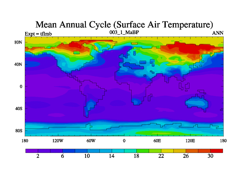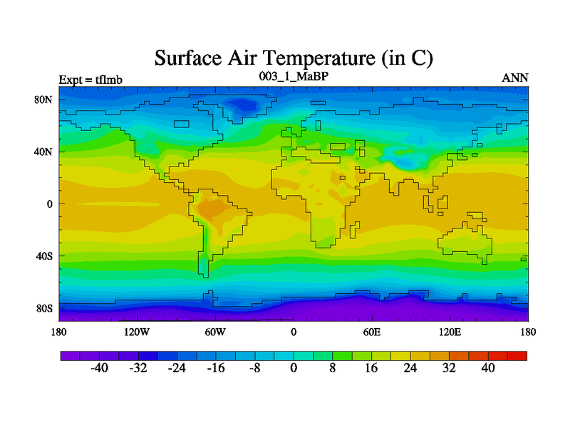 Scientifically as benchmark except using water age update, dark respiration, salinity conservation and revised ozone. Also using new orbital and solar update, and outputting leaf CO2. This version has islands included and atmospheric smoothing and desert albedo. Tuned CO2 to give Scotese temperatures. Started from end of tfksb. With JEDI output.