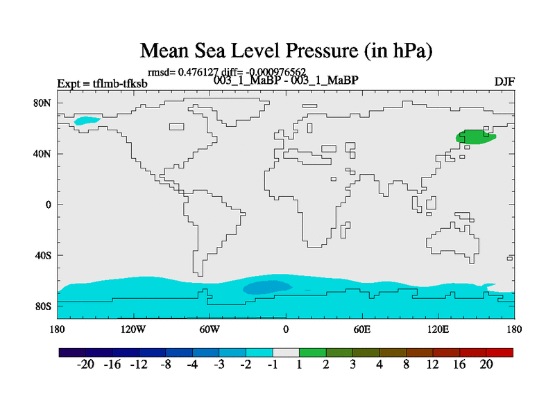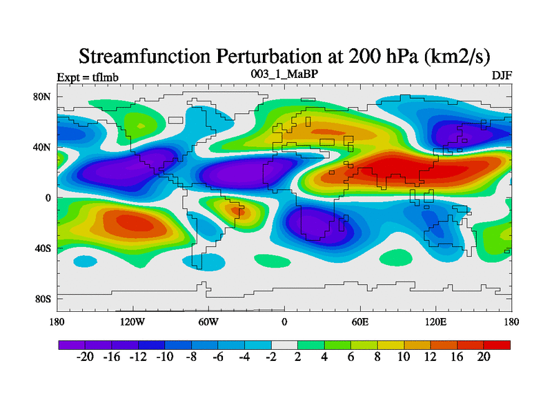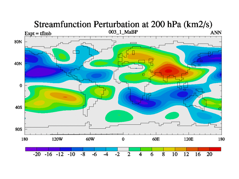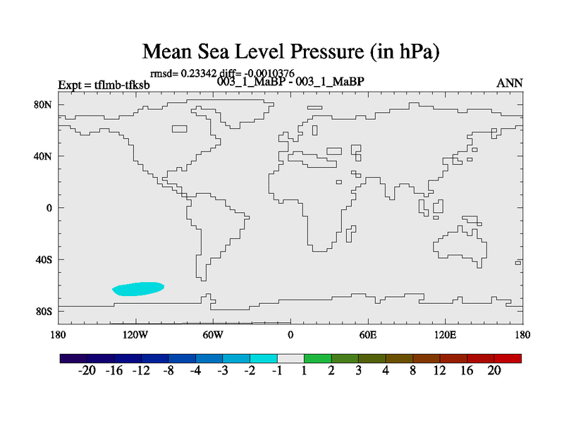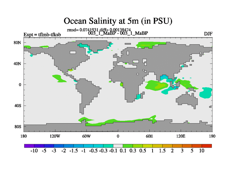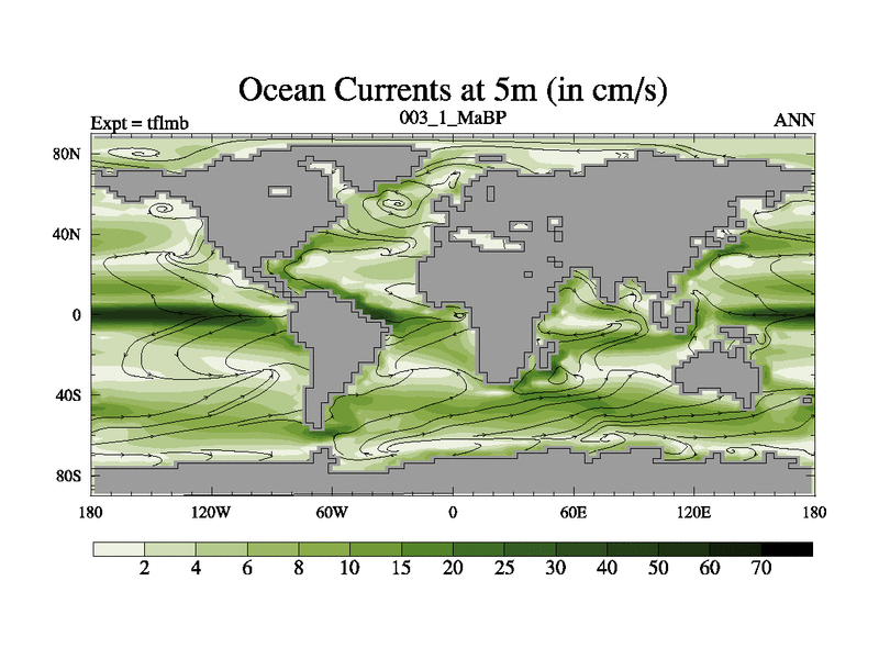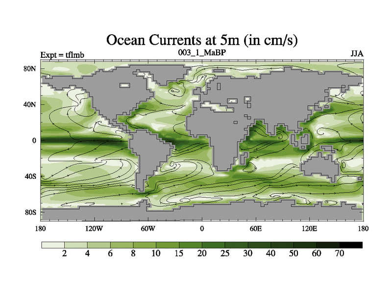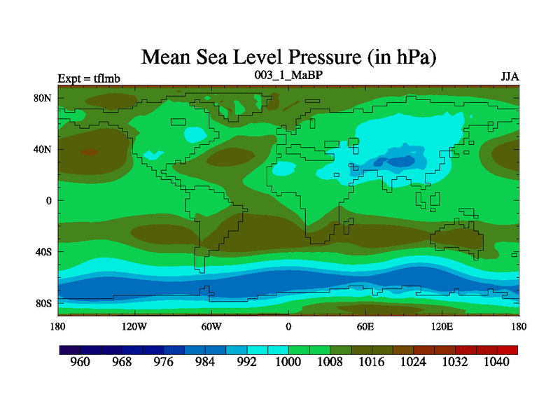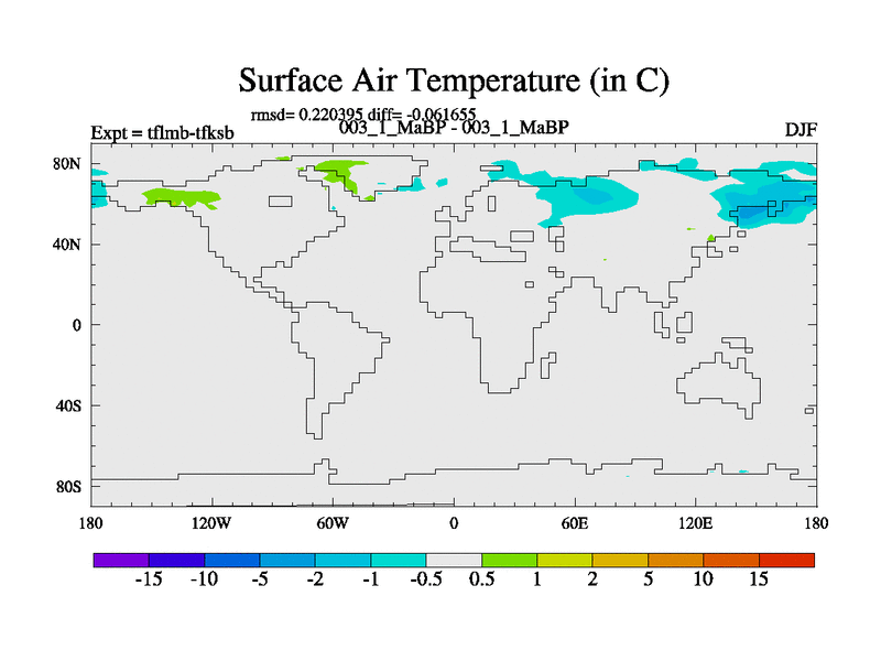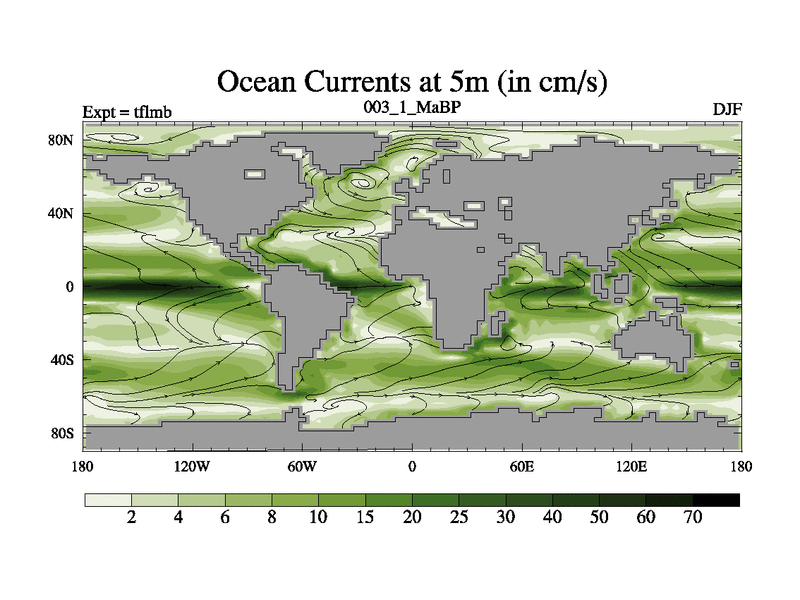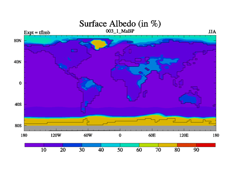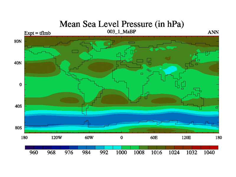 Scientifically as benchmark except using water age update, dark respiration, salinity conservation and revised ozone. Also using new orbital and solar update, and outputting leaf CO2. This version has islands included and atmospheric smoothing and desert albedo. Tuned CO2 to give Scotese temperatures. Started from end of tfksb. With JEDI output.