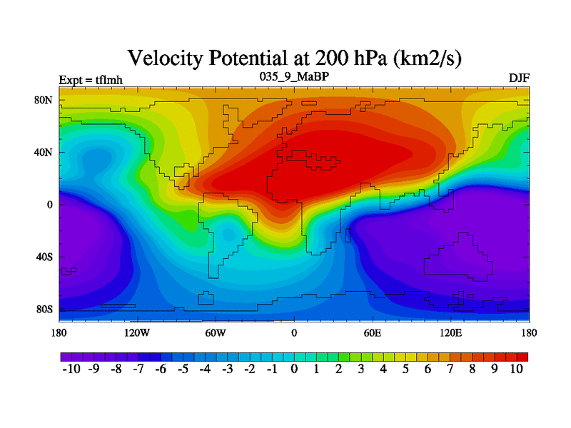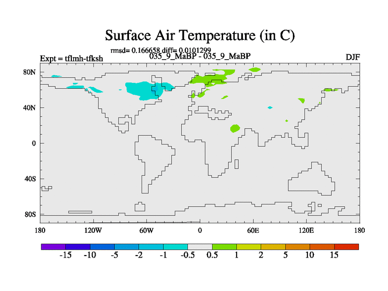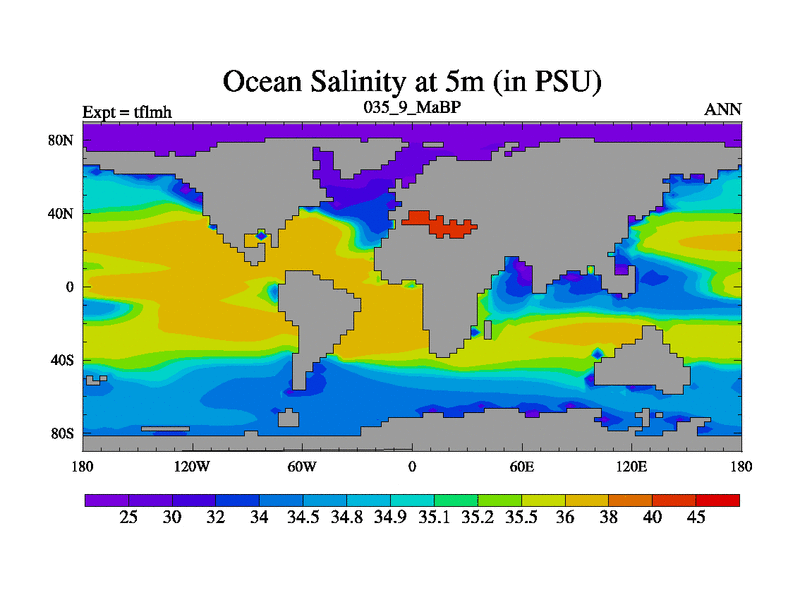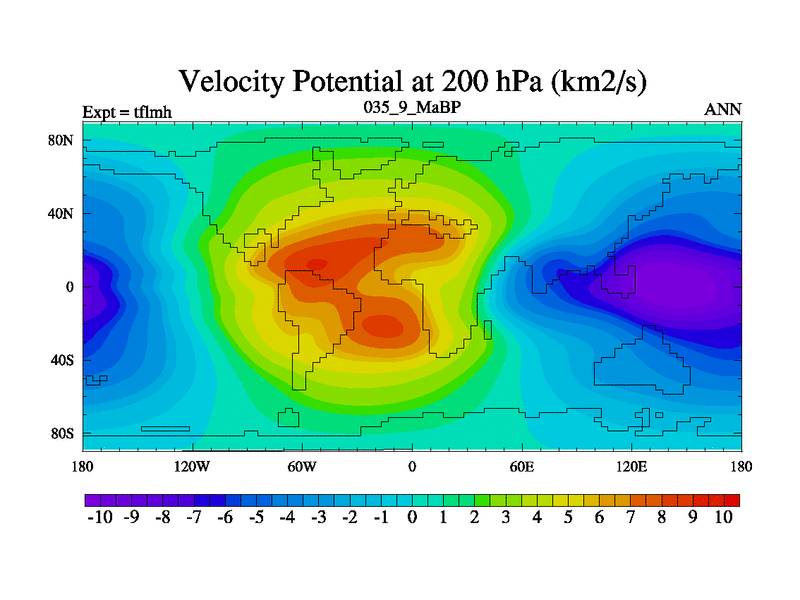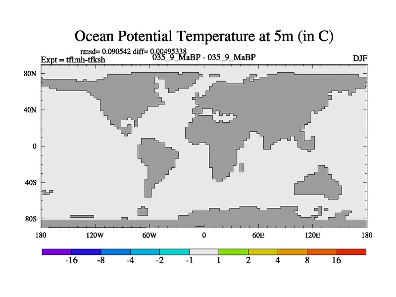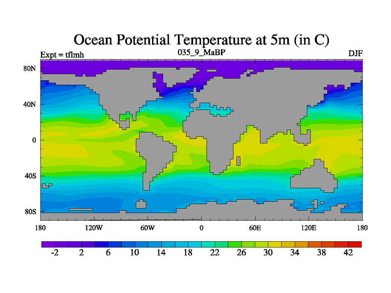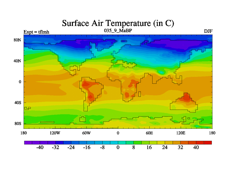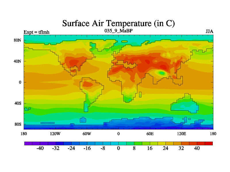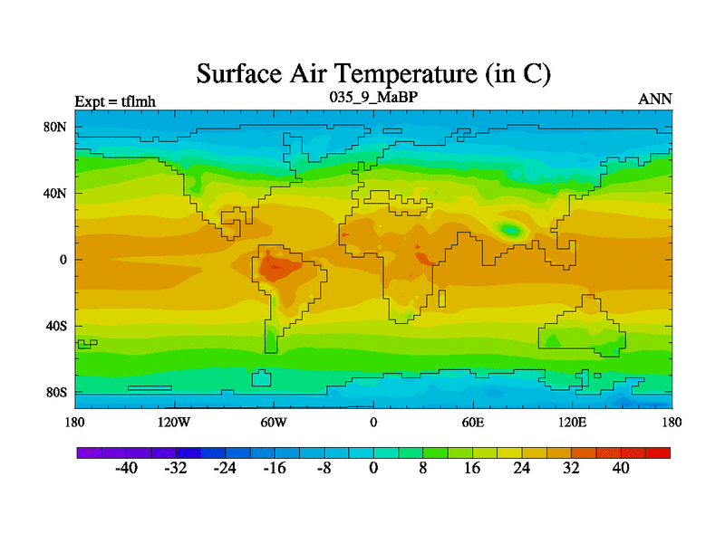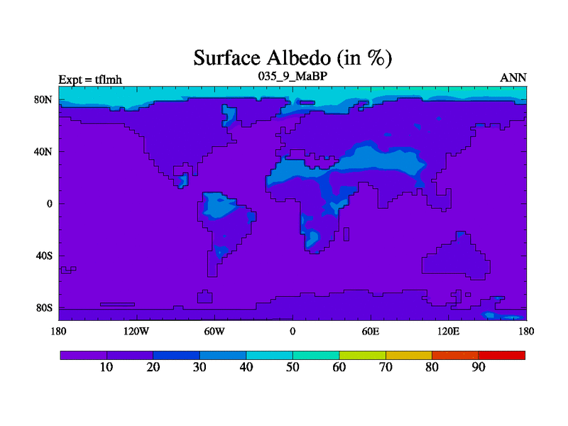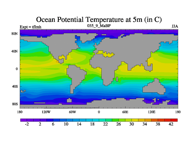 This is the 35.9 Ma simulation using the Scotese palaeogeographies and revised CCN etc. This version has islands and smoothing and desert albedo included. Tuned CO2 to give Scotese temperatures. Started from end of tfksh. With JEDI output.
