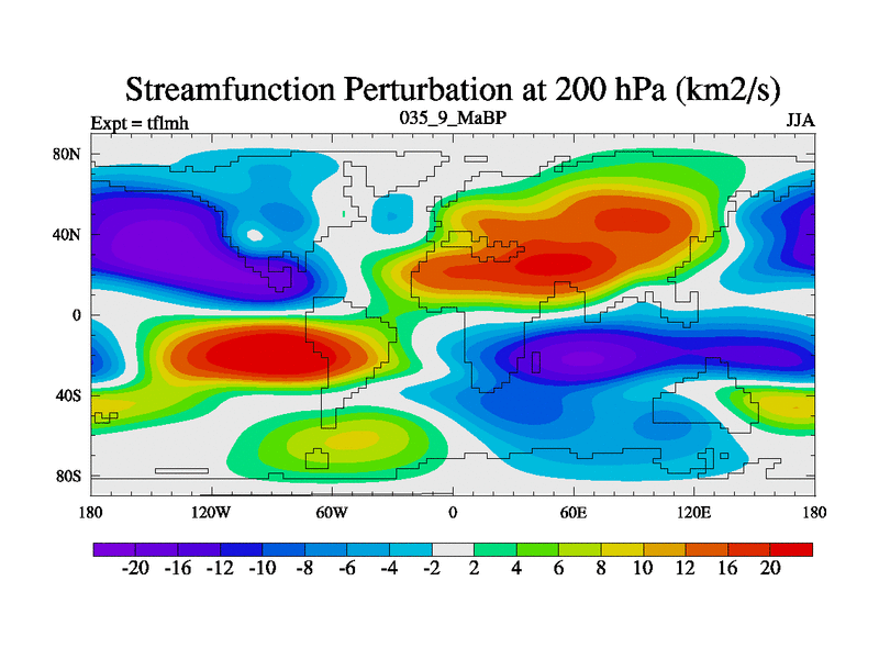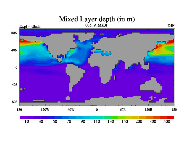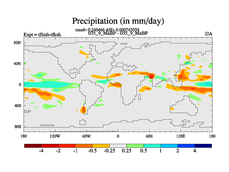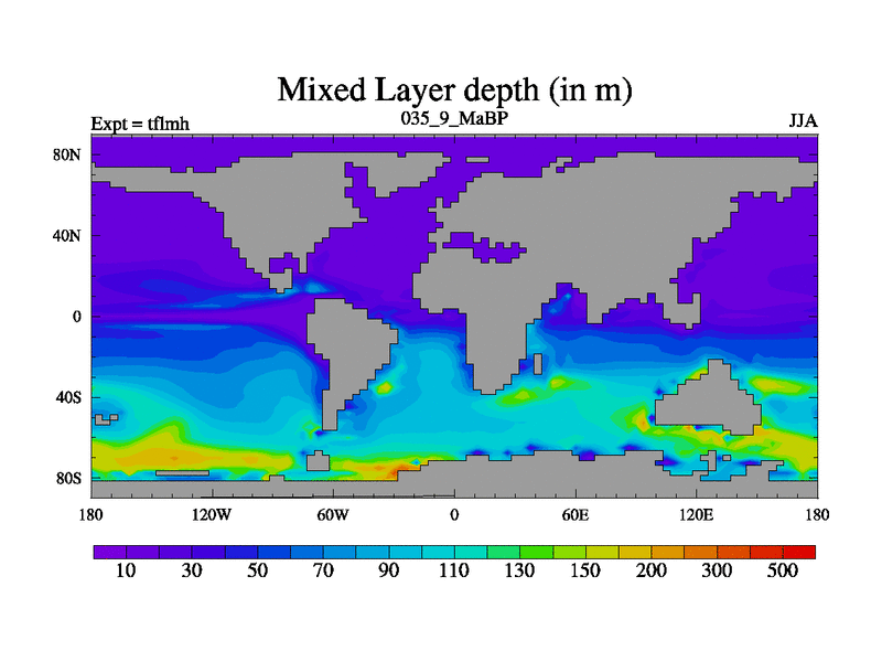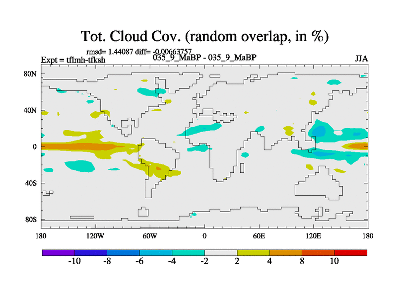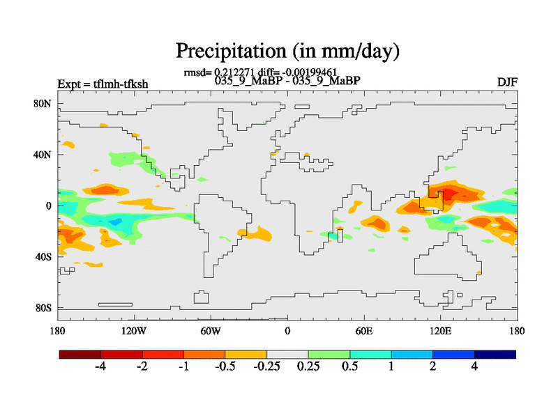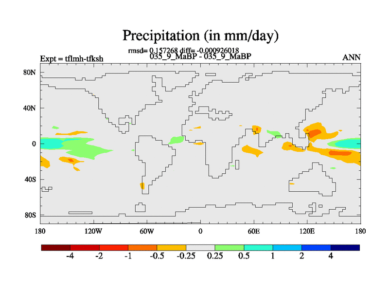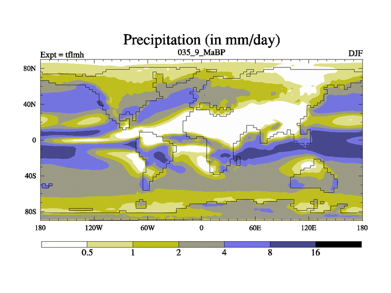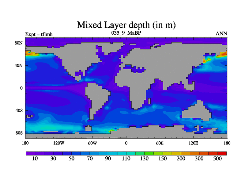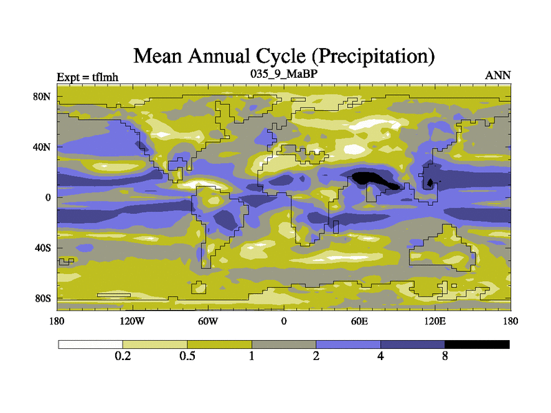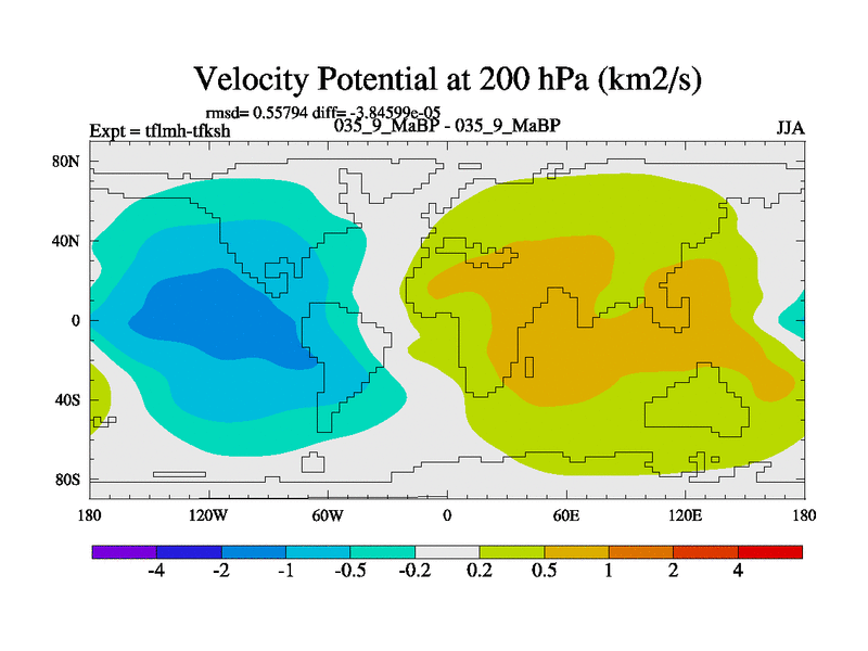 This is the 35.9 Ma simulation using the Scotese palaeogeographies and revised CCN etc. This version has islands and smoothing and desert albedo included. Tuned CO2 to give Scotese temperatures. Started from end of tfksh. With JEDI output.