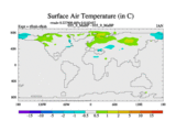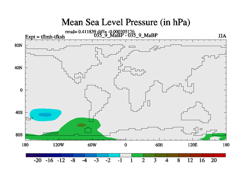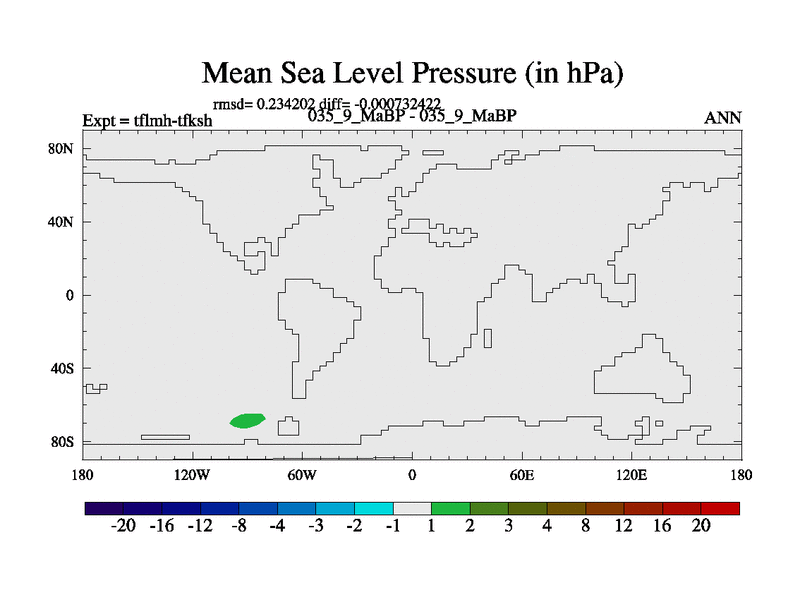 Scientifically as benchmark except using water age update, dark respiration, salinity conservation and revised ozone. Also using new orbital and solar update, and outputting leaf CO2. This version has islands included and atmospheric smoothing and desert albedo. Tuned CO2 to give Scotese temperatures. Started from end of tfksh. With JEDI output.