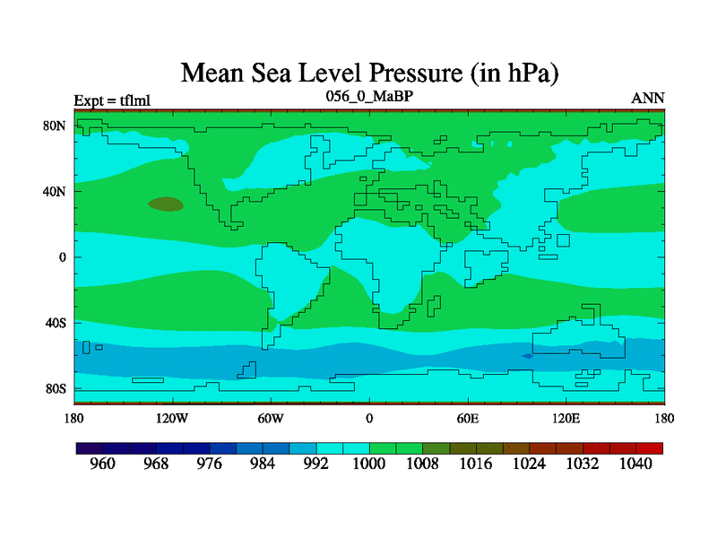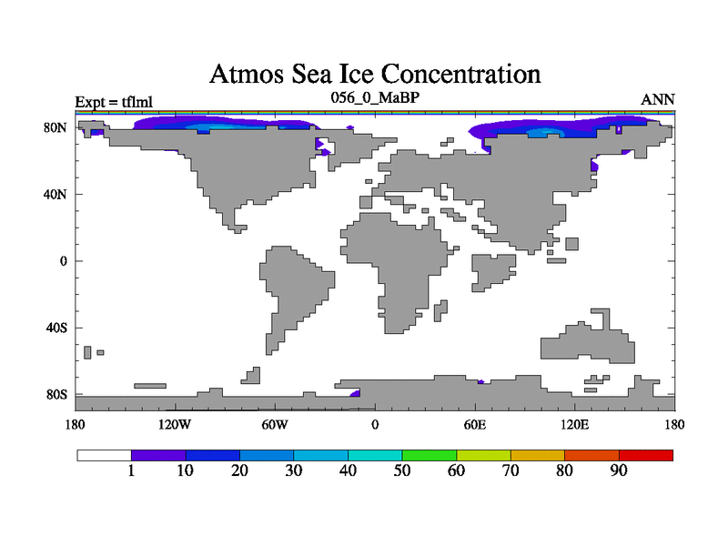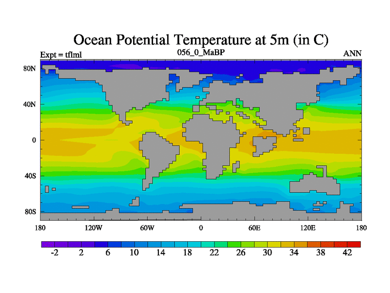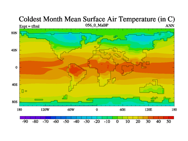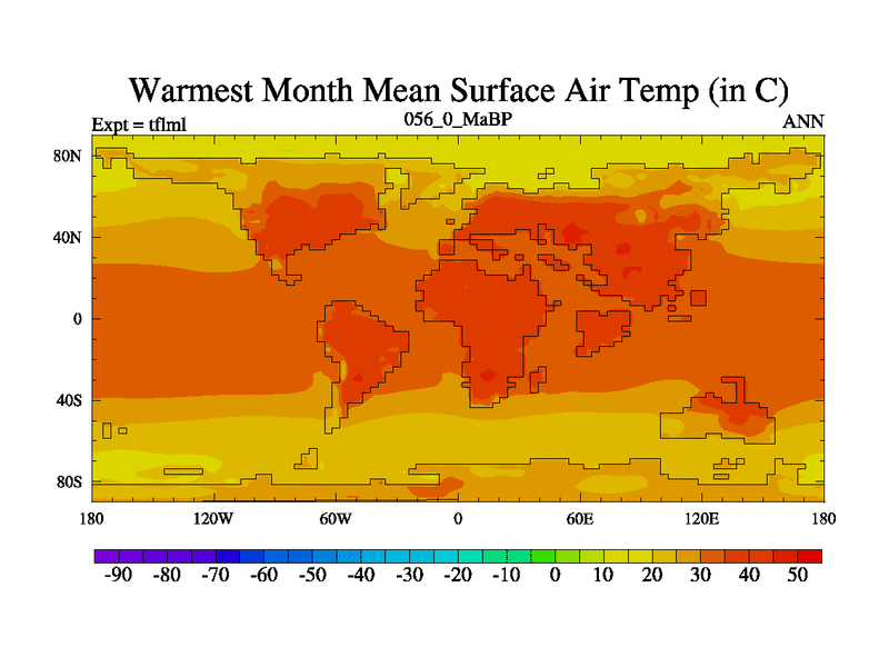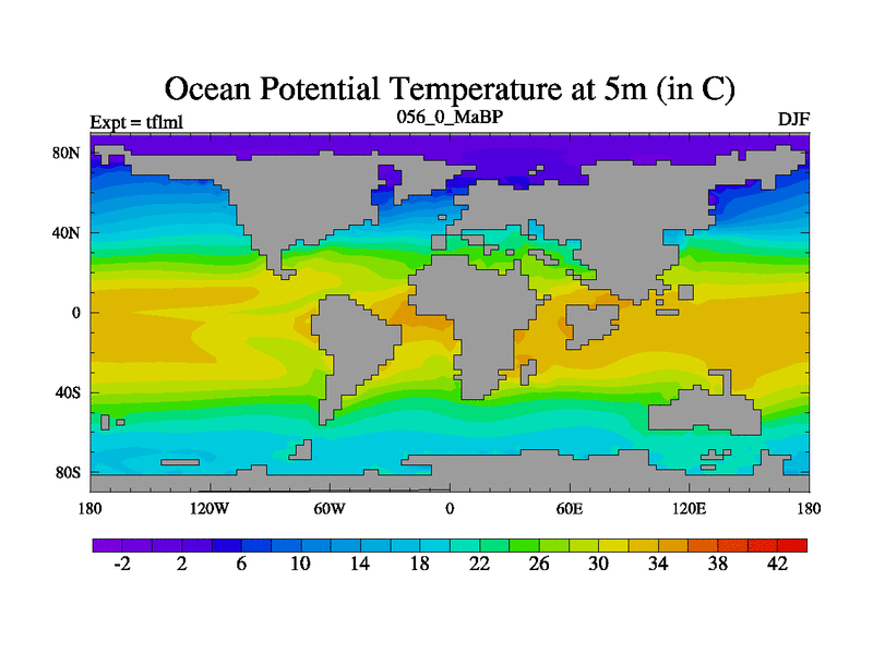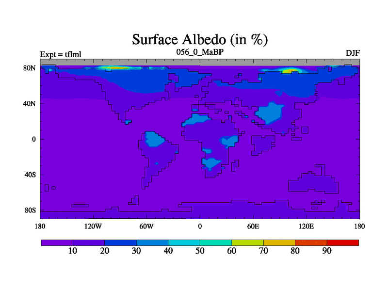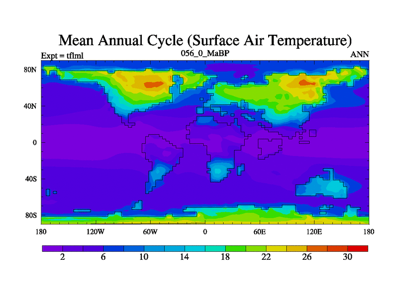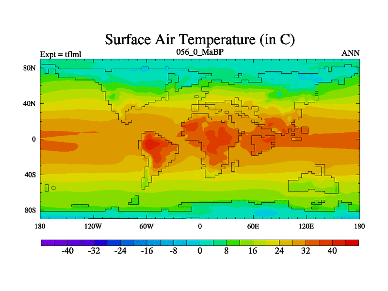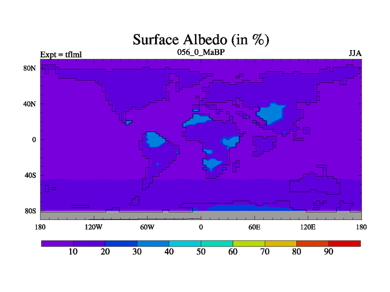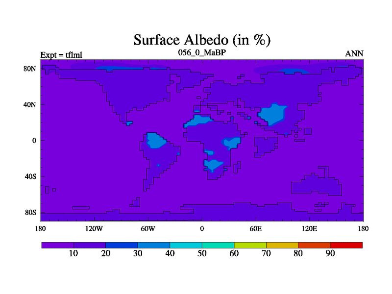 This is the 56.0 Ma simulation using the Scotese palaeogeographies and revised CCN etc. This version has islands and smoothing and desert albedo included. Tuned CO2 to give Scotese temperatures. Started from end of tfksl. With JEDI output.
