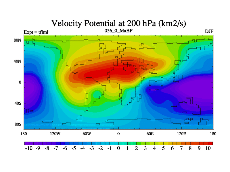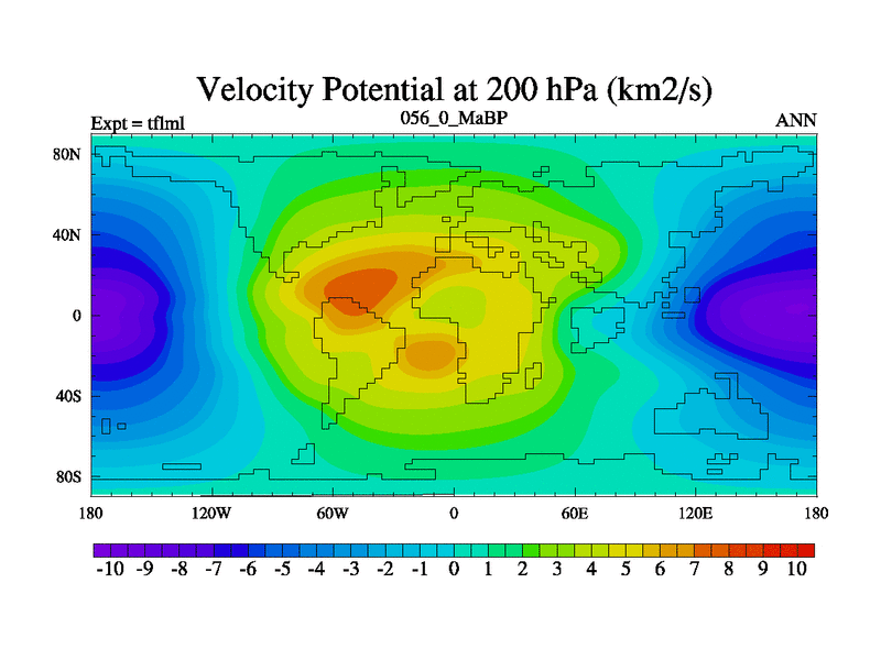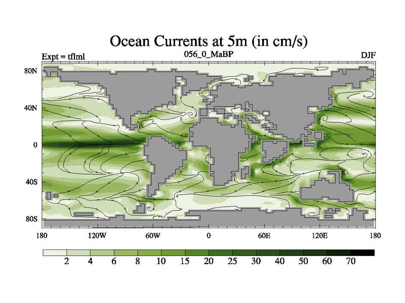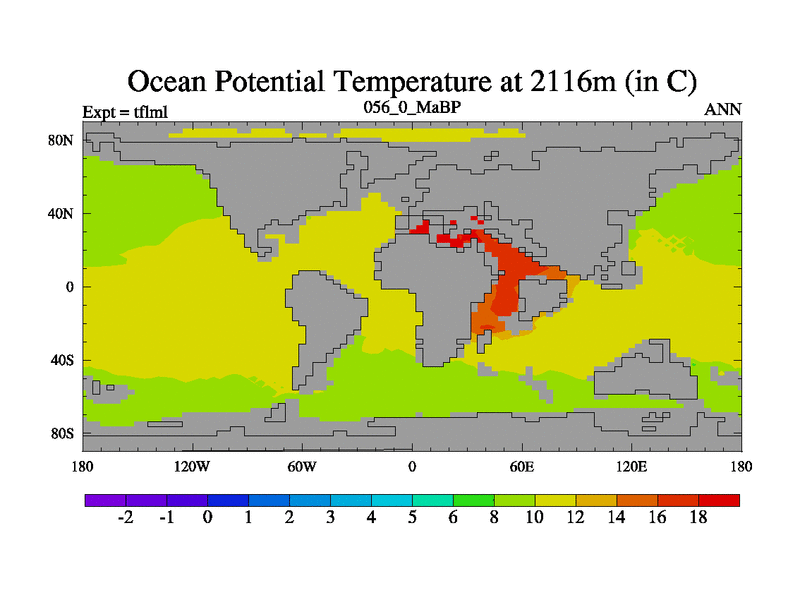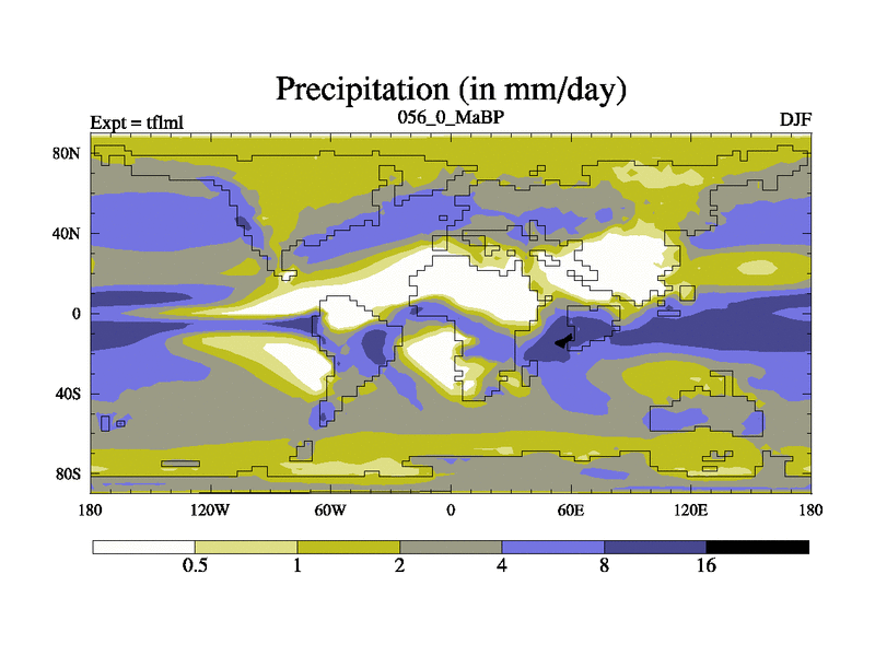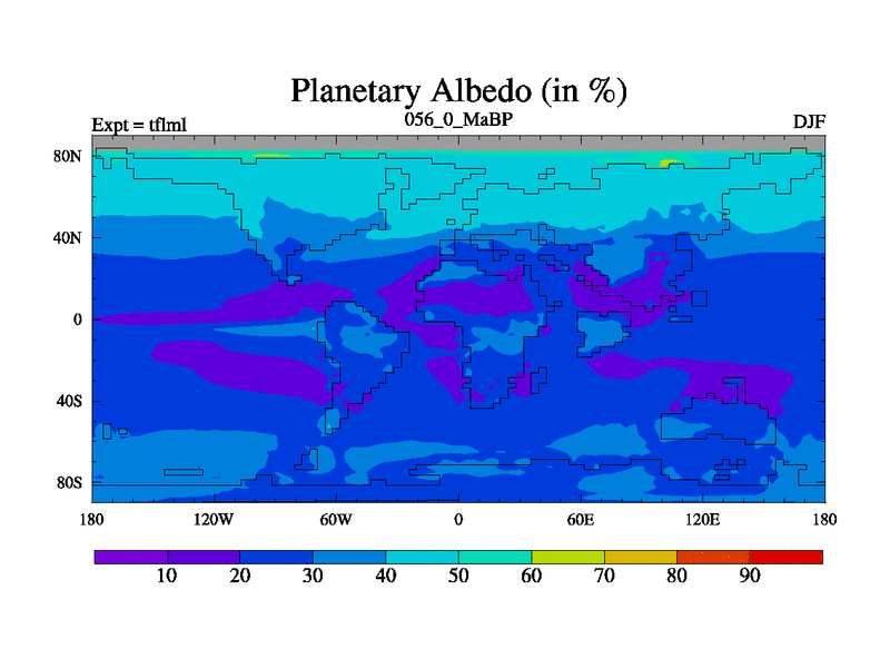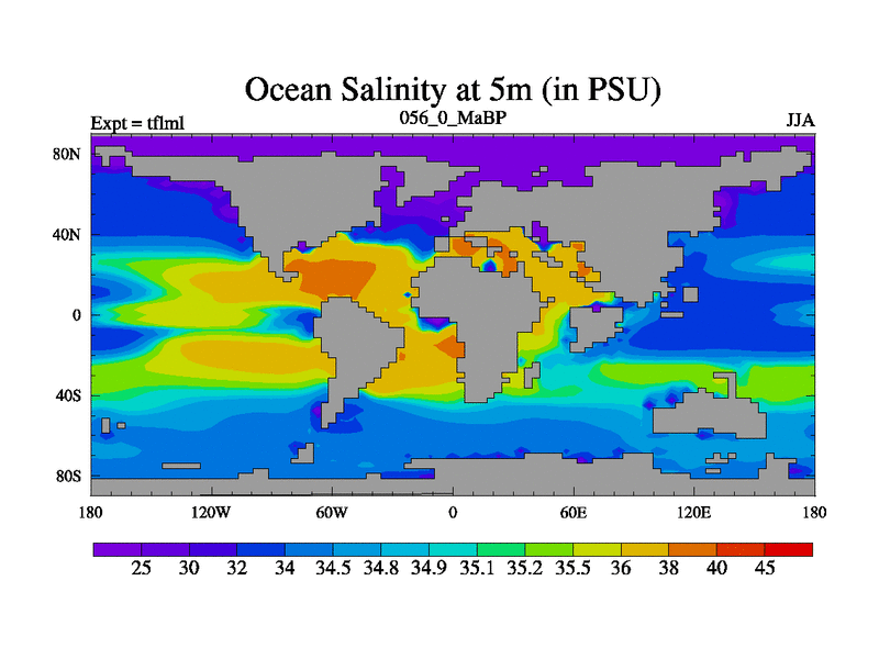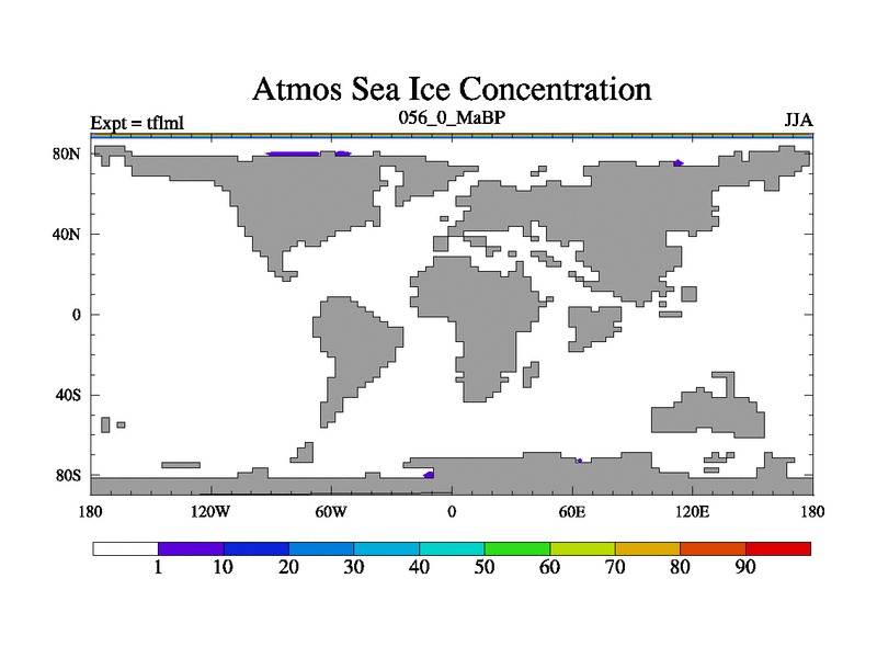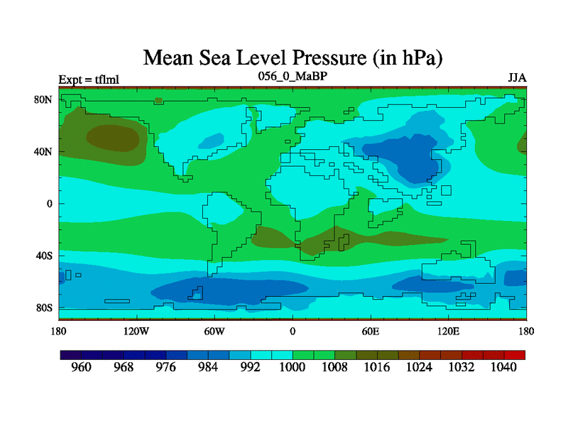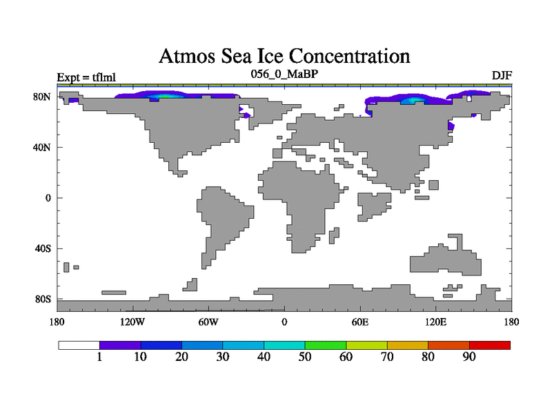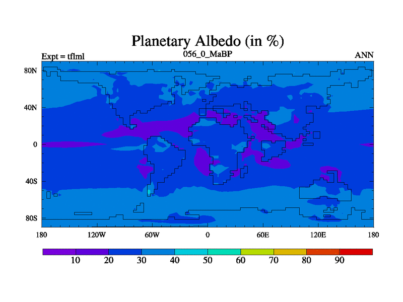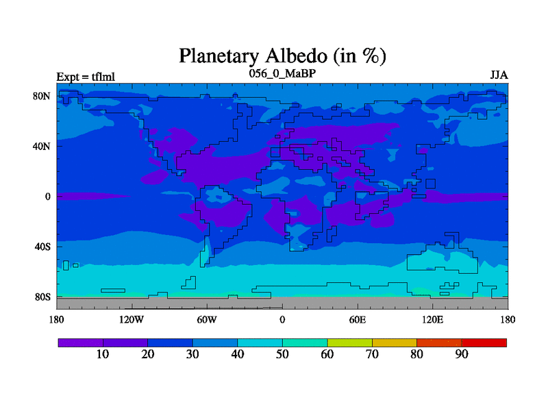 This is the 56.0 Ma simulation using the Scotese palaeogeographies and revised CCN etc. This version has islands and smoothing and desert albedo included. Tuned CO2 to give Scotese temperatures. Started from end of tfksl. With JEDI output.