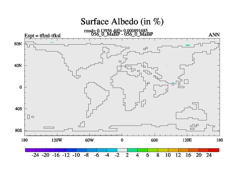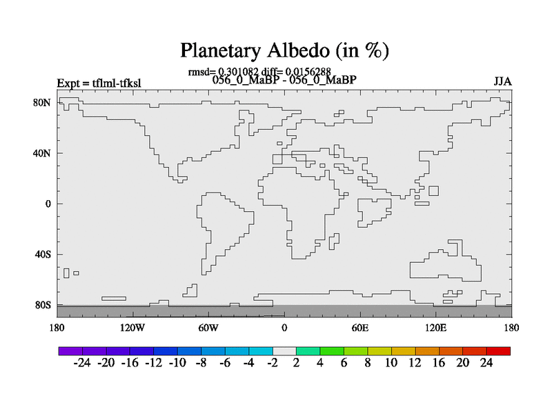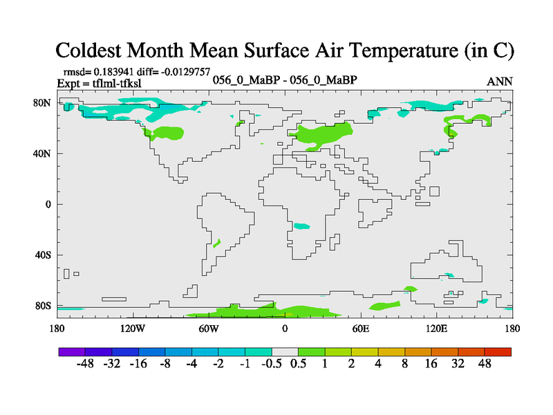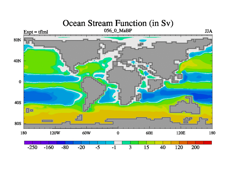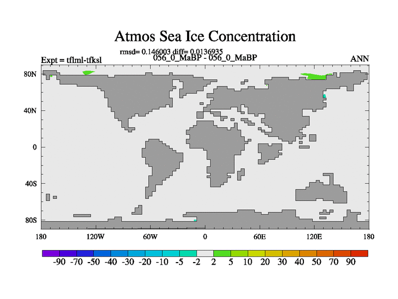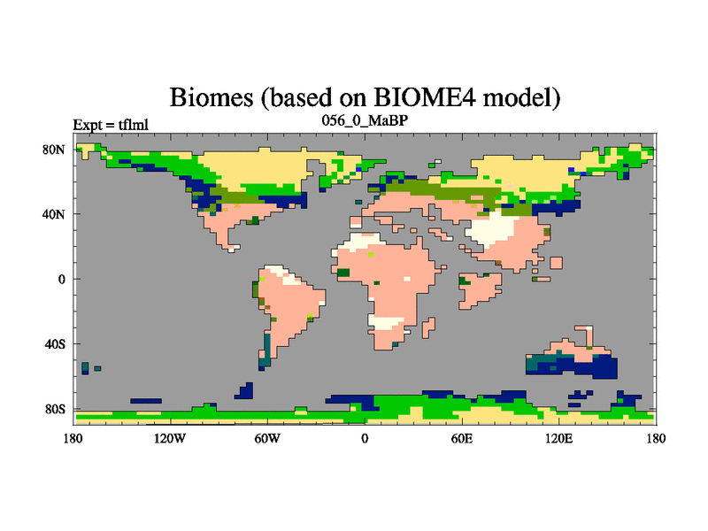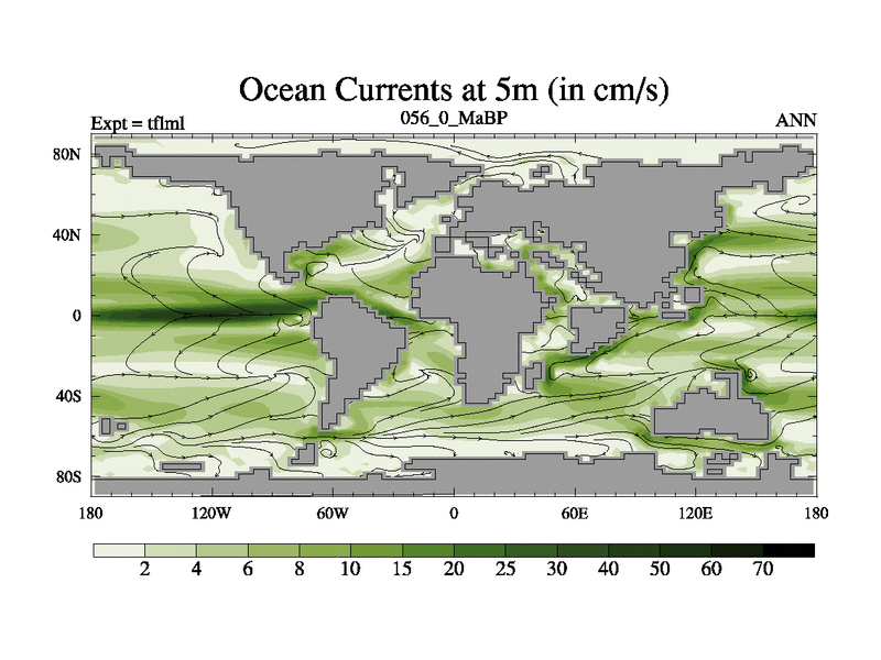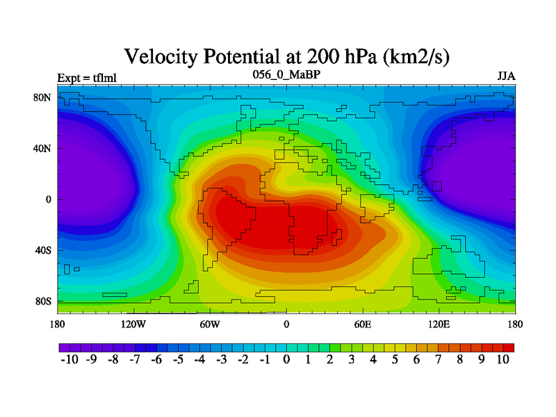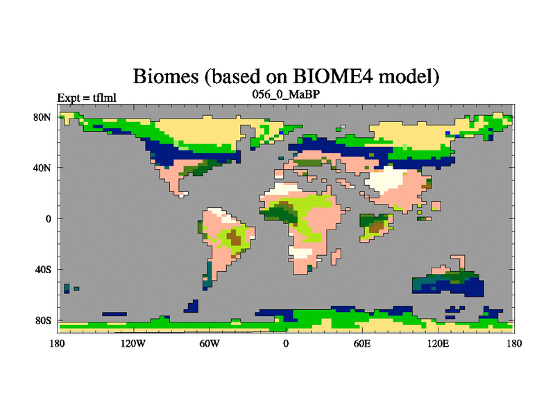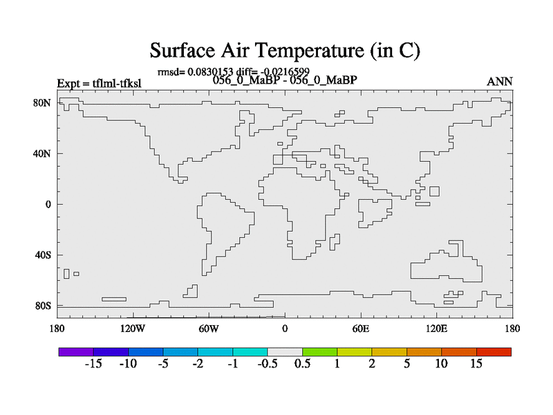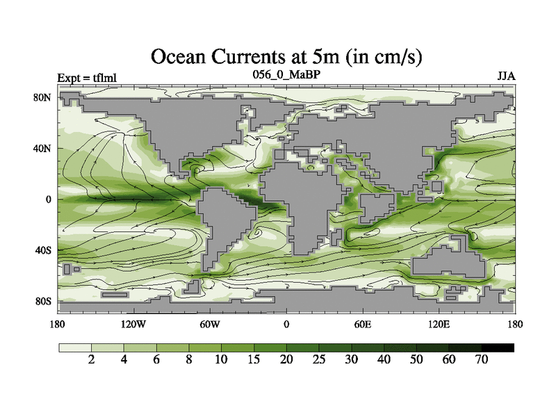 This is the 56.0 Ma simulation using the Scotese palaeogeographies and revised CCN etc. This version has islands and smoothing and desert albedo included. Tuned CO2 to give Scotese temperatures. Started from end of tfksl. With JEDI output.