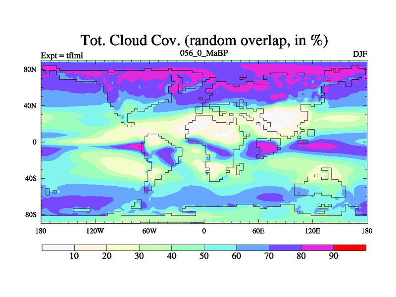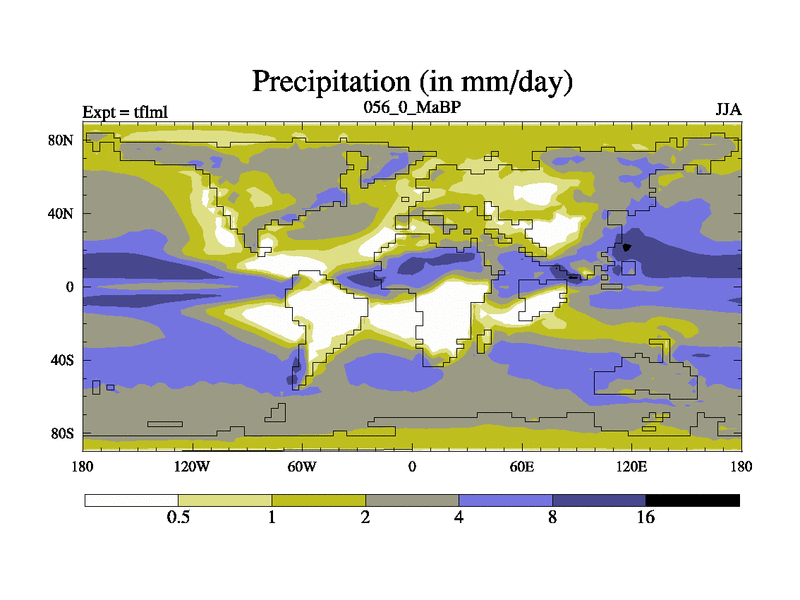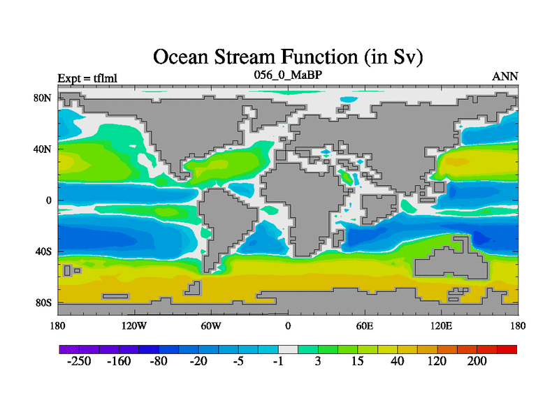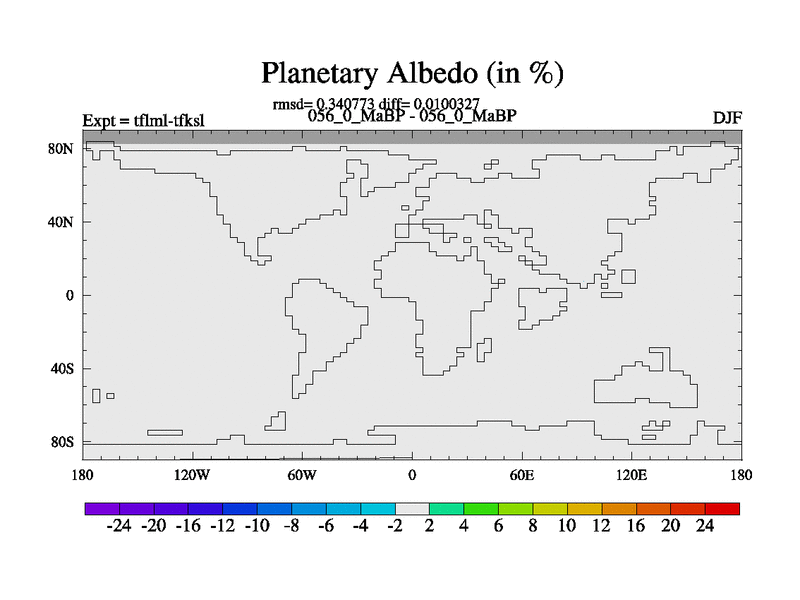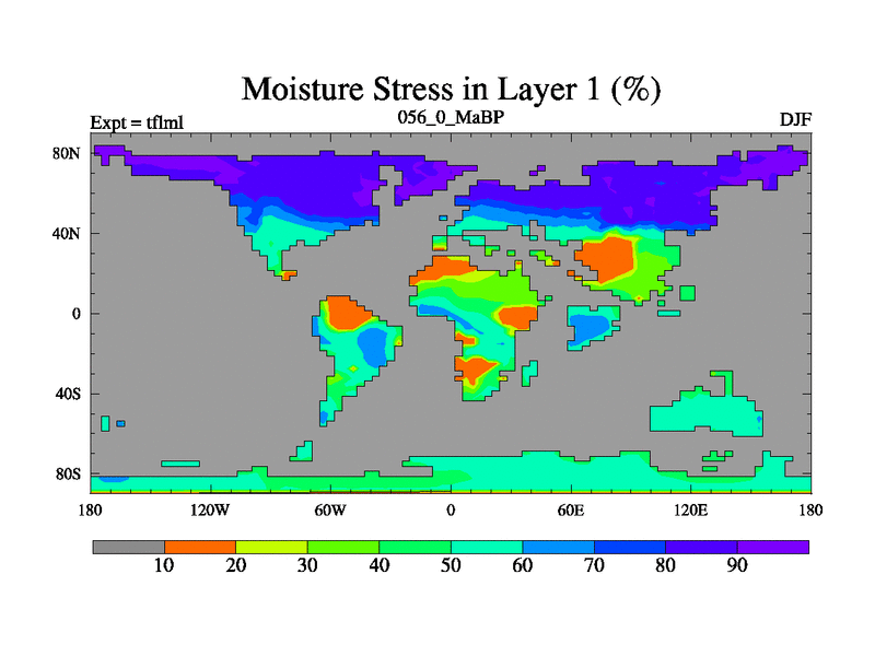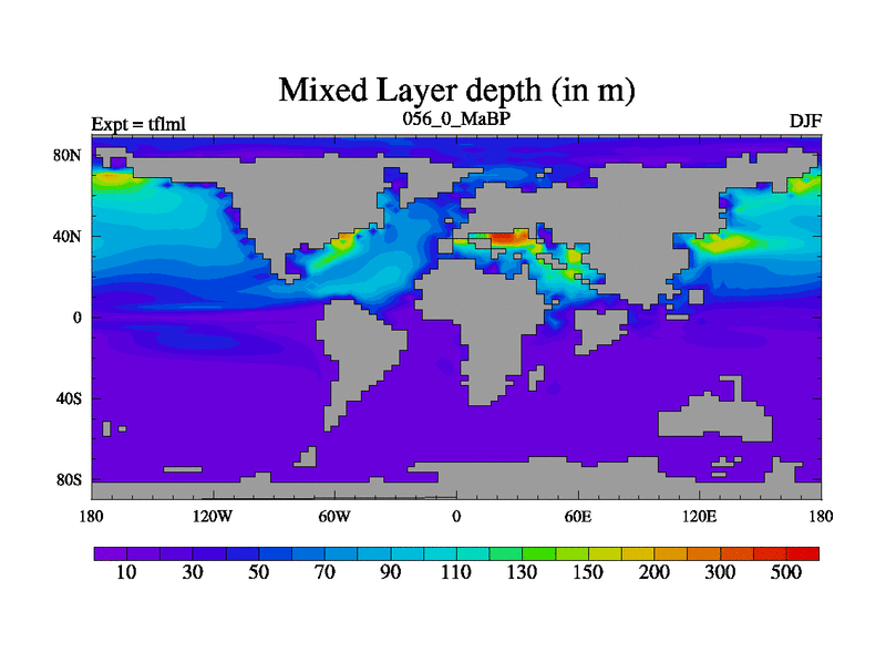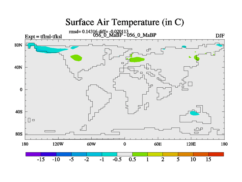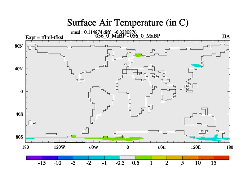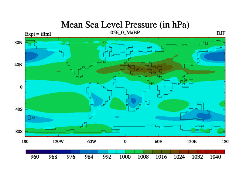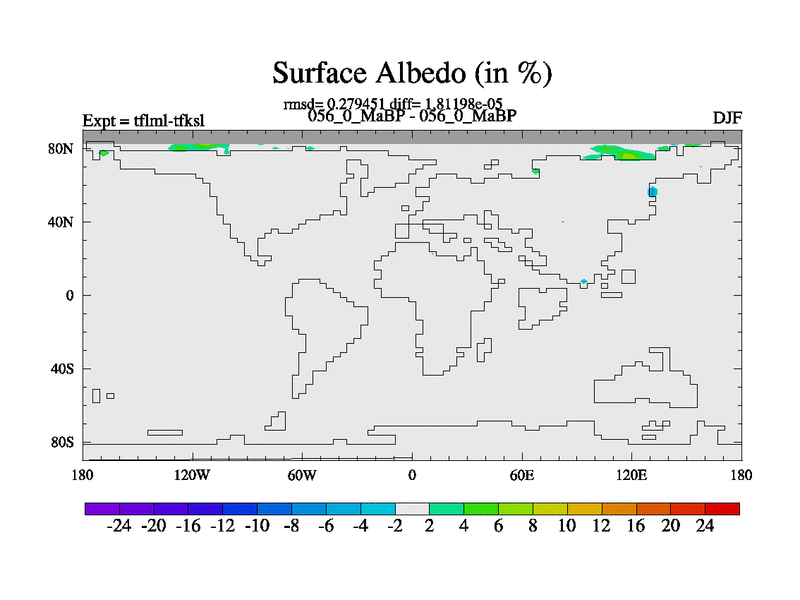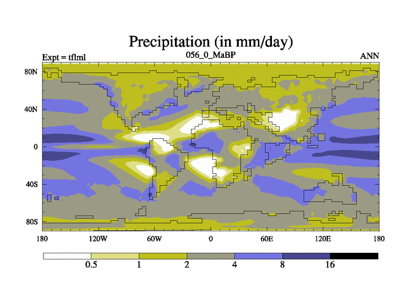 This is the 56.0 Ma simulation using the Scotese palaeogeographies and revised CCN etc. This version has islands and smoothing and desert albedo included. Tuned CO2 to give Scotese temperatures. Started from end of tfksl. With JEDI output.