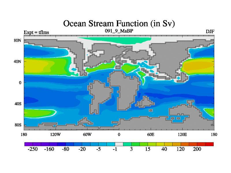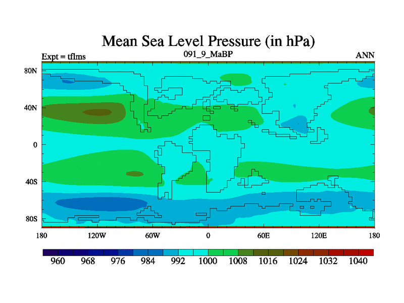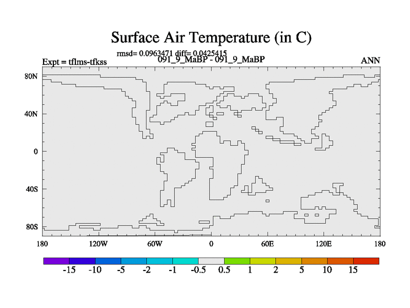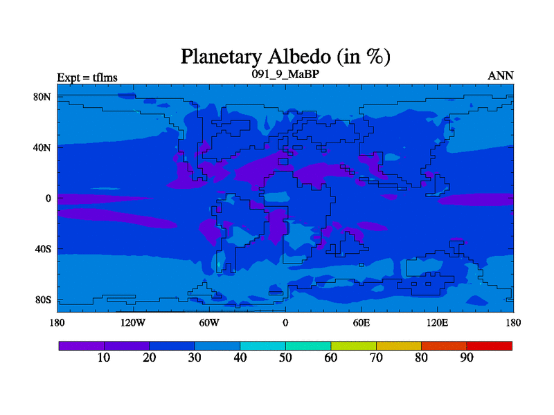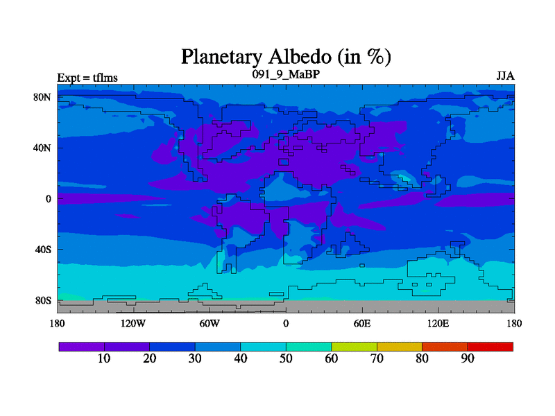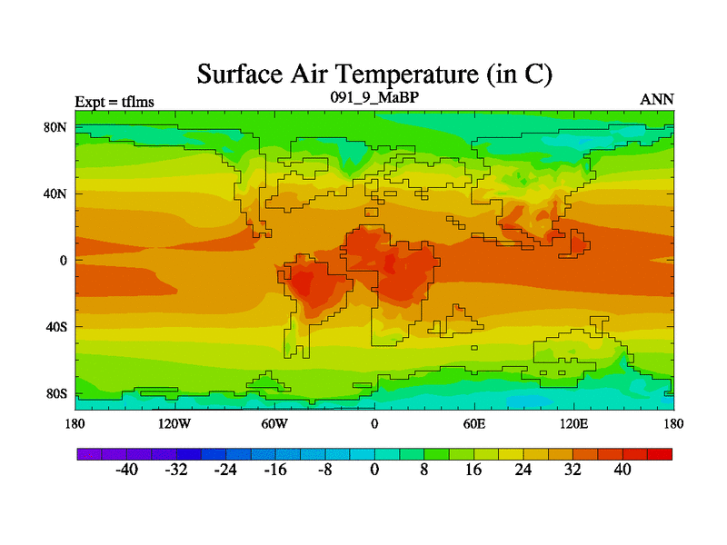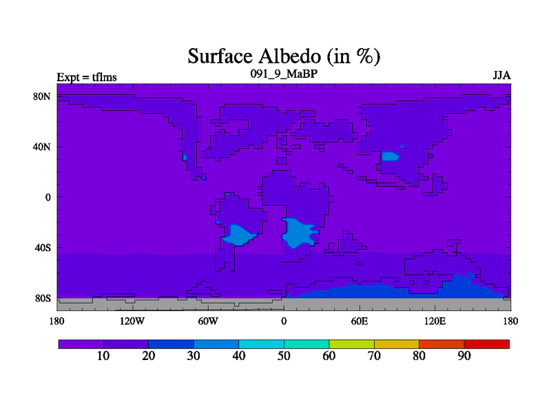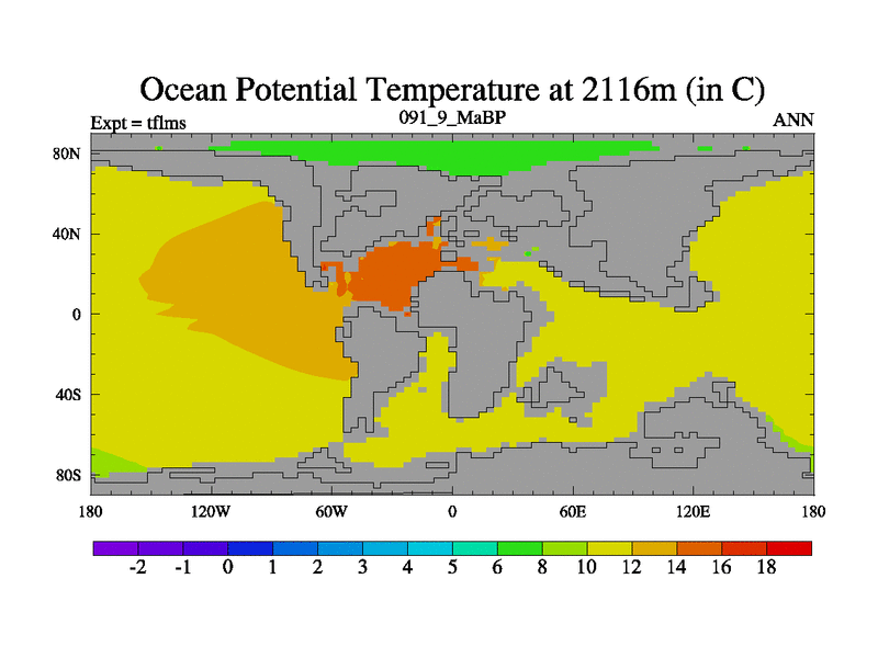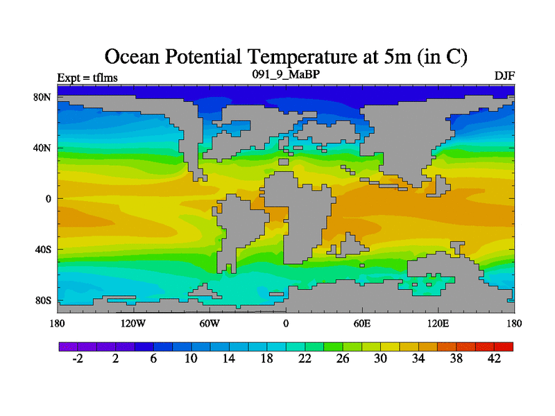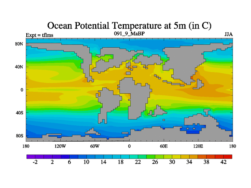 This is the 91.9 Ma simulation using the Scotese palaeogeographies and revised CCN etc. This version has islands and smoothing and desert albedo included. Tuned CO2 to give Scotese temperatures. Started from end of tfkss. With JEDI output.