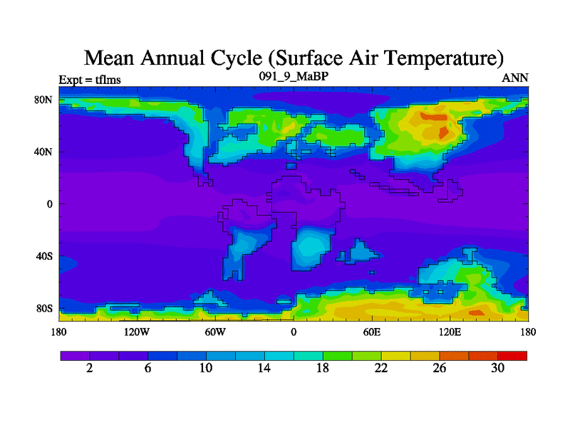 Scientifically as benchmark except using water age update, dark respiration, salinity conservation and revised ozone. Also using new orbital and solar update, and outputting leaf CO2. This version has islands included and atmospheric smoothing and desert albedo. Tuned CO2 to give Scotese temperatures. Started from end of tfkss. With JEDI output.
